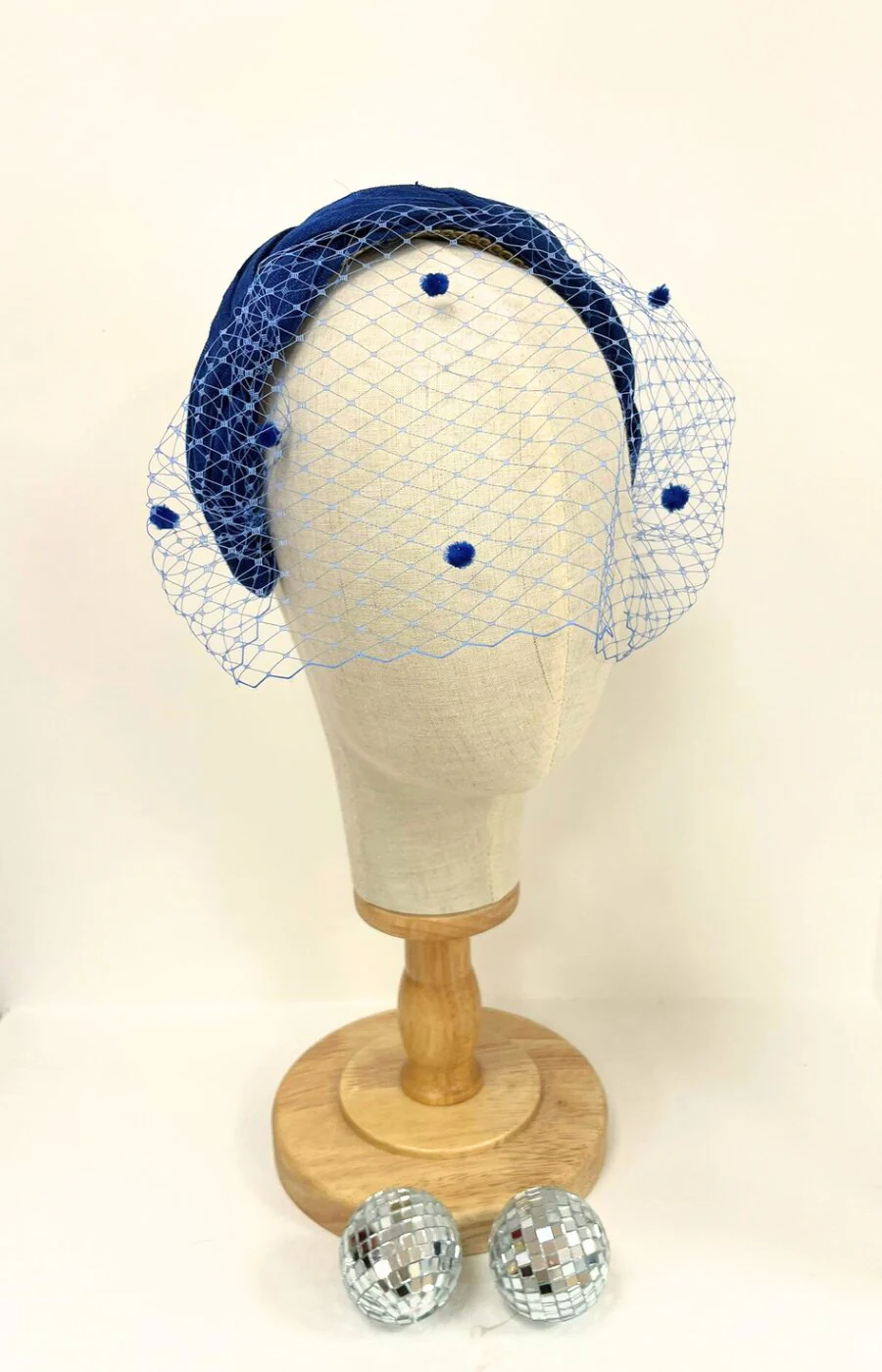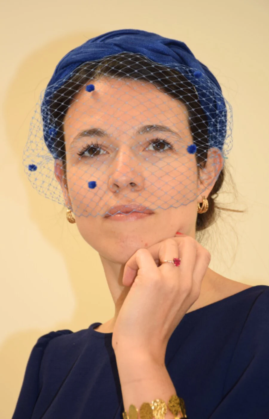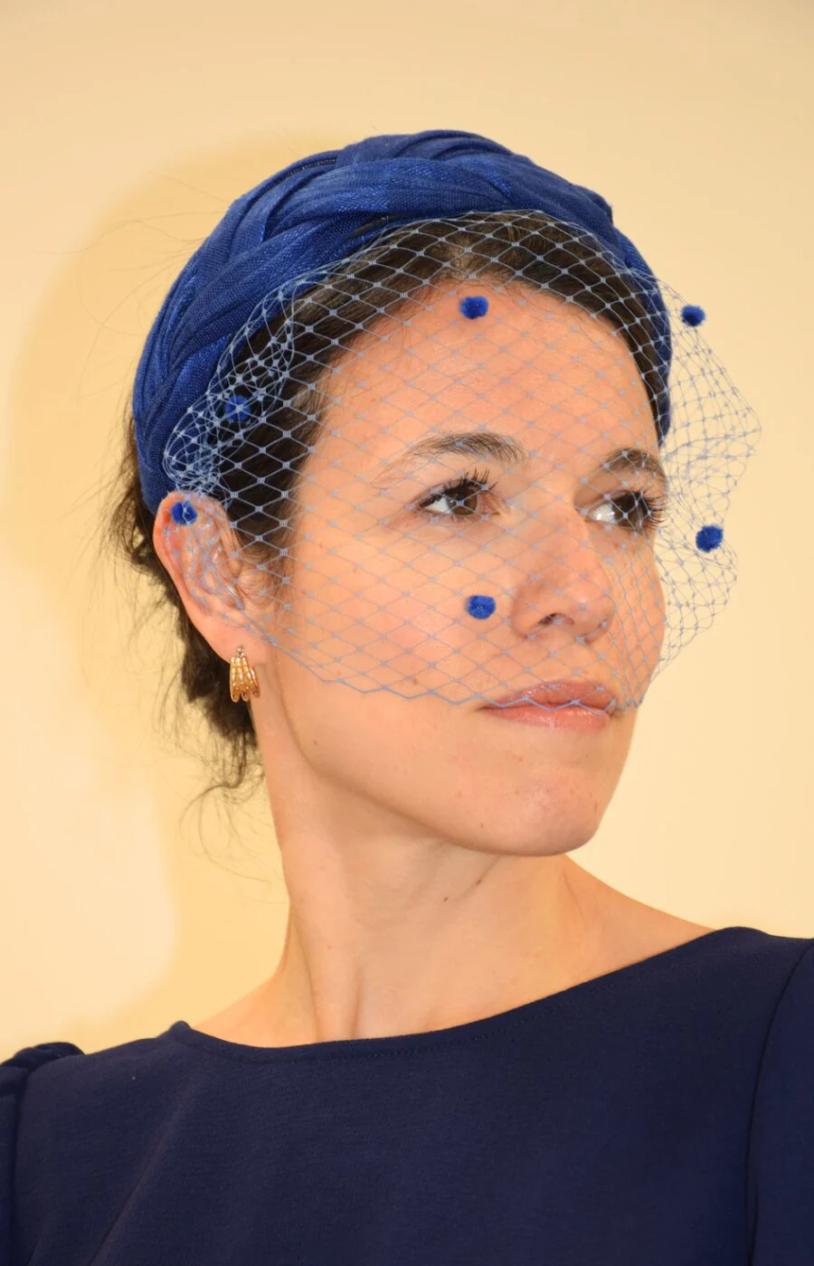 Une voilette bleu marine ornée de pompons pour un regard mystérieux et une allure élégante !
