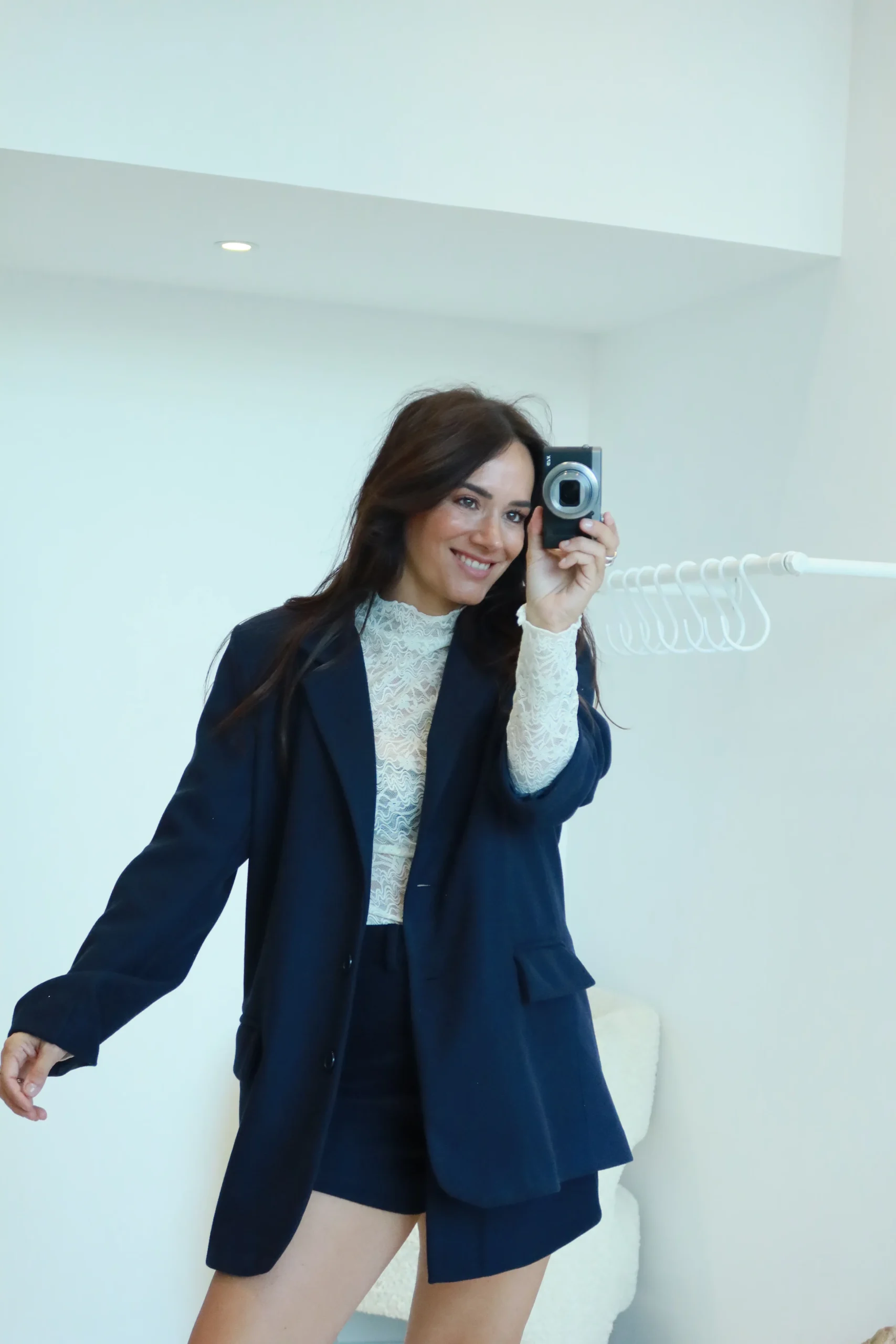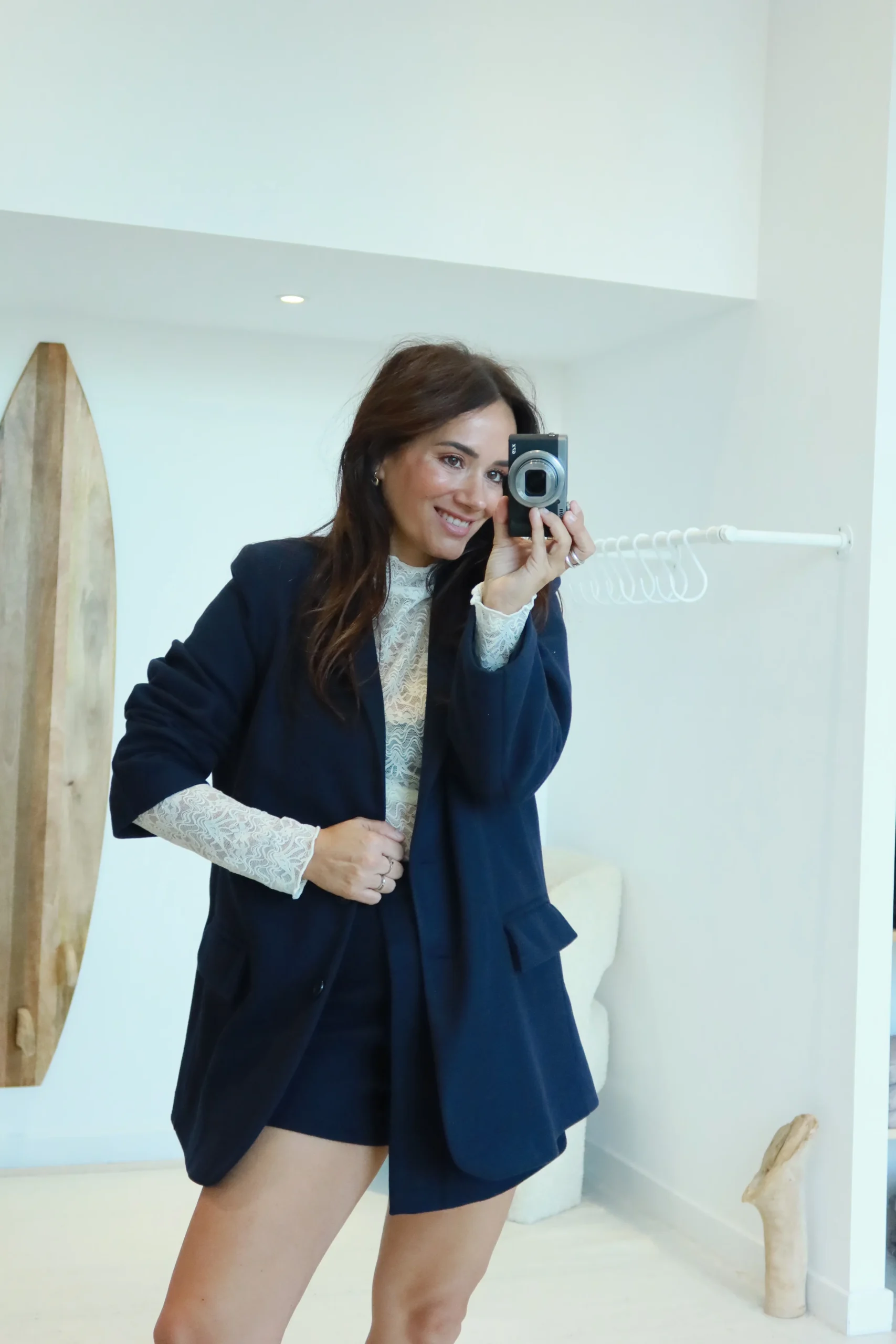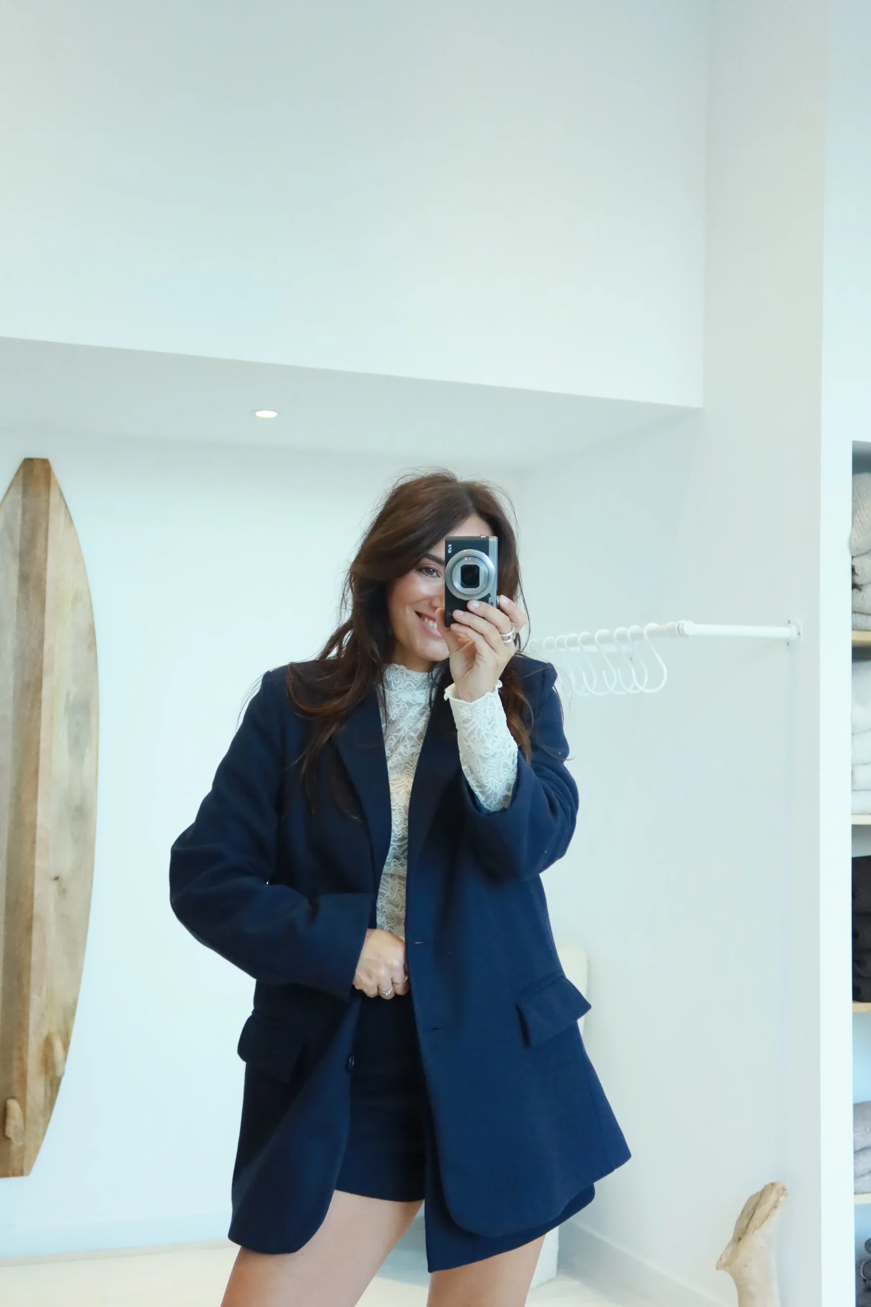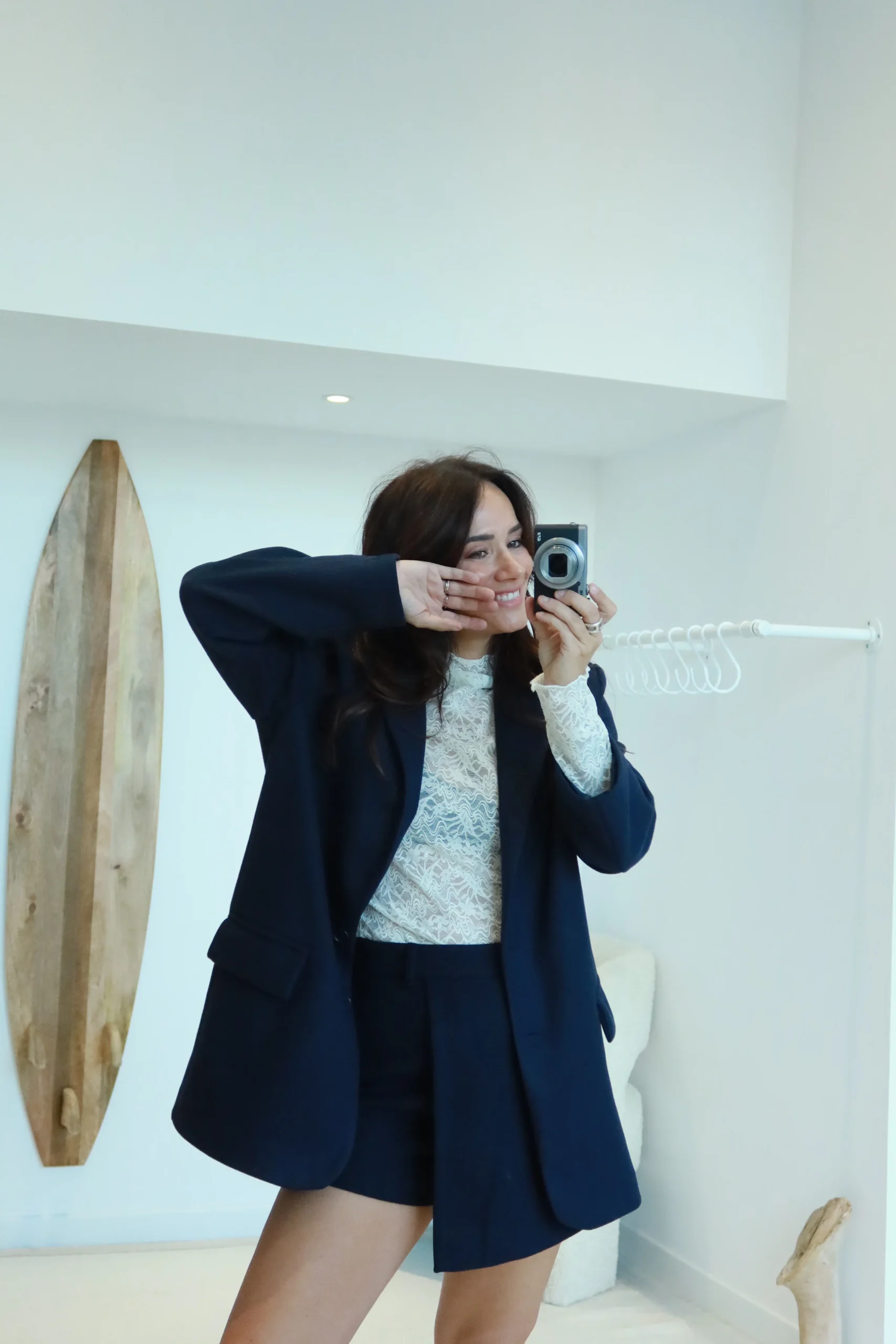 Veste blazer Avec : Top Aria Écru et Jupe-short Luna Couleur : Bleu Marine Effet polaire Col à revers Oversize ++ Long ++ Manches longues Fermeture par 2 boutons 2 poches à rabats aux hanches Pièce élégante Fabrication italienne Taille unique du 34 au 42 Sophie mesure 1m60 Composition et entretien : Composition : 95% […]