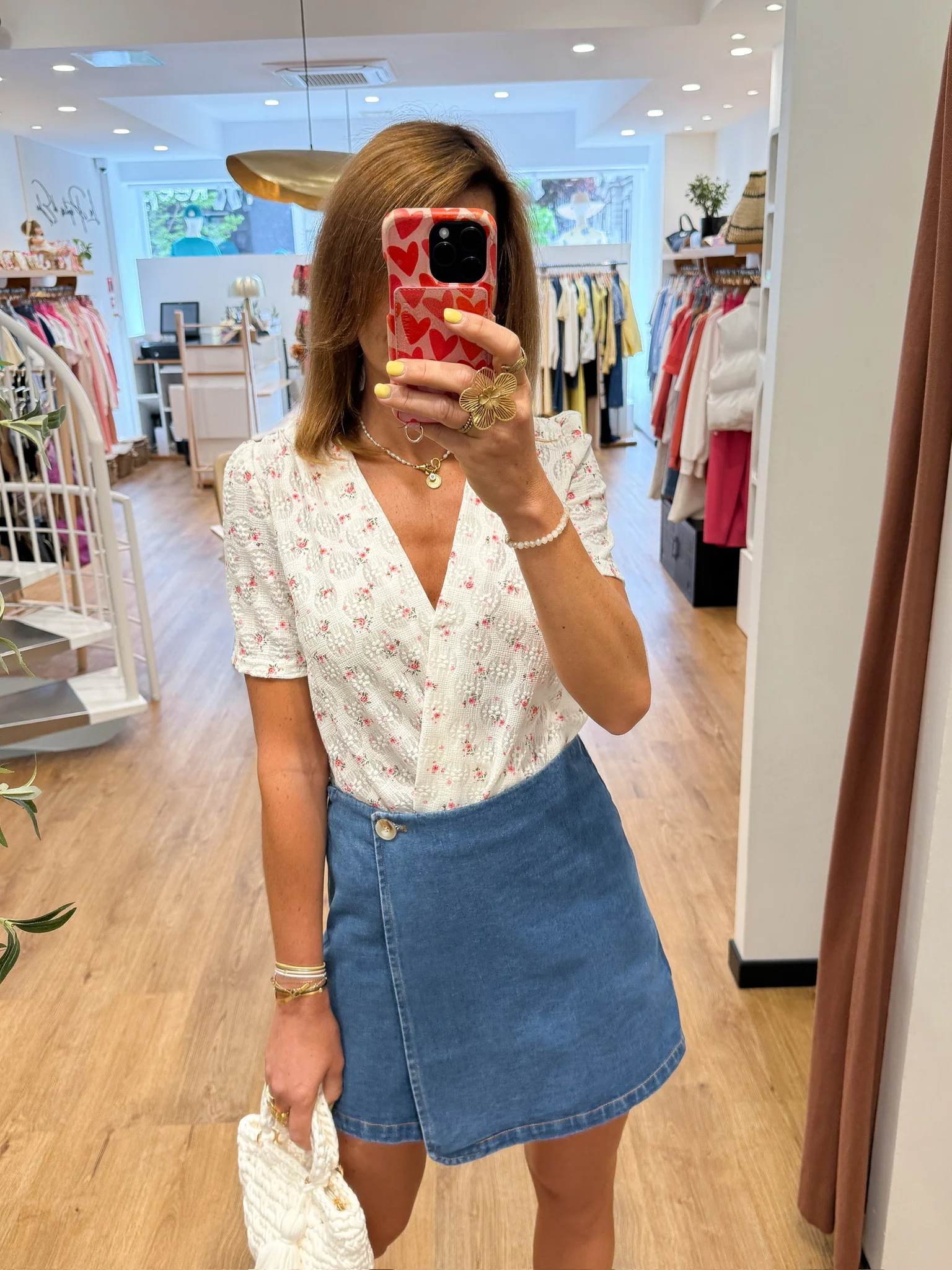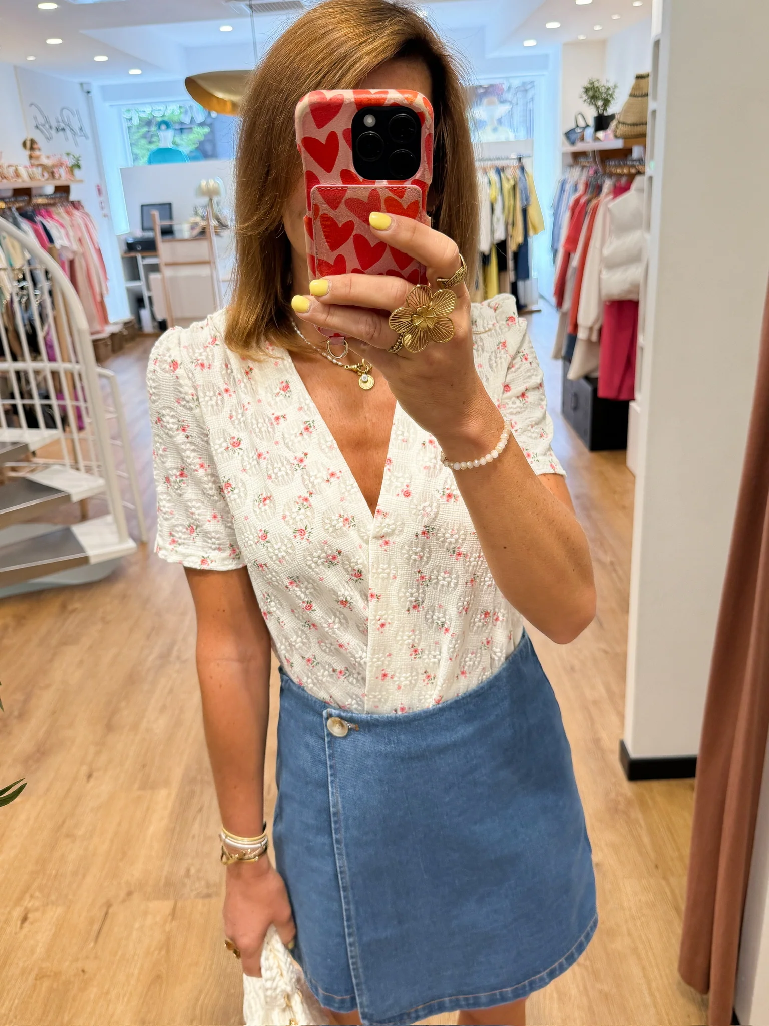 Composition: 100% polyester Bouton pression sur le devant Manches courtes Motifs fleurs rose Le modèle porte une taille SM et mesure 169cm