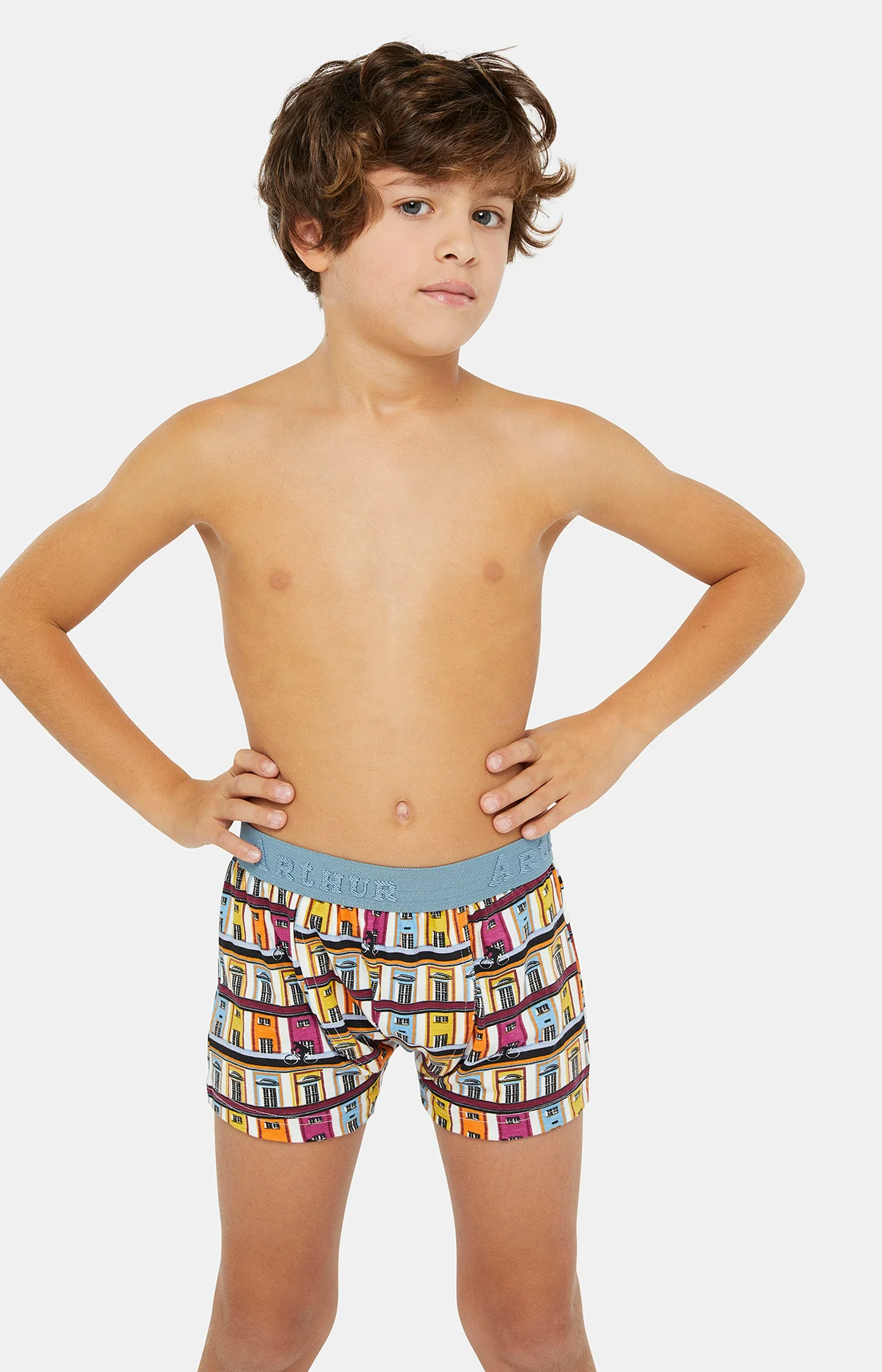 – boxer enfant imprimé en coton – Bande élastiquée siglée Arthur – Coutures plates pour limiter les frottements et irritations – Dessin exclusif créé à Paris – Confectionné dans nos ateliers partenaires en Inde