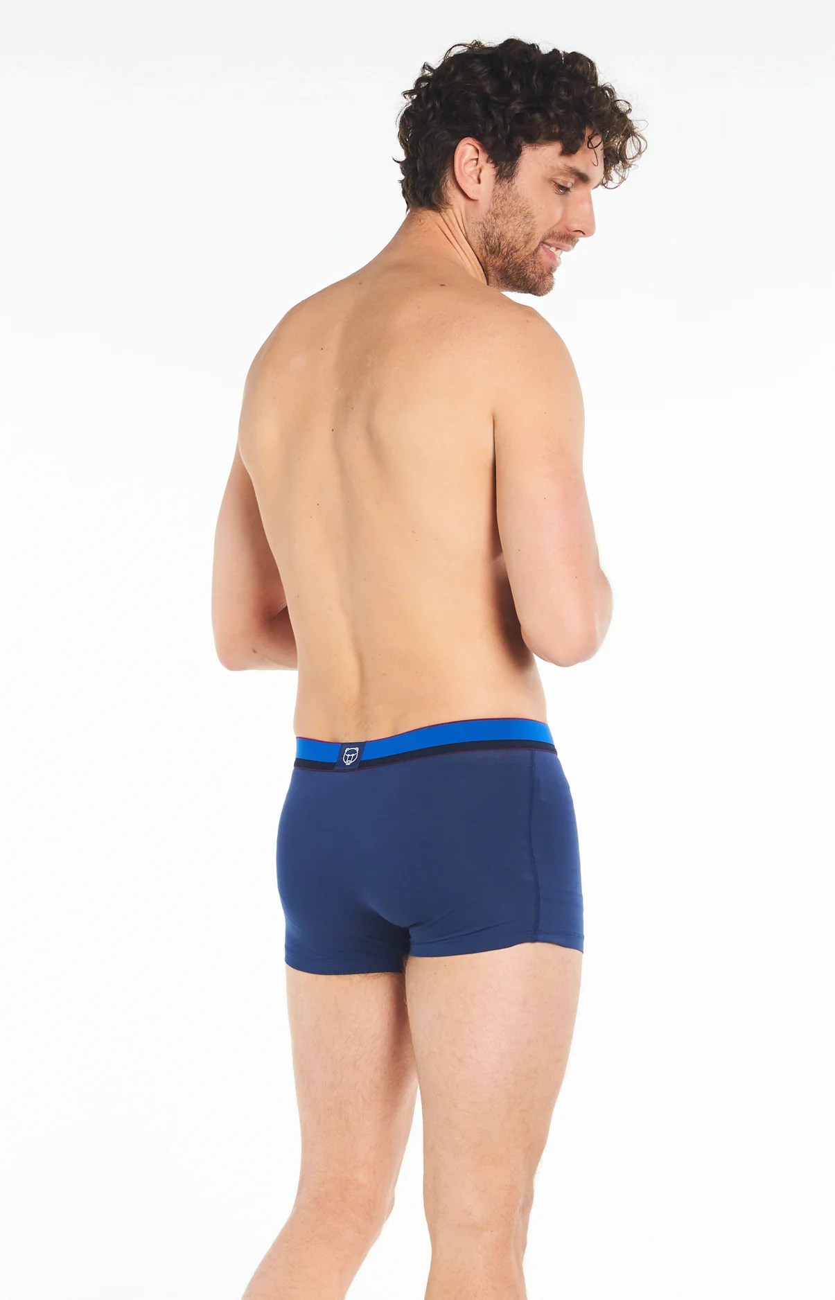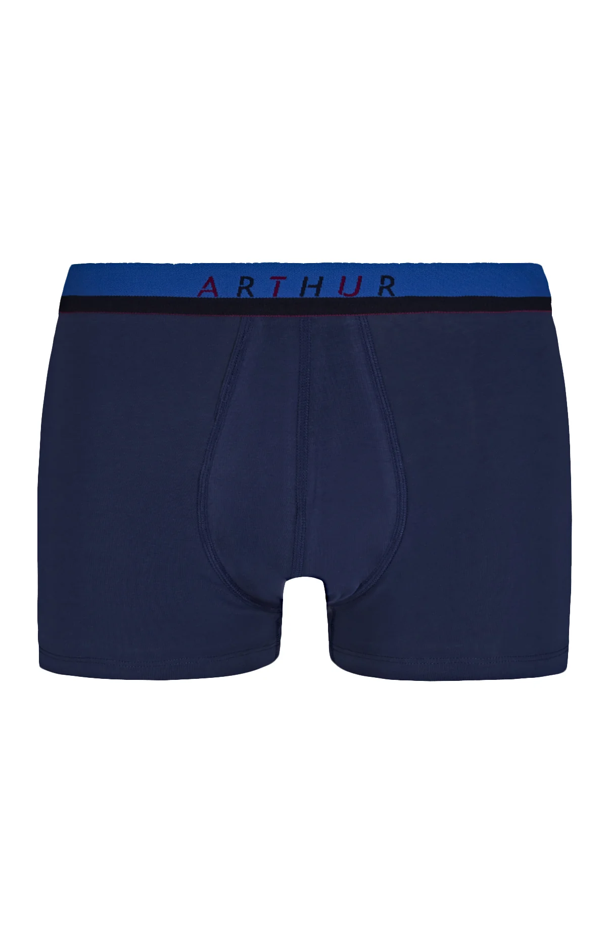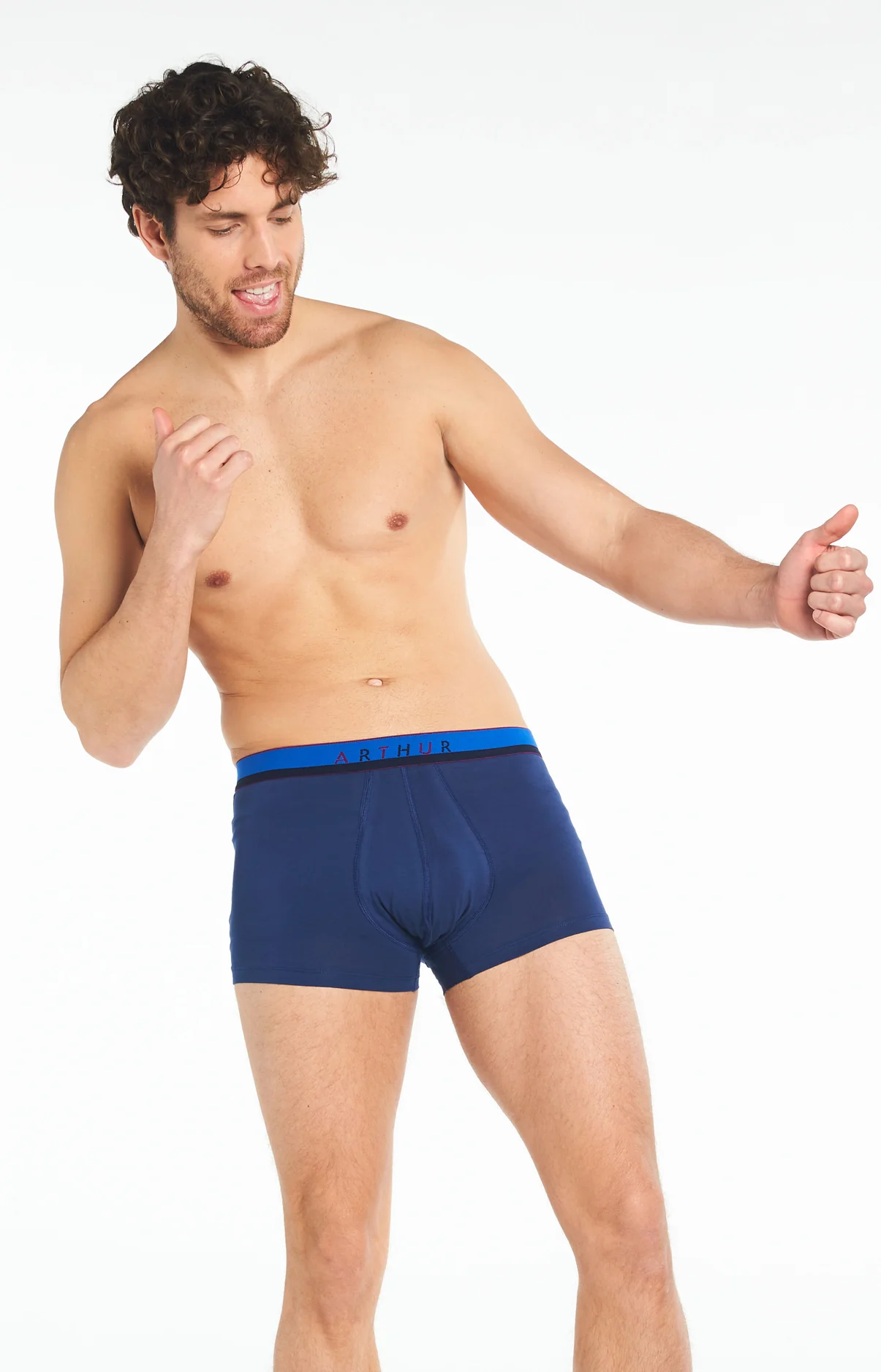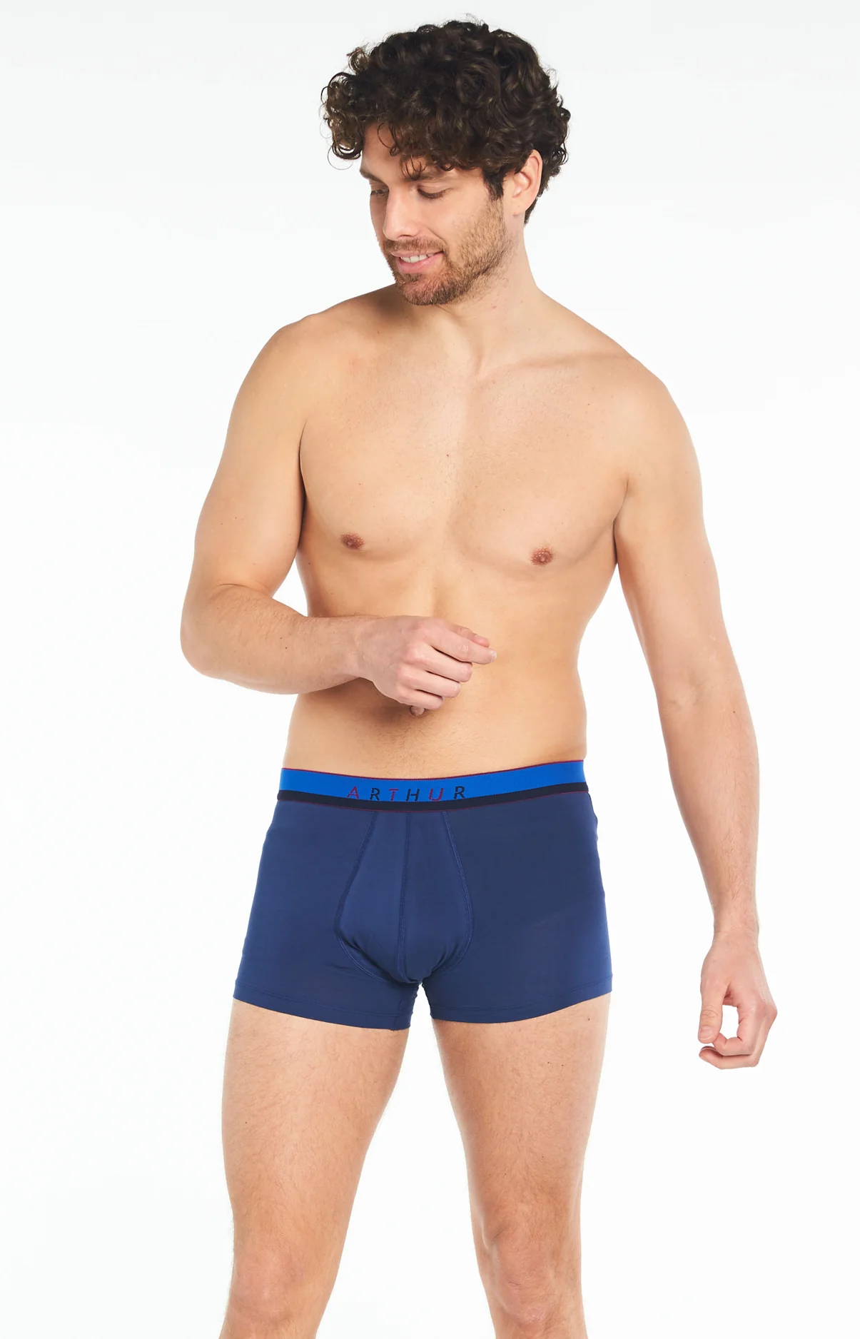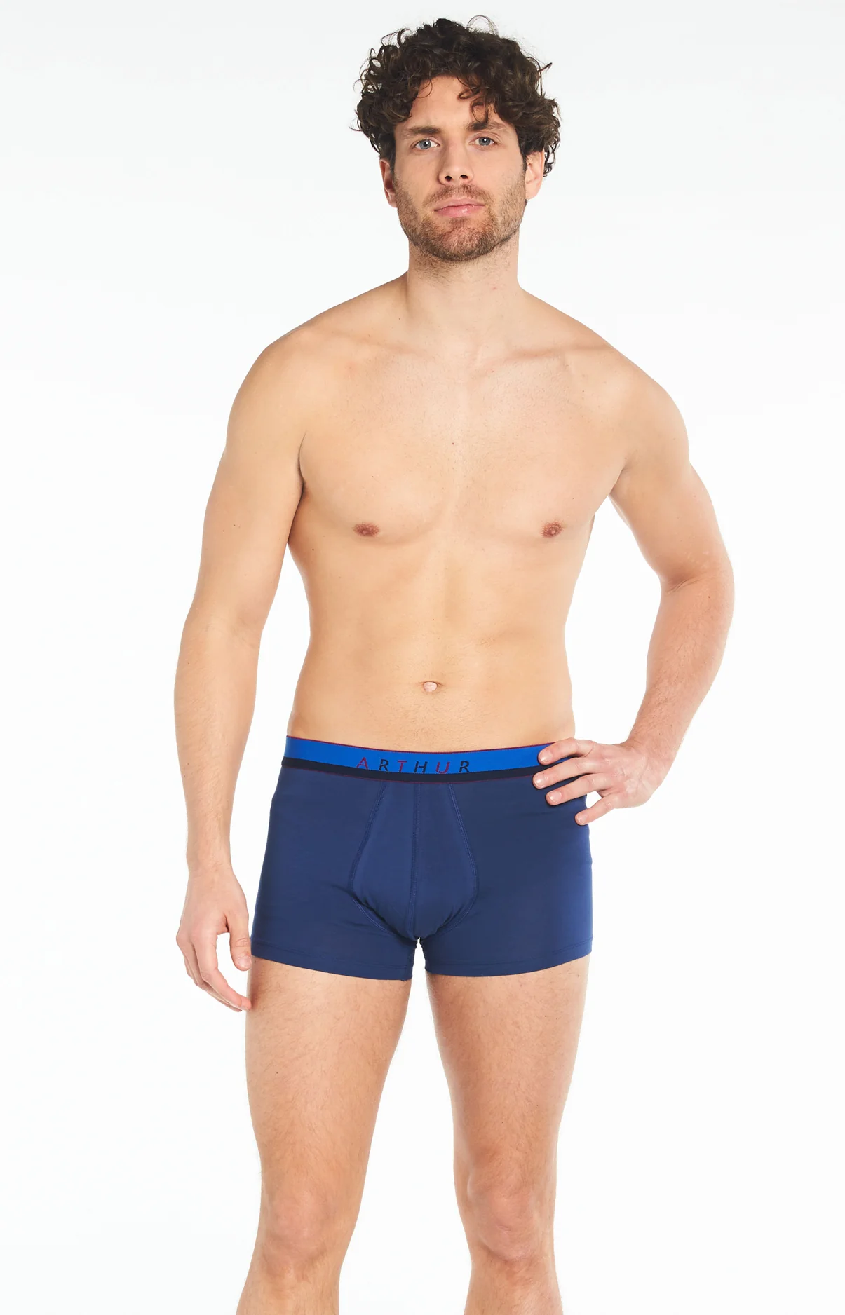 Cousins modernes du caleçon Club, les nouveaux boxers Arthur adaptent la suspension originale du modèle icônique à l’époque et à la tendance ! Avec son filet anti-frottement, ce modèle bleu marine, tout en coton issu de l’agriculture biologique et élasthanne, constitue la garantie d’un confort maximal en toutes situations, le tout dans un style sobre et discret.