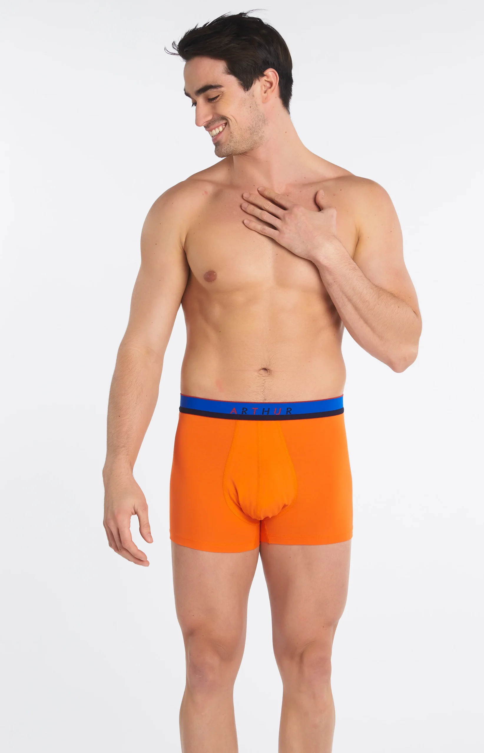 Cousins modernes du caleçon Club, les nouveaux boxers Arthur adaptent la suspension originale du modèle icônique à l’époque et à la tendance ! Avec son filet anti-frottement, ce modèle orange en coton issu de l’agriculture biologique et élasthanne garantit un confort maximal en toutes situations, le tout dans un style sobre et péchu.
