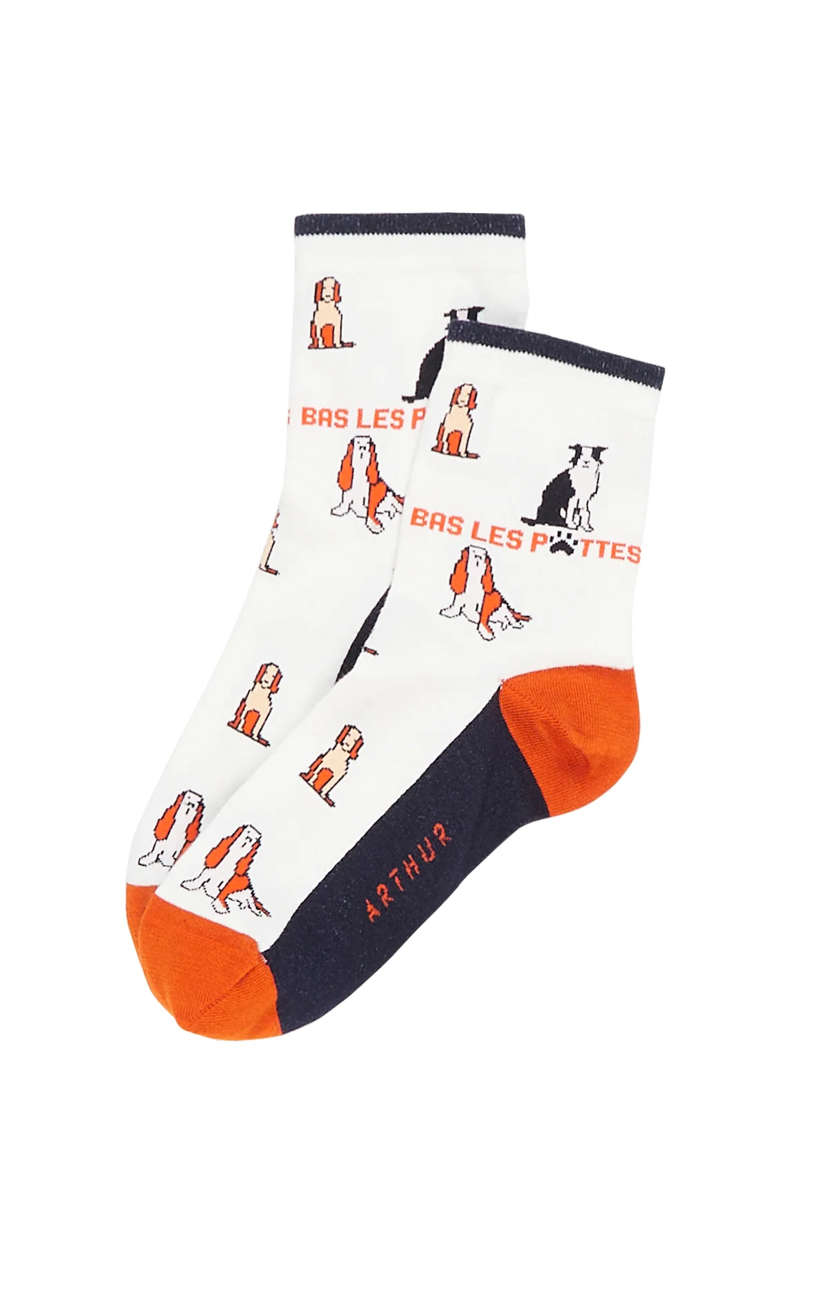Avec ces chaussettes femme, montrez votre amour pour nos amis à 4 pattes, dans un look décalé et aux petits motifs canins. Ses trois couleurs et sa petite sérigraphie complètent le confort du coton, matière principale de cette paire.