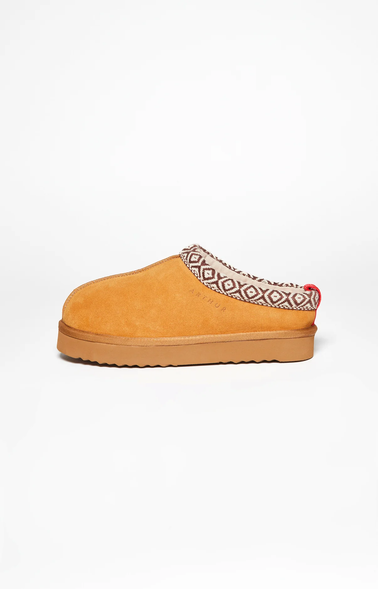 – Chaussons unisexes– Intérieur laine de mouton véritable – Dessus vache suédine – Semelle plateforme, caoutchouc EVA – Galon décoratif