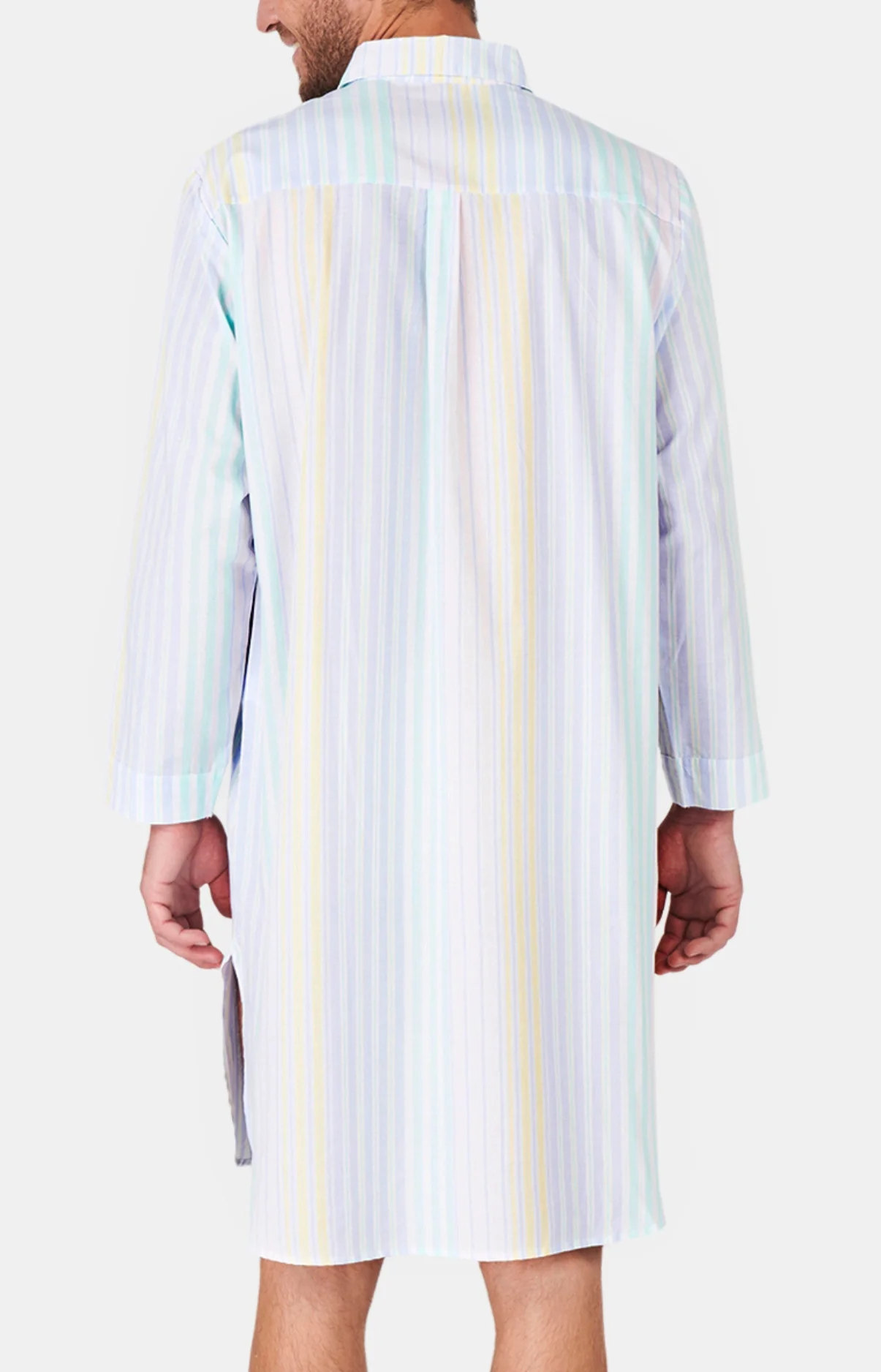 – Chemise de nuit Homme – 100% coton – Rayures multicolores fils teints – Manches longues, col tailleur et poche poitrine – Patte de boutonnage 4 boutons – Forme arrondie en bas, fentes côtés – Modèle exclusif créé à Paris – Confectionné dans nos ateliers partenaires au Maroc