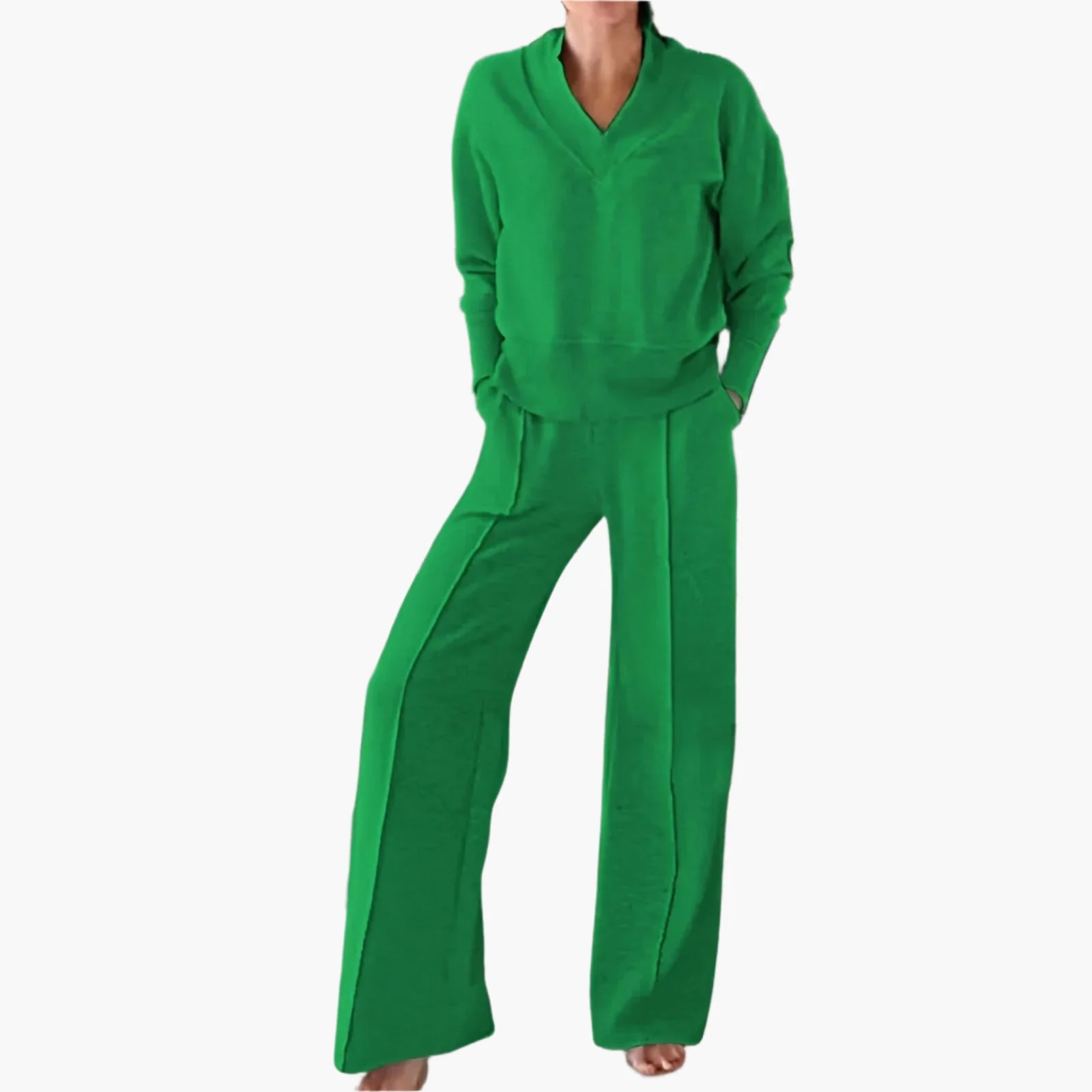 Conçu pour vous offrir une liberté de mouvement totale, cet ensemble allie style moderne et bien-être. Le pull à col en V met en valeur la taille tout en procurant une chaleur agréable grâce à sa coupe ample et à sa finition côtelée tendance. Le pantalon large, quant à lui, sublime toutes les silhouettes avec ses lignes flatteuses, vous garantissant allure et aisance au quotidien.