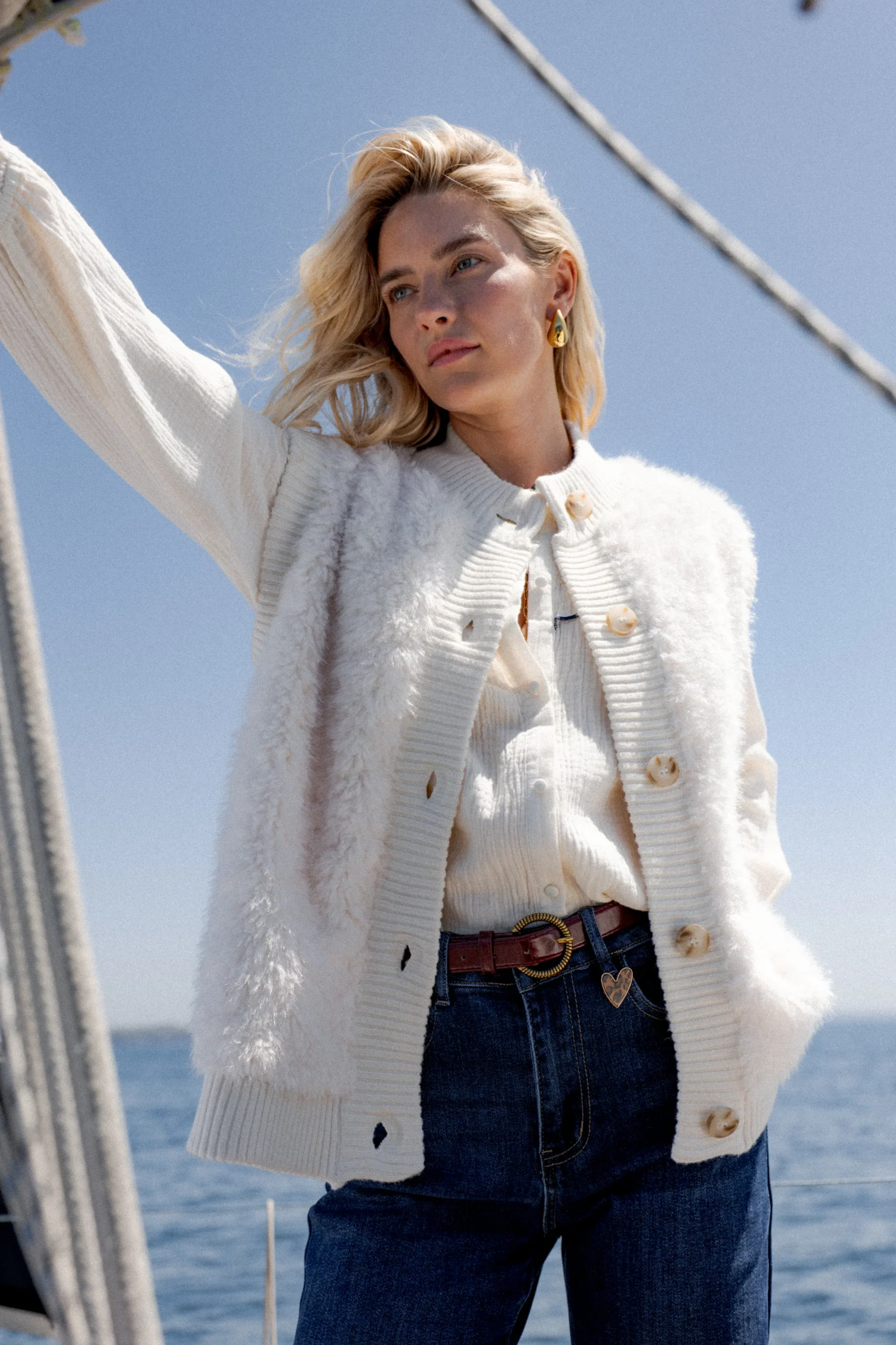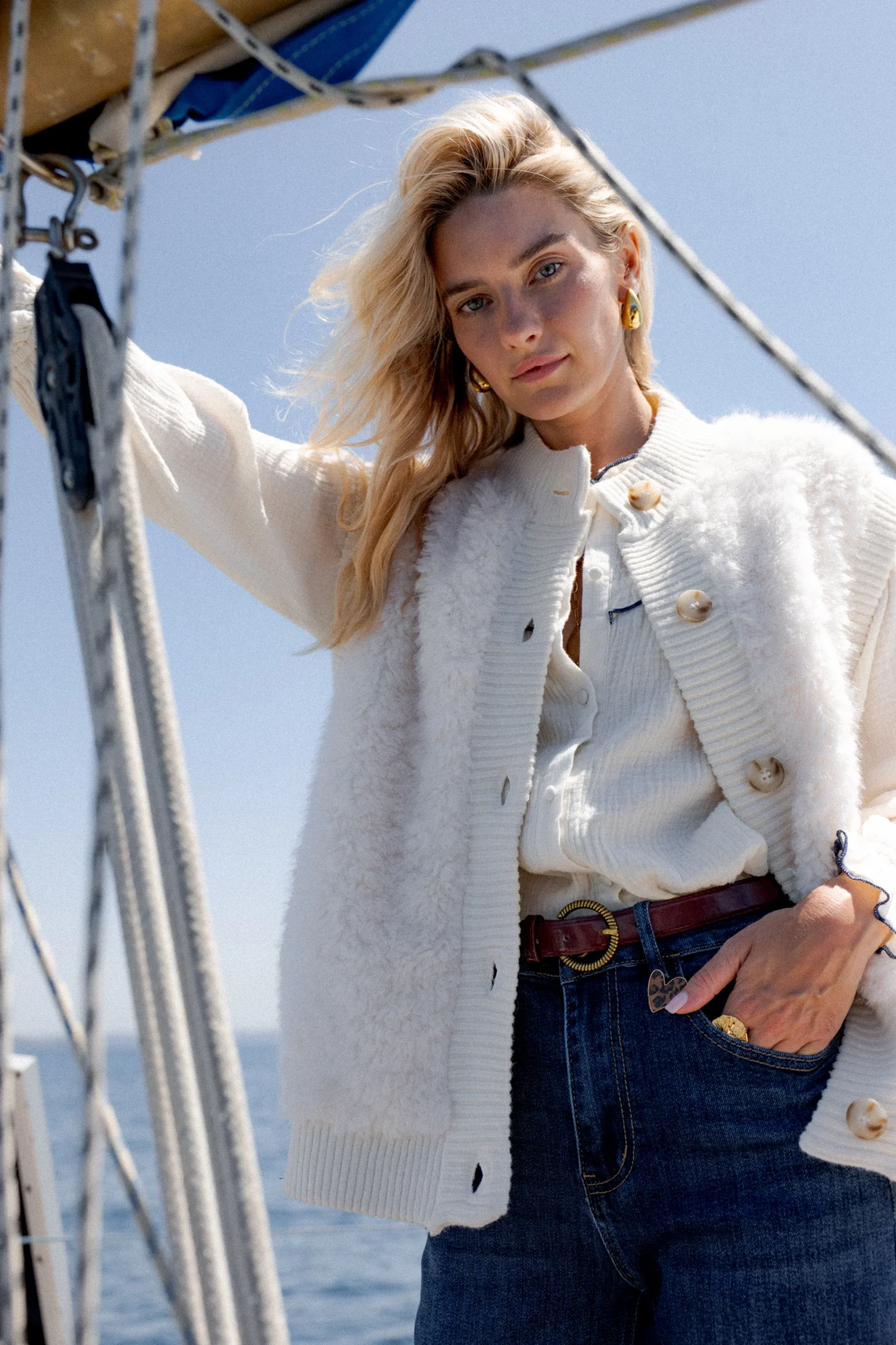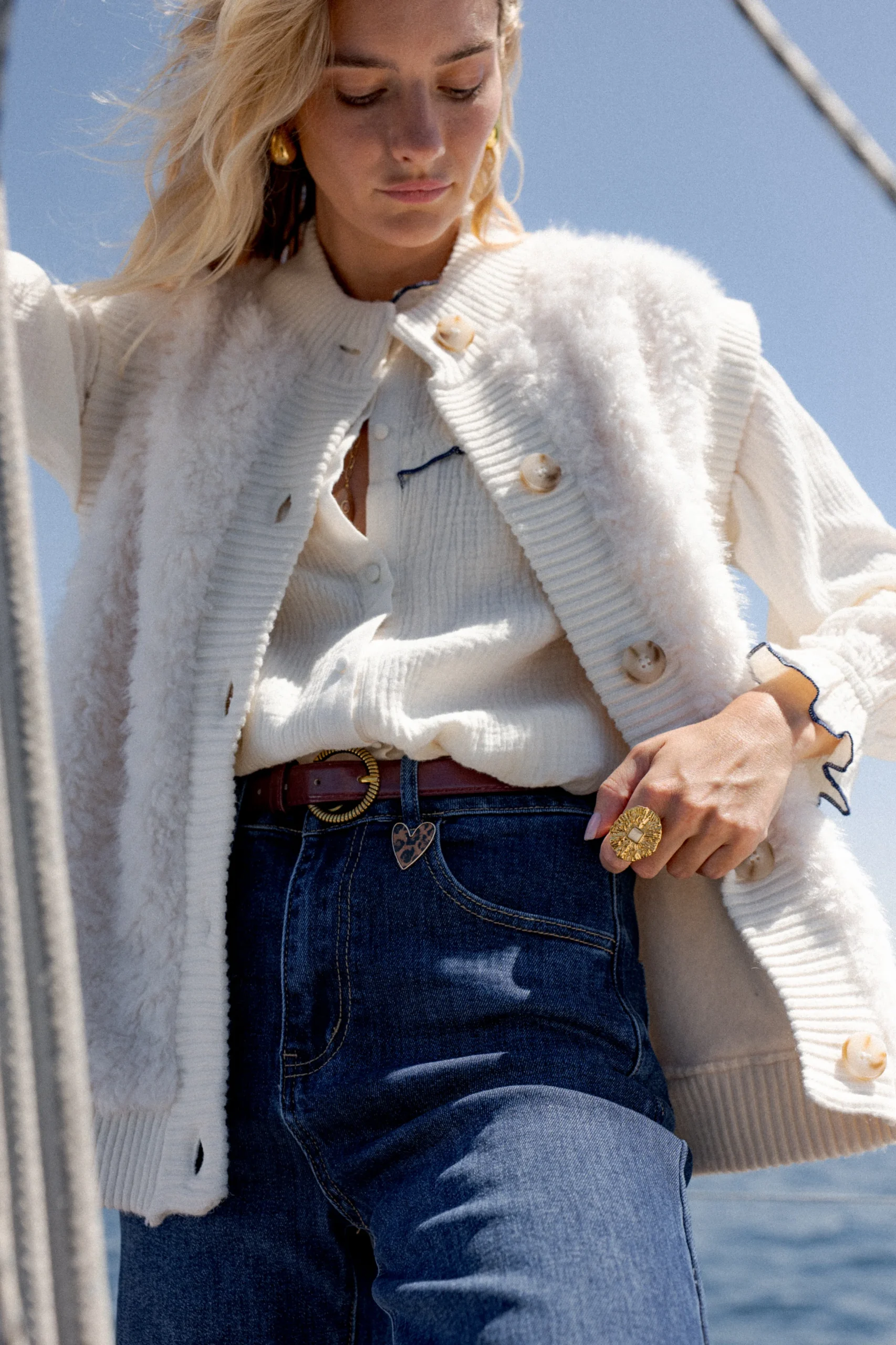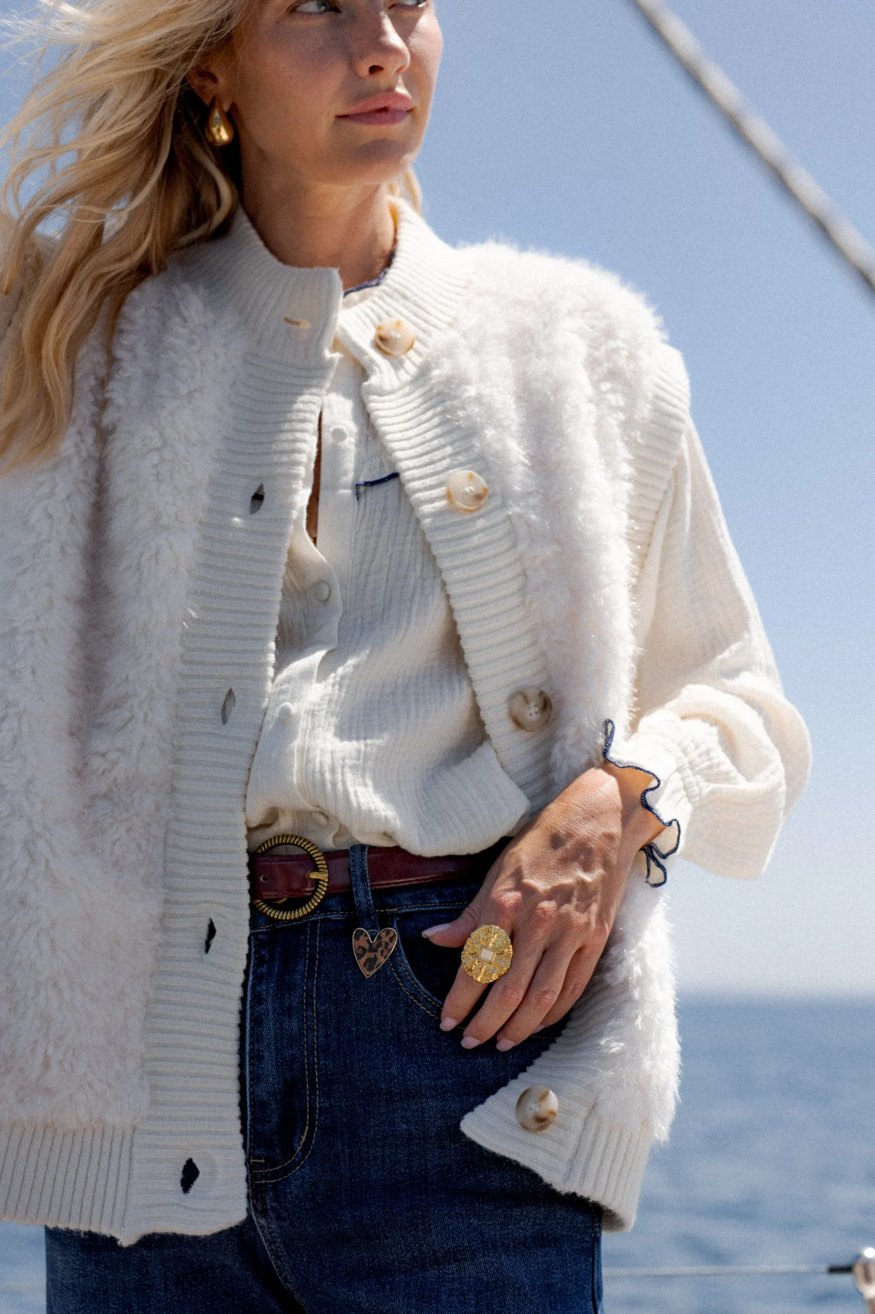Coupe : Droite, sans manches Détails : Fermeture boutonnée, col rond, maille côtelée contrastante, toucher ultra doux façon sherpa Style : À porter sur une chemise ou un pull fin pour un look cosy et stylé Vibe : L’essentiel cocooning de l’hiver – réconfortant, doux, et plein de charme Composition : 10% laine 18% nylon […]