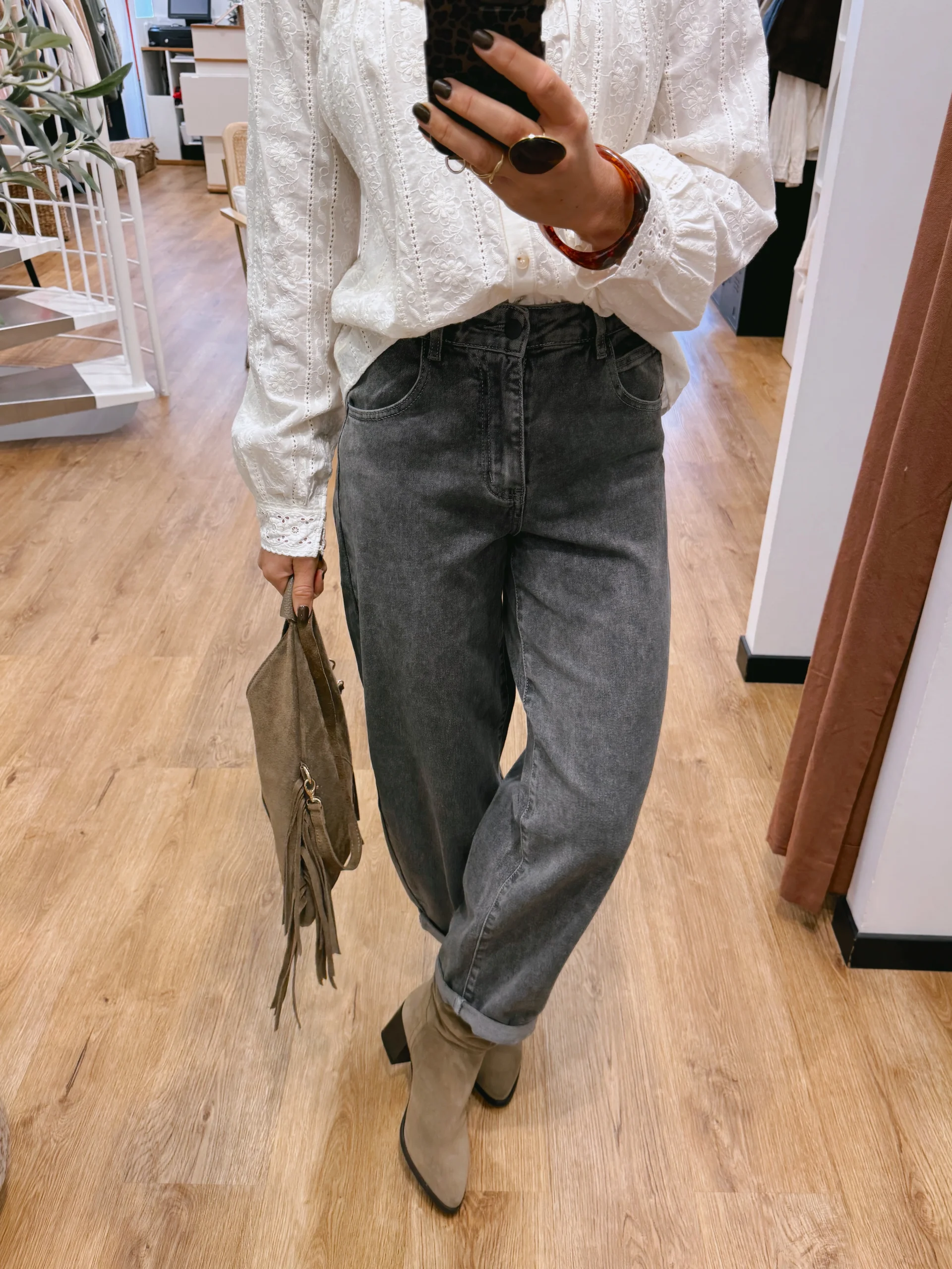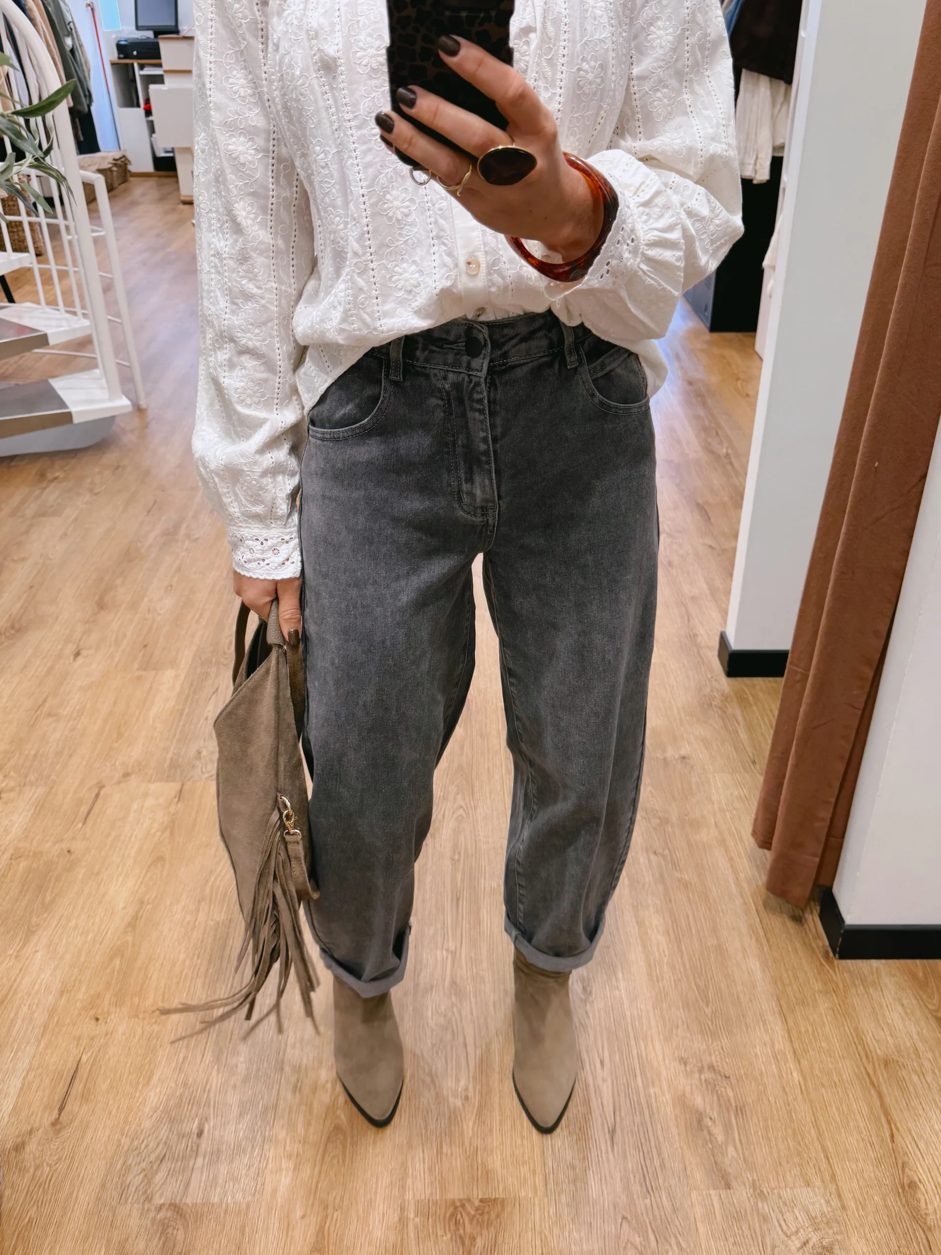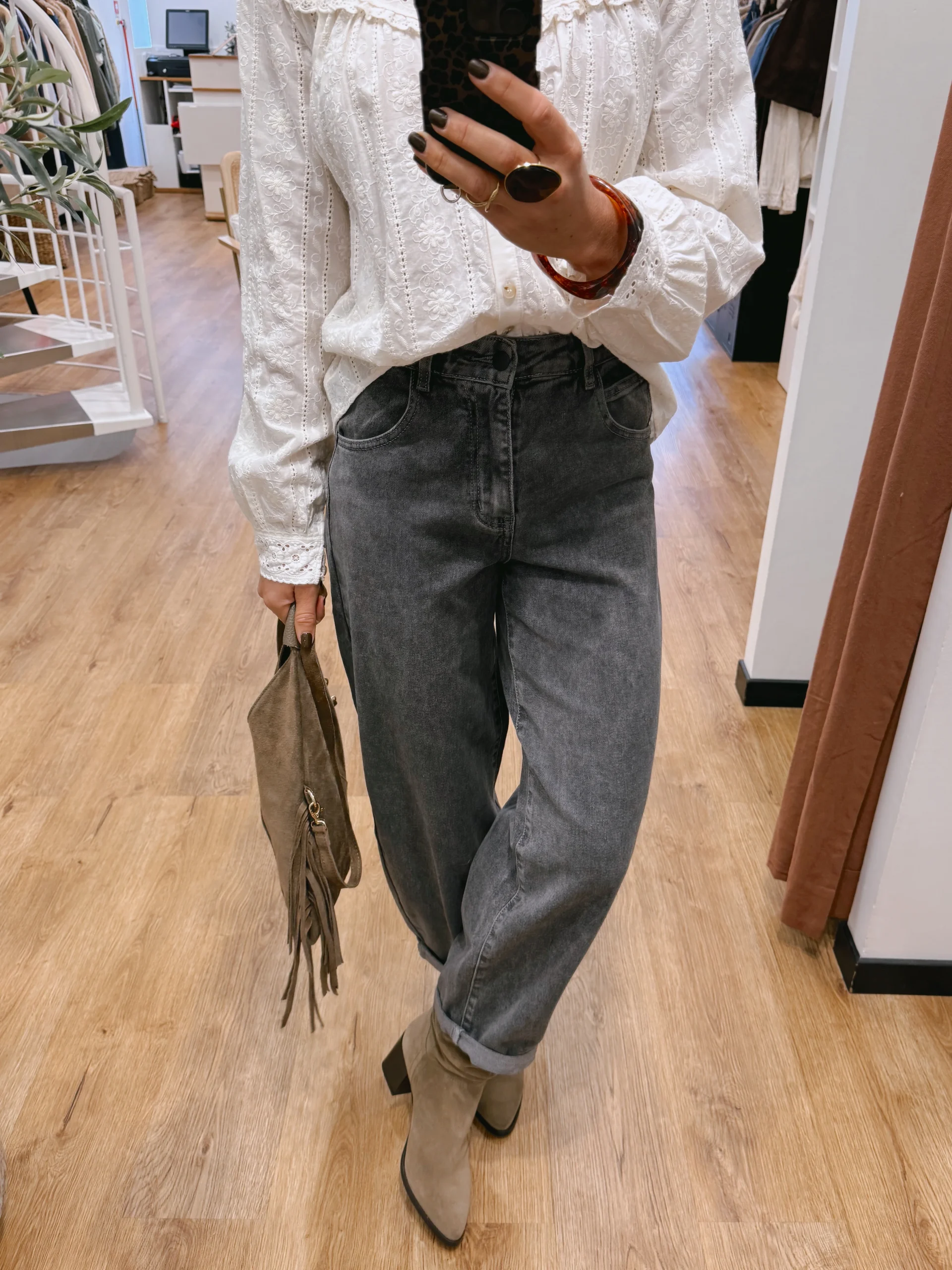 Composition: 62% coton 36% polyester 2% élasthanne Coupe balloon Taille haute Fermeture à bouton et zip Le Jean Balloon marron revisite la silhouette iconique du jean oversize avec une touche contemporaine. Portez-le avec une chemise fluide et des bottines pour un look citadin raffiné, ou avec un pull oversize pour un style plus décontracté. Le […]