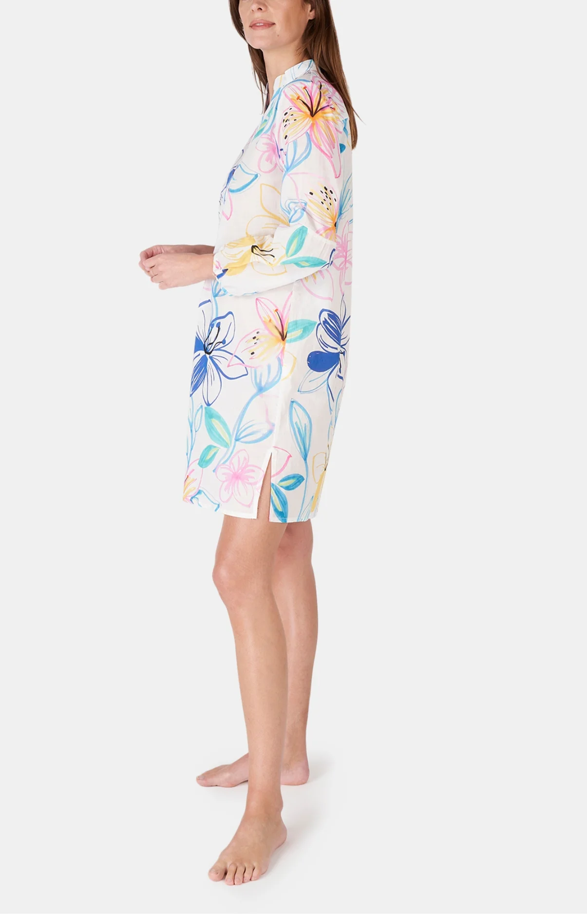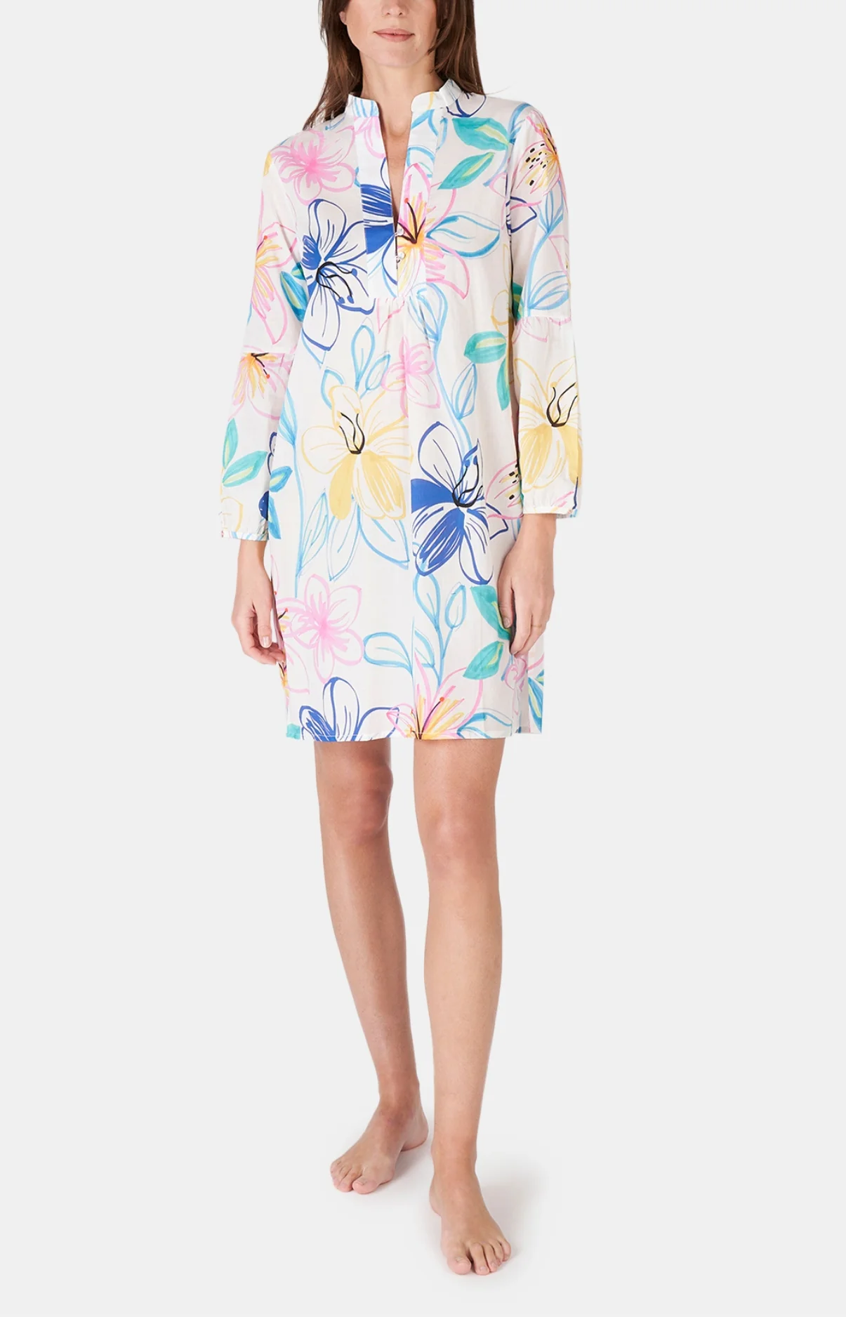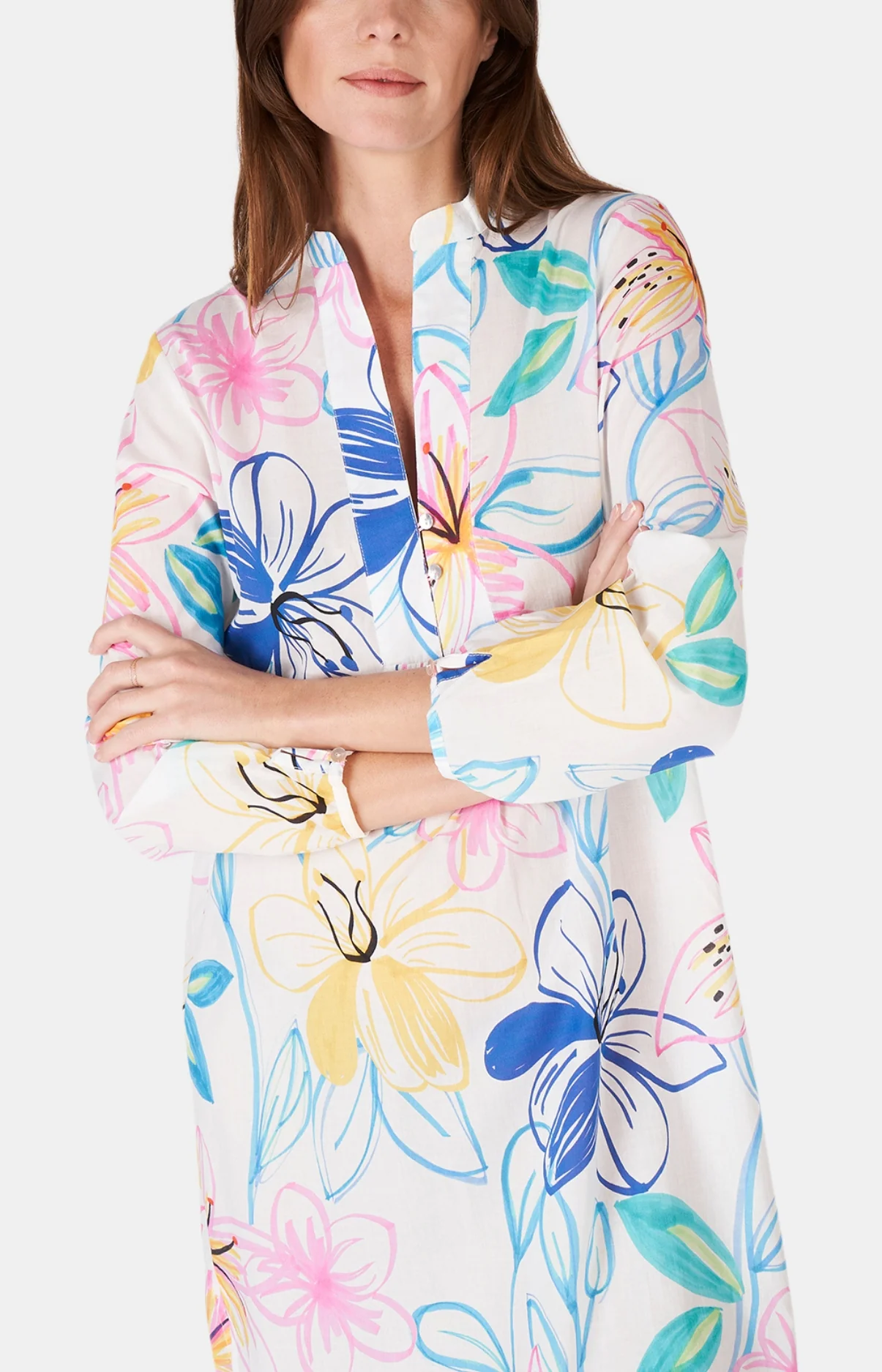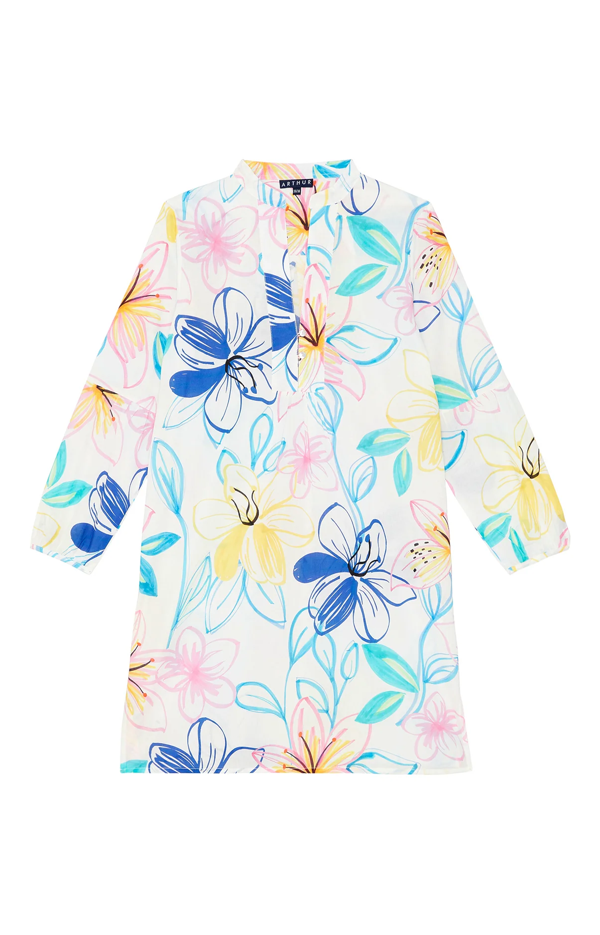 – Chemise de nuit Femme boutonnée ou tunique d’été – à porter de jour comme de nuit, à la plage comme à la maison – 100% coton (voile de coton) – Manches 3/4 – Col veste – Longueur environ 88 cm – Motif exclusif créé à Paris – Fabriquée dans nos ateliers partenaires au Maroc