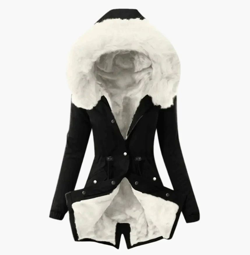 Manteau d’hiver femme élégant à capuche large fourrée style urbain chaud