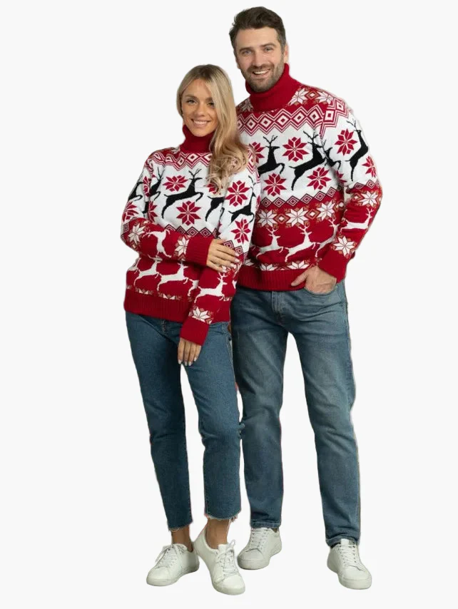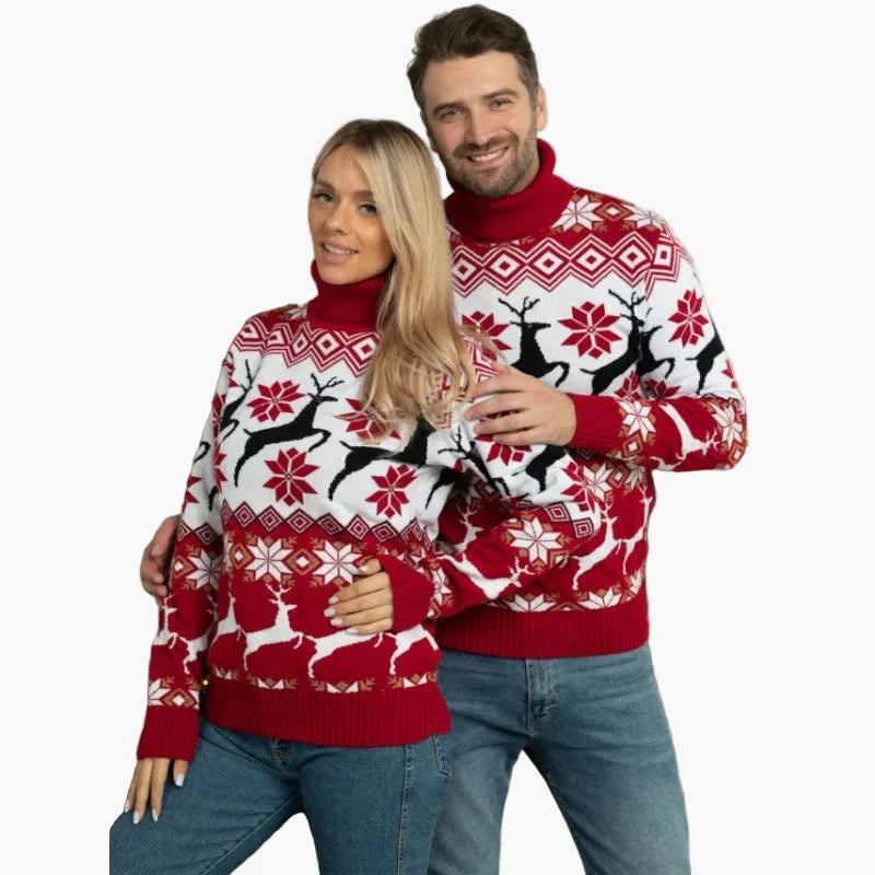 Pull de Noël à Col Montant pour Femme – Motifs Cerfs et Flocons, Style Hiver Festif