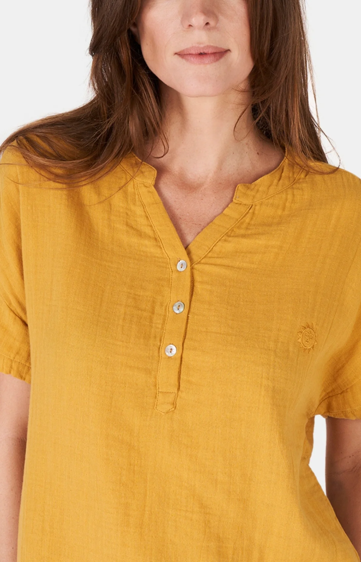 – Tee-shirt manches courtes, col tunisien 3 boutons nacre véritable