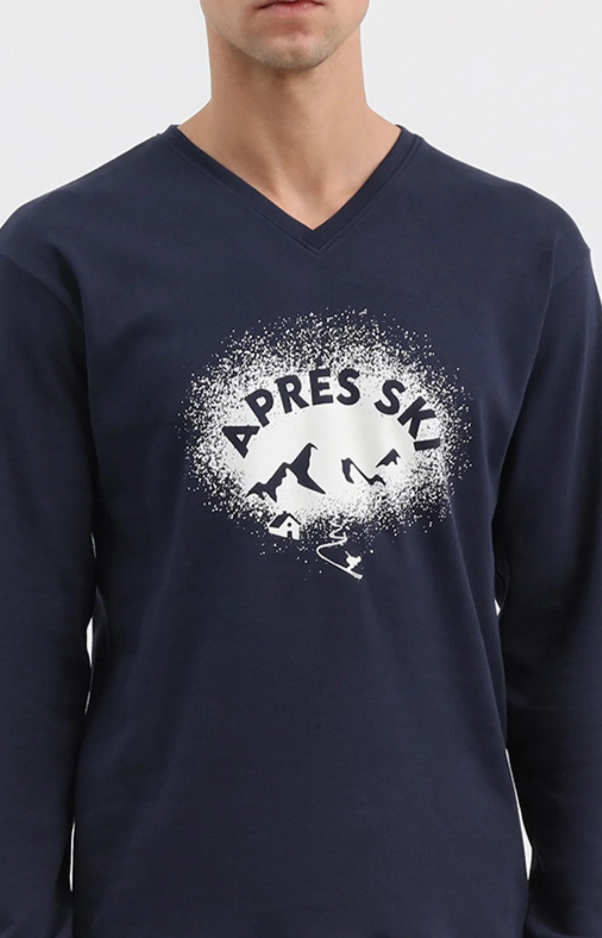 – Ensemble de Pyjama Homme – 100% coton – Tee-shirt uni col V, manches longues – Sérigraphie poitrine – Pantalon de pyjama avec ceinture élastiquée, cordon de serrage et 2 poches côtés – Motif exclusif créé à Paris – Confectionné dans nos ateliers partenaires en Inde