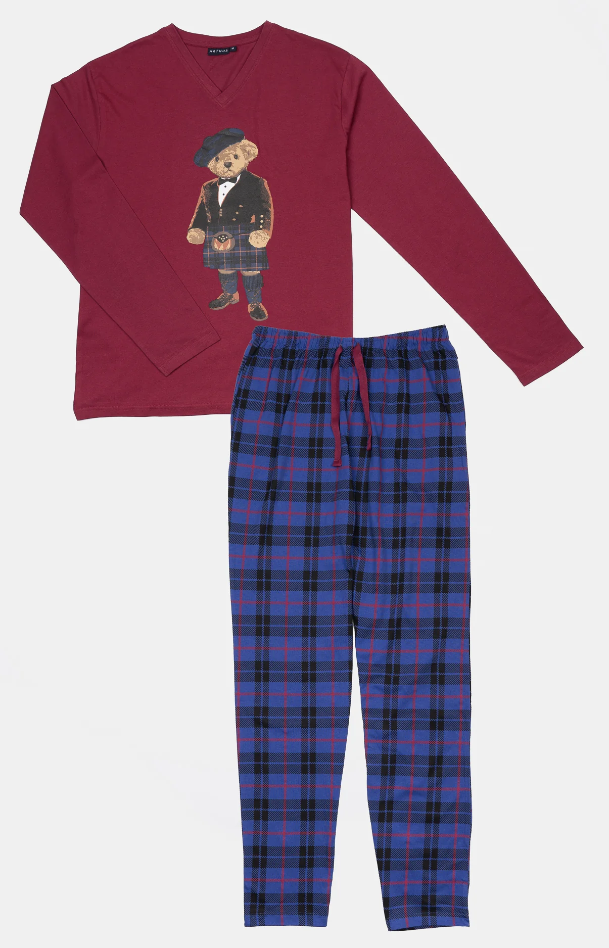 – Ensemble de Pyjama Homme – 100% coton – Tee-shirt uni col V, manches longues – Sérigraphie poitrine – Pantalon de pyjama avec ceinture élastiquée, cordon de serrage et 2 poches côtés – Motif exclusif créé à Paris – Confectionné dans nos ateliers partenaires en Inde