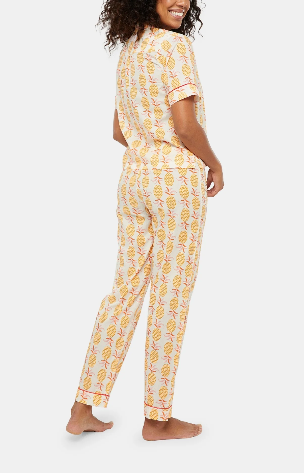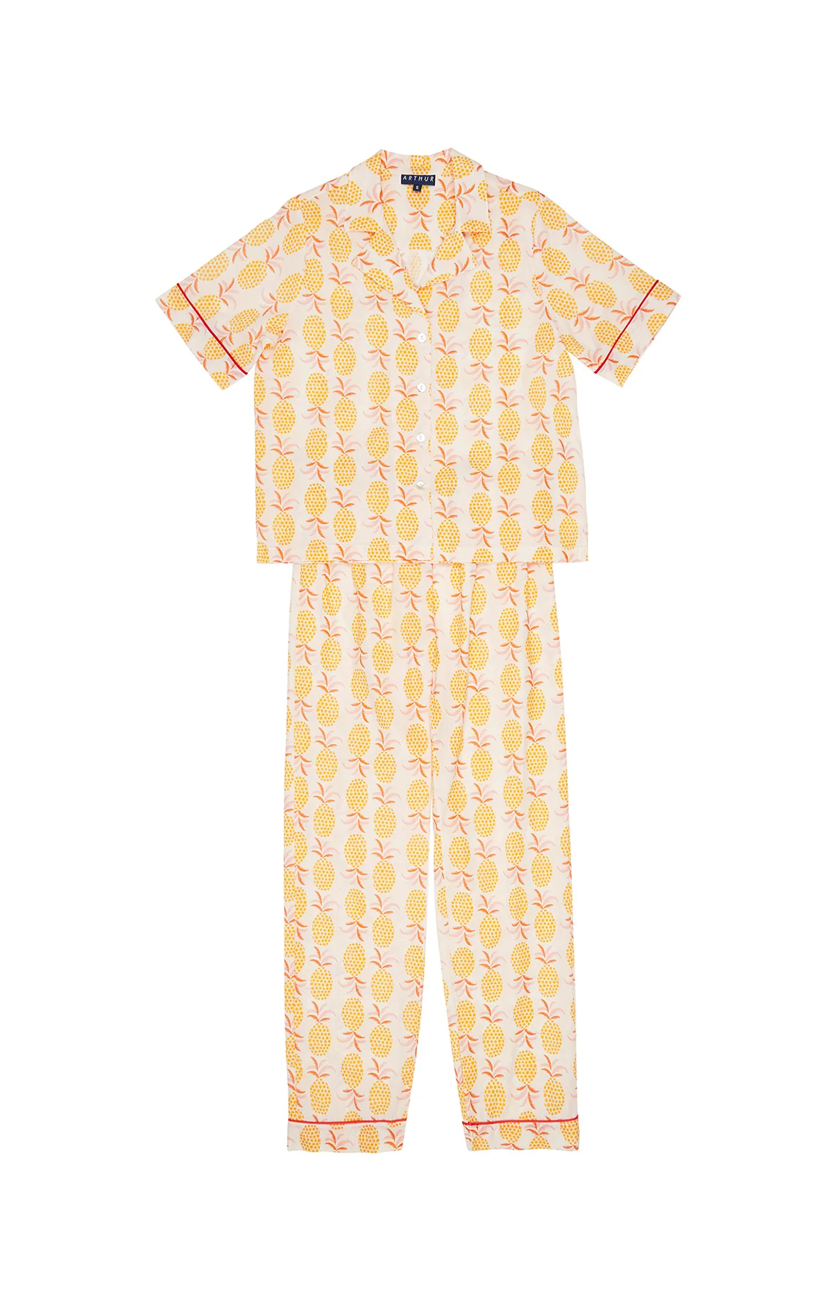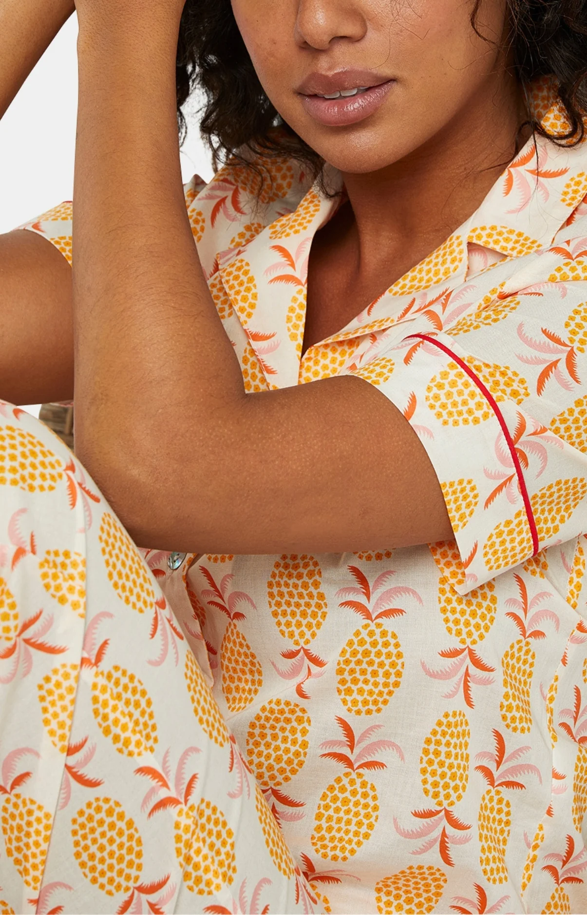 – Ensemble de pyjama Femme long – 100% voile de coton – Chemise boutonnée, col tailleur avec finitions passepoilées – Boutons en nacre véritable – Manches courtes – Pantalon de pyjama avec ceinture élastiquée cordon de serrage – Motif exclusif créé à Paris – Confectionné dans nos ateliers partenaires au Maroc
