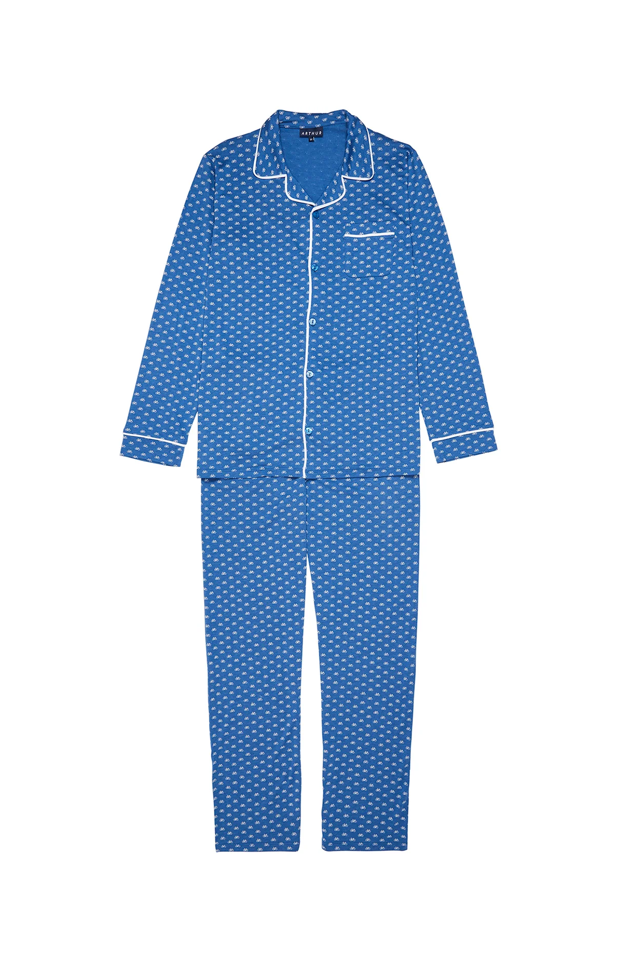 – Pyjama Homme – En lyocell et coton – Chemise boutonnée, col tailleur, manches longues, finition passepoilée et poche poitrine avec broderie – Pantalon de pyjama élastiqué avec de cordon de serrage – Motif exclusif créé à Paris – Confectionné dans nos ateliers partenaires au Portugal
