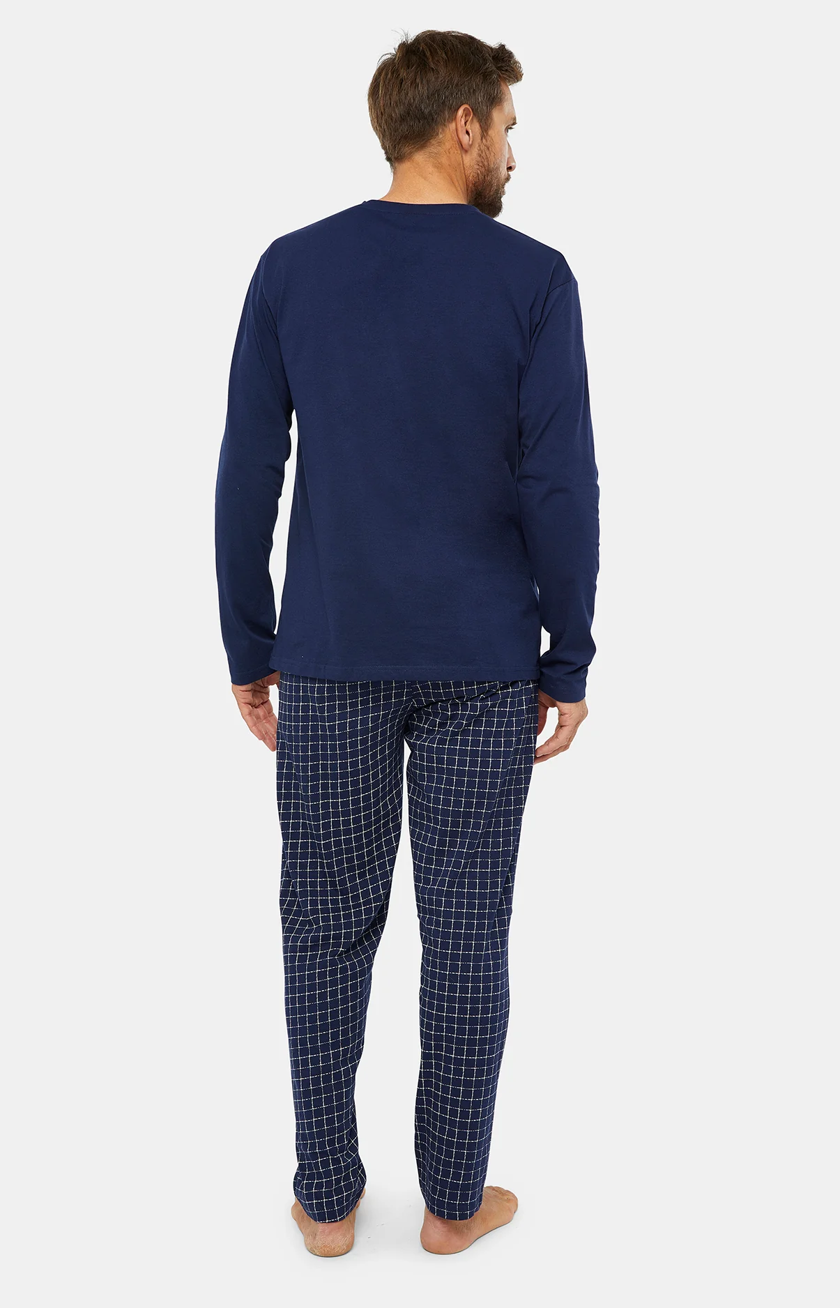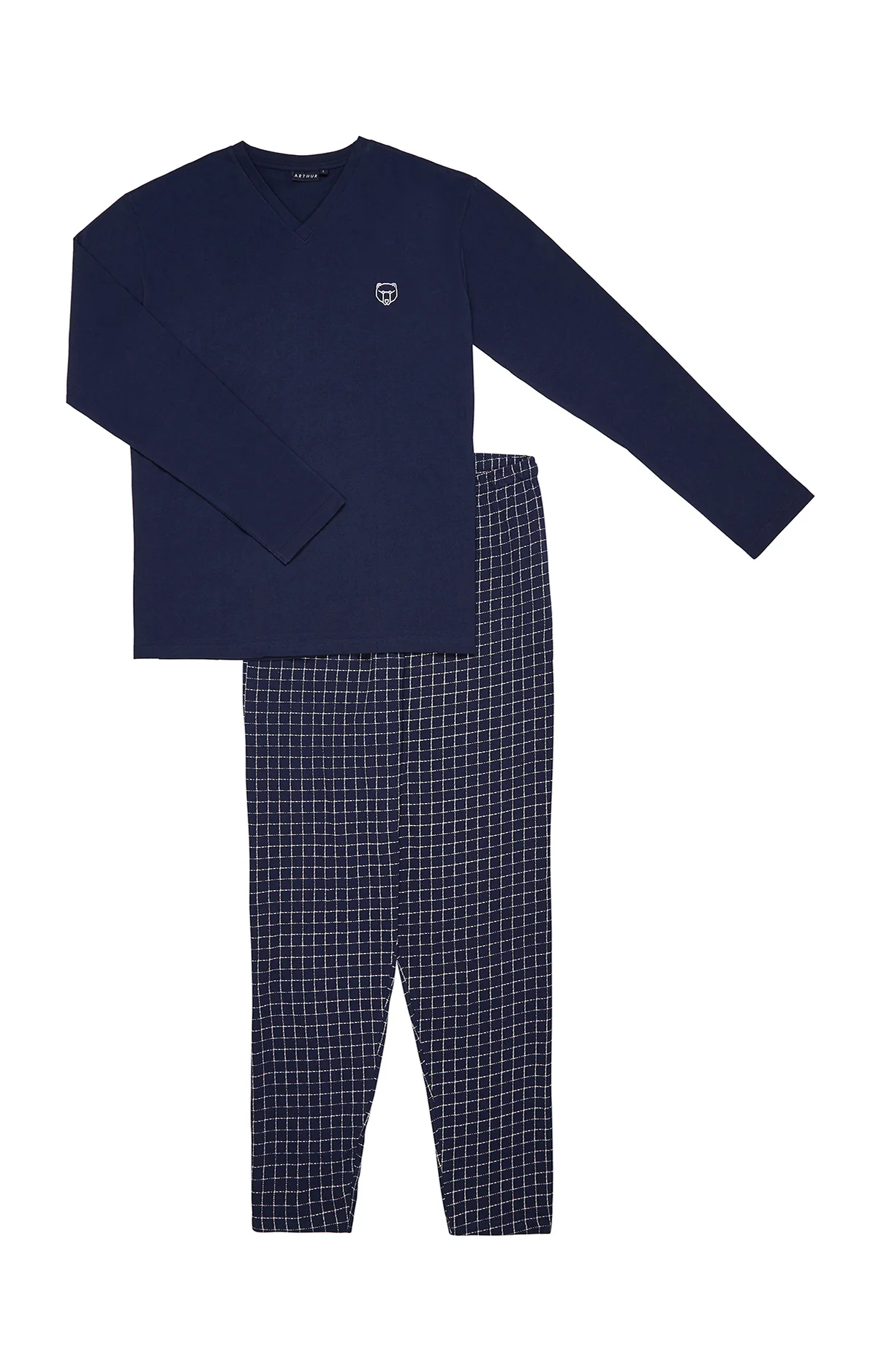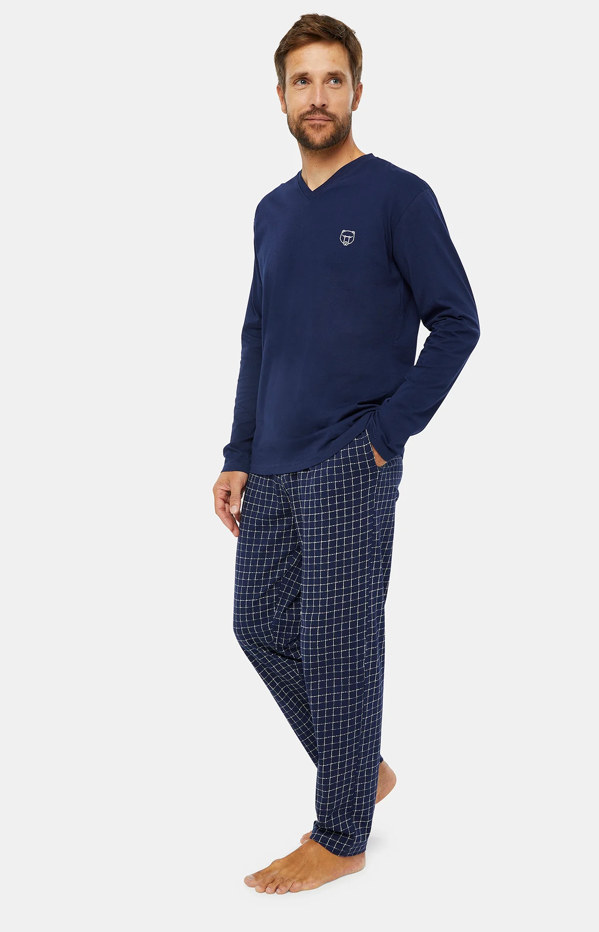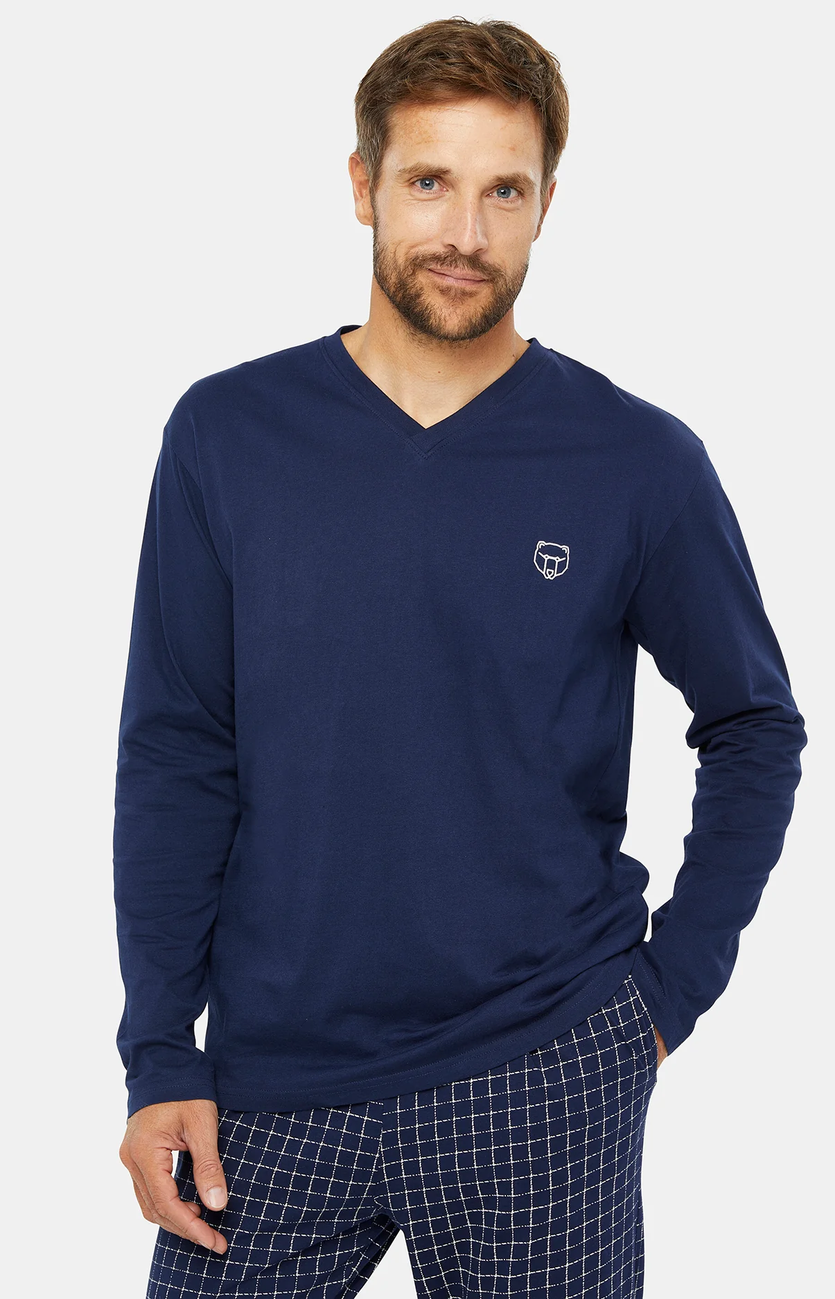 – Pyjama homme long en jersey de coton – Tee-shirt uni col V, manches longues – Pantalon élastiqué avec cordon de serrage – Motif exclusif créé à Paris – Confectionné dans nos ateliers partenaires en Inde