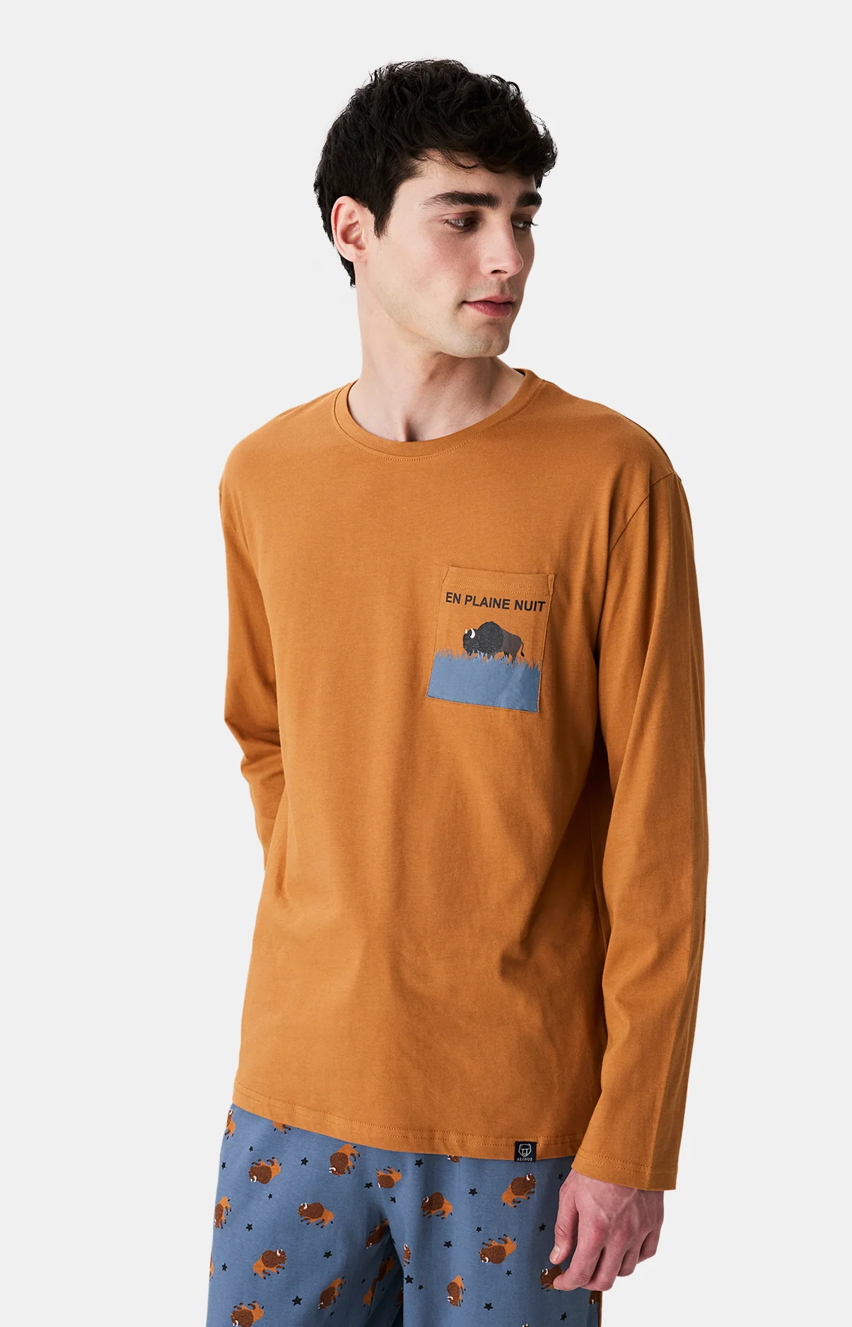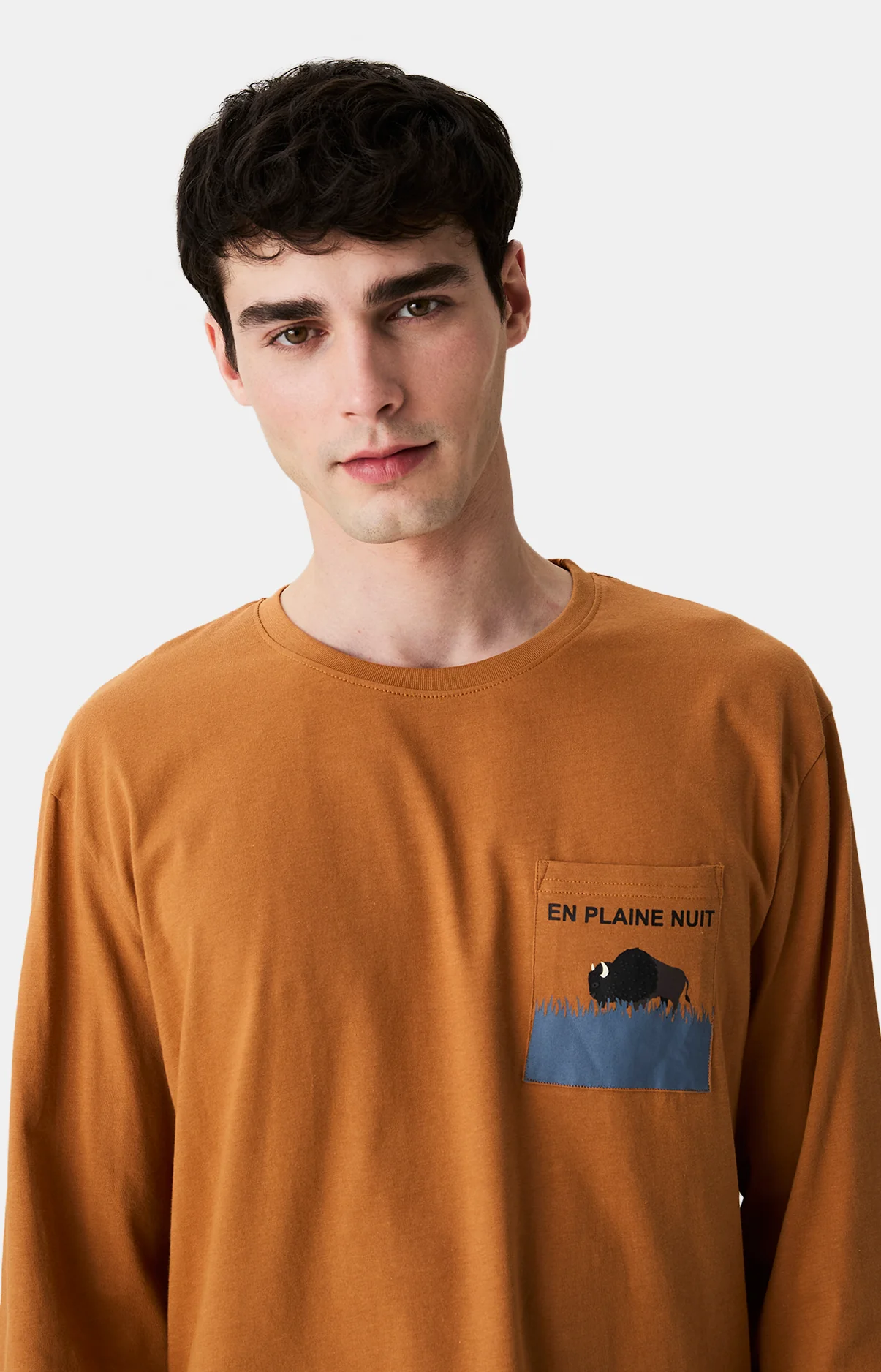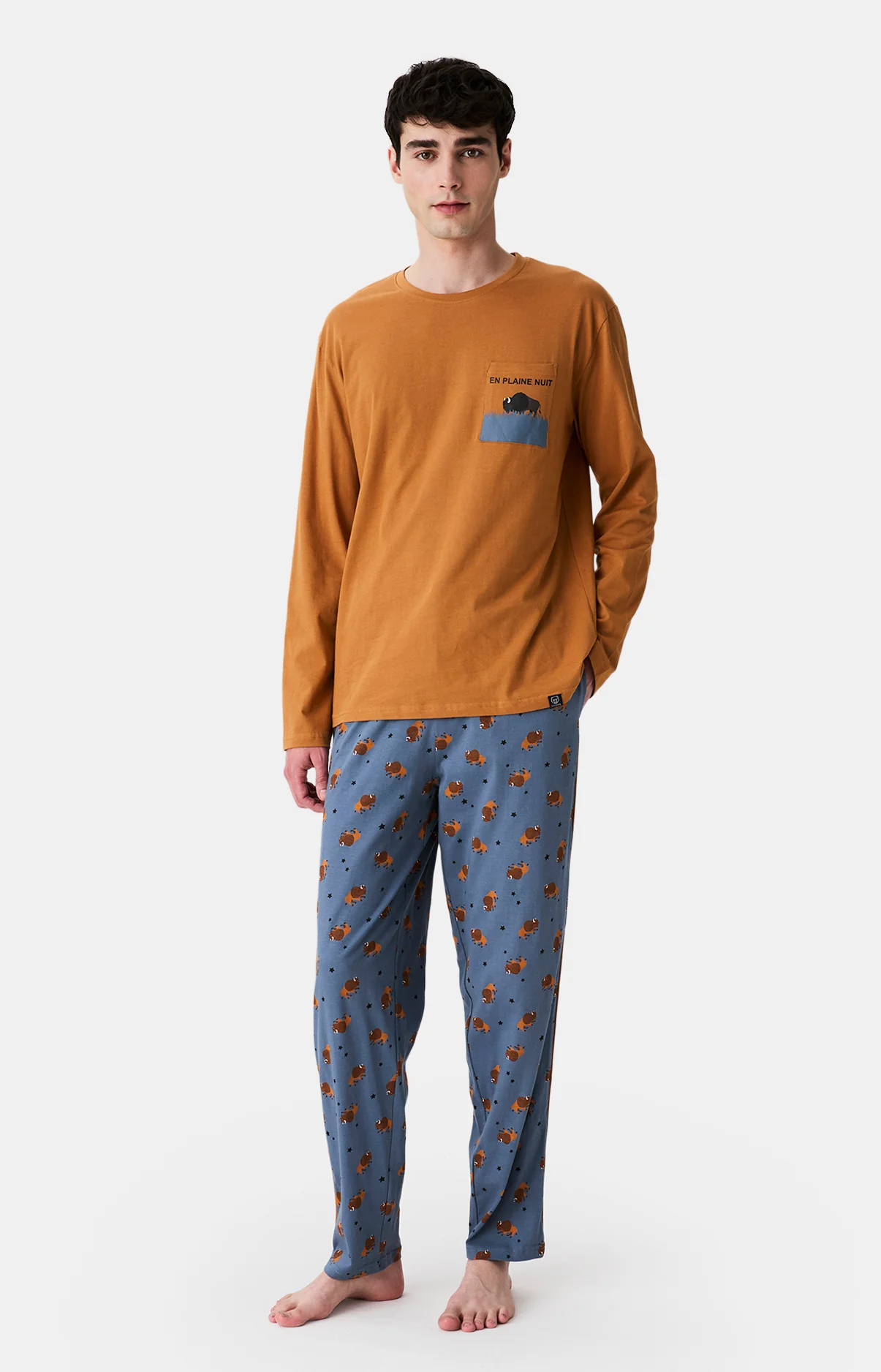 Fantaisie et coton léger pour aller se coucher sans laisser son second degré de côté ! – Ensemble de Pyjama Homme – 100% coton issu de l’agriculture biologique – Tee-shirt uni col rond, manches longues – Poche et sérigraphie poitrine – Pantalon de pyjama en jersey de coton avec ceinture élastiquée, cordon de serrage et […]