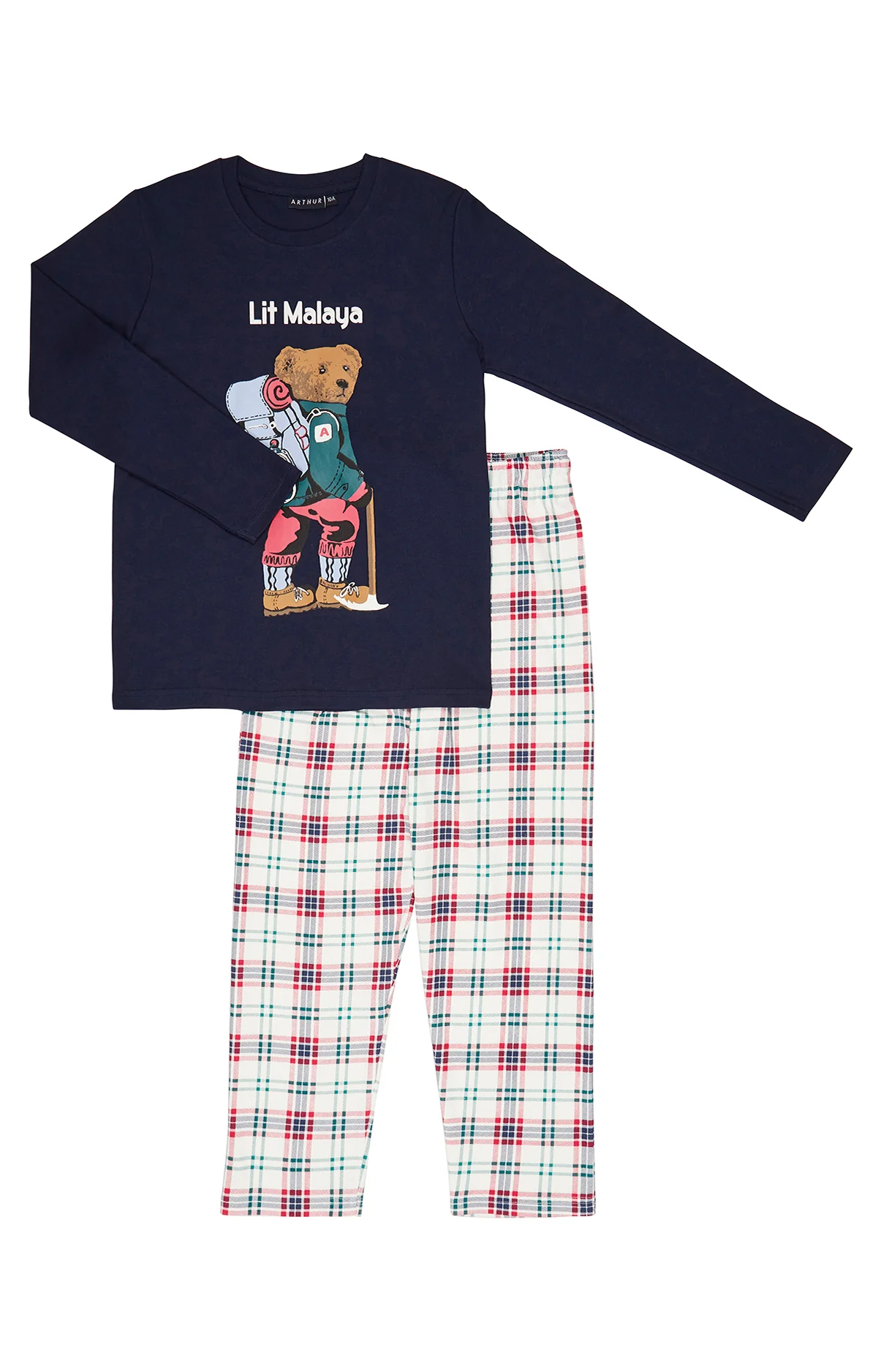 – pyjama enfant long en coton – Tee-shirt uni col rond à manches longues – Pantalon élastiqué avec cordon de serrage – Motif créé à Paris – Confectionné dans nos ateliers partenaires en Inde