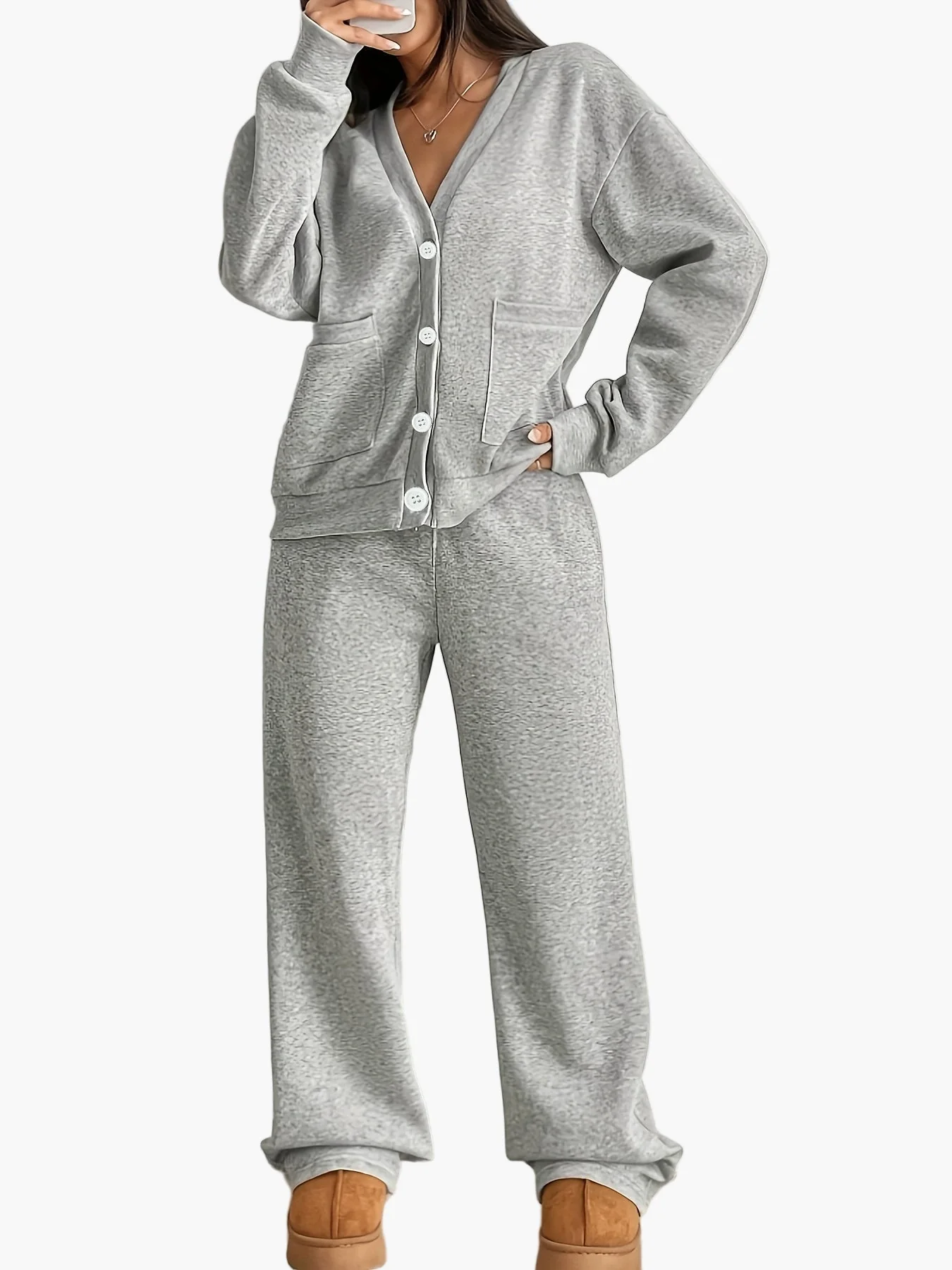 Pyjama femme deux pièces style détente avec boutons et poches, ensemble loungewear confortable pour la maison