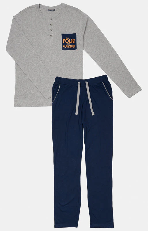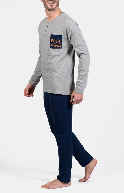 – Ensemble de Pyjama Homme – 100% coton – Tee-shirt uni col tunisien, manches longues – Pantalon de pyjama avec ceinture élastiquée, cordon de serrage et 2 poches côtés – Motif exclusif créé à Paris – Confectionné dans nos ateliers partenaires en Inde