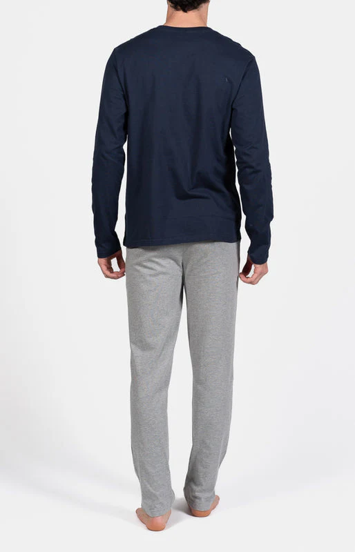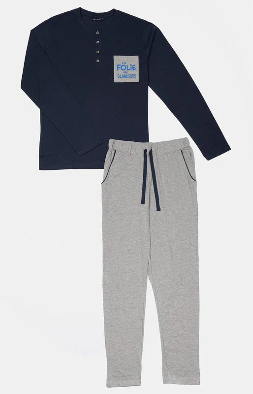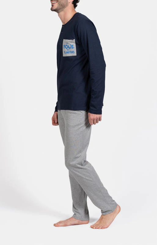 – Ensemble de Pyjama Homme – 100% coton – Tee-shirt uni col tunisien, manches longues – Pantalon de pyjama avec ceinture élastiquée, cordon de serrage et 2 poches côtés – Motif exclusif créé à Paris – Confectionné dans nos ateliers partenaires en Inde