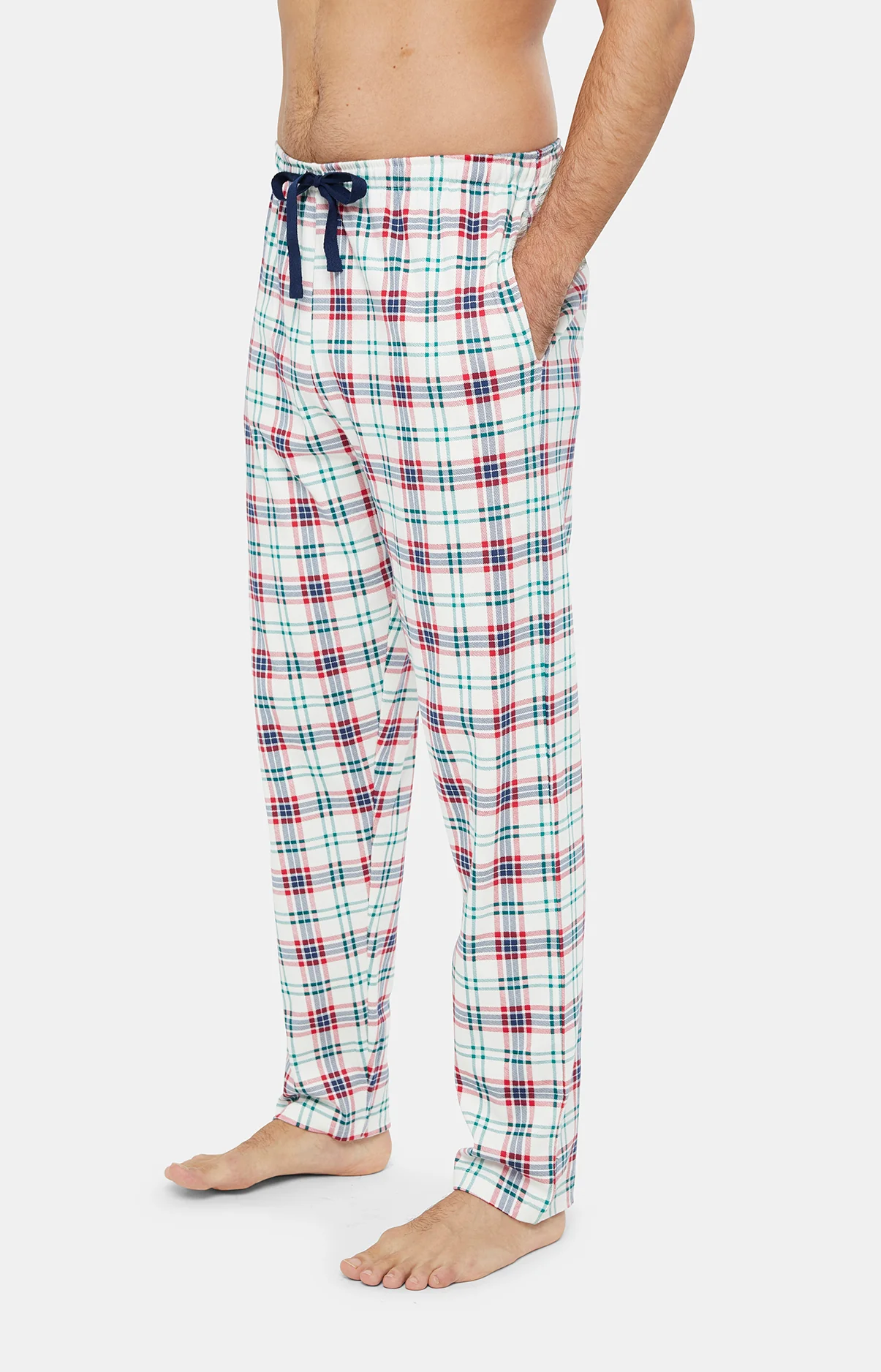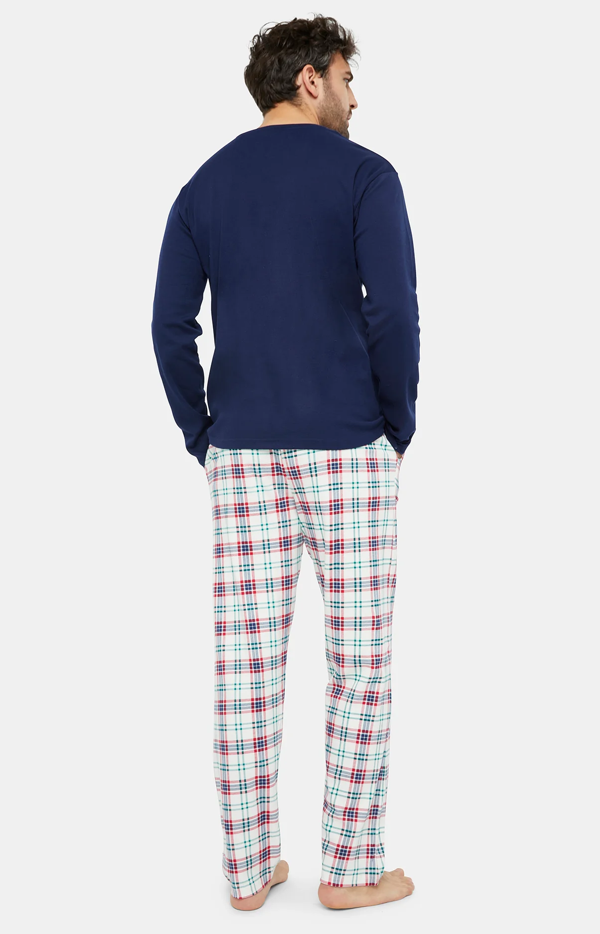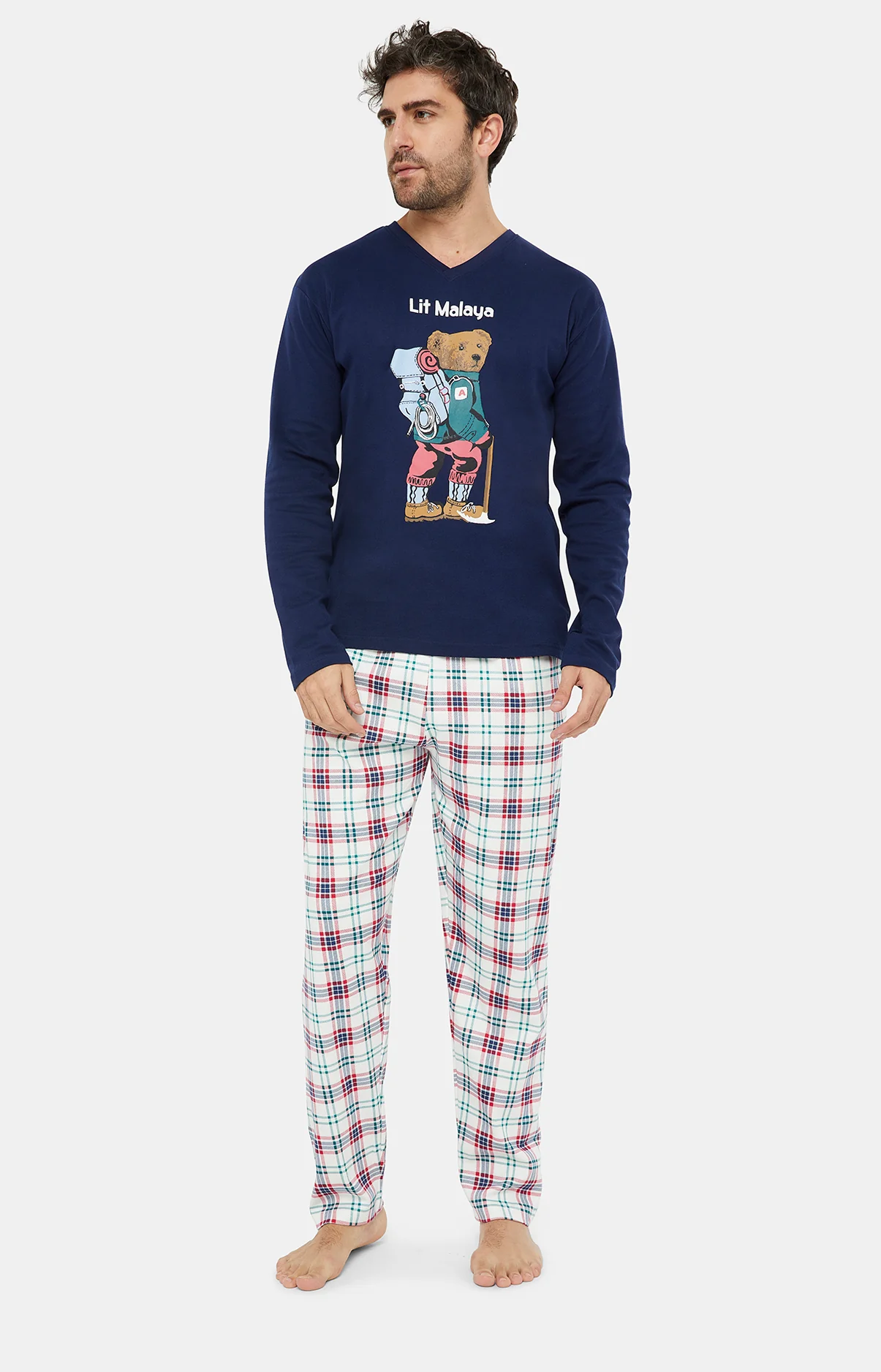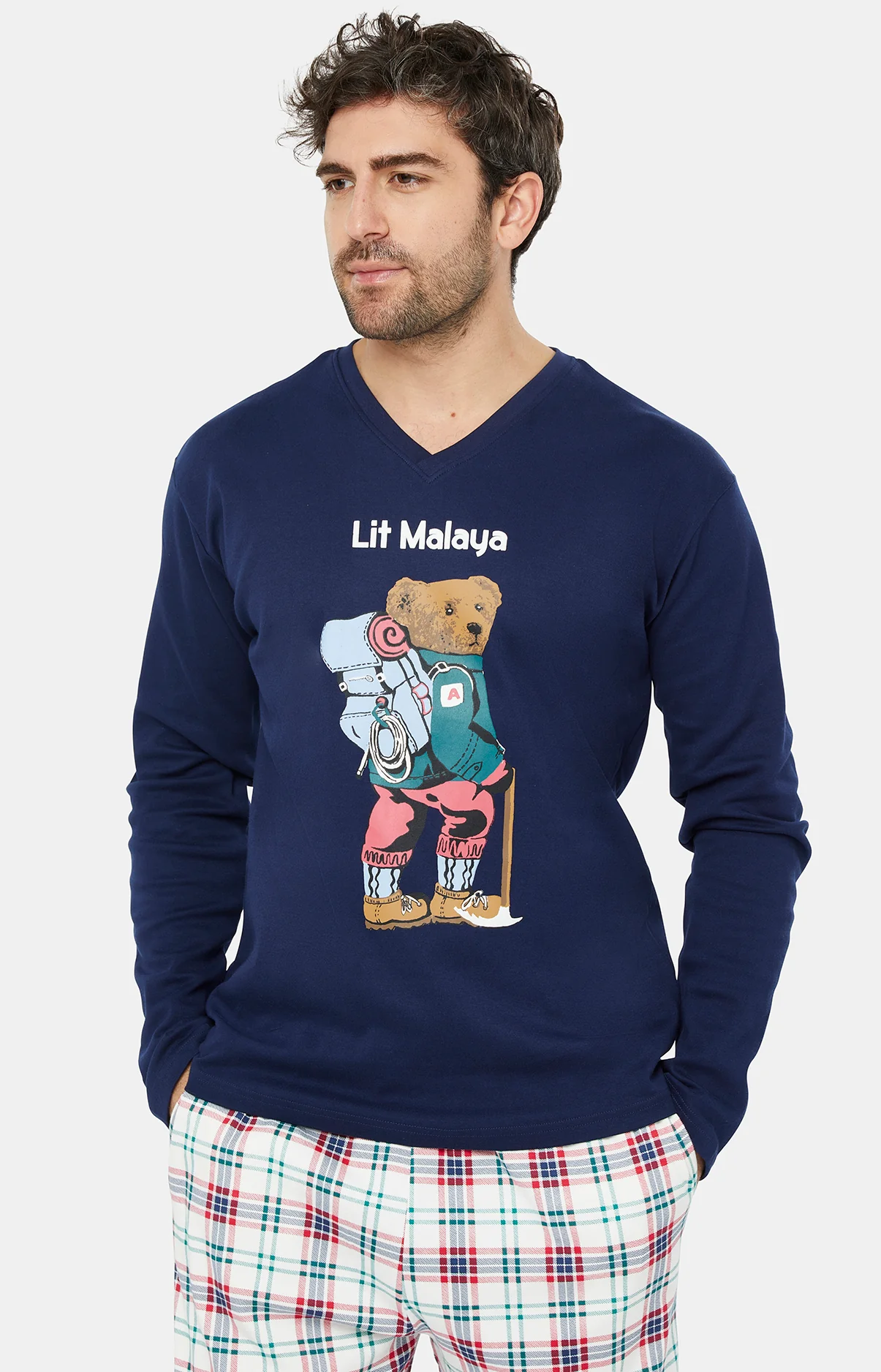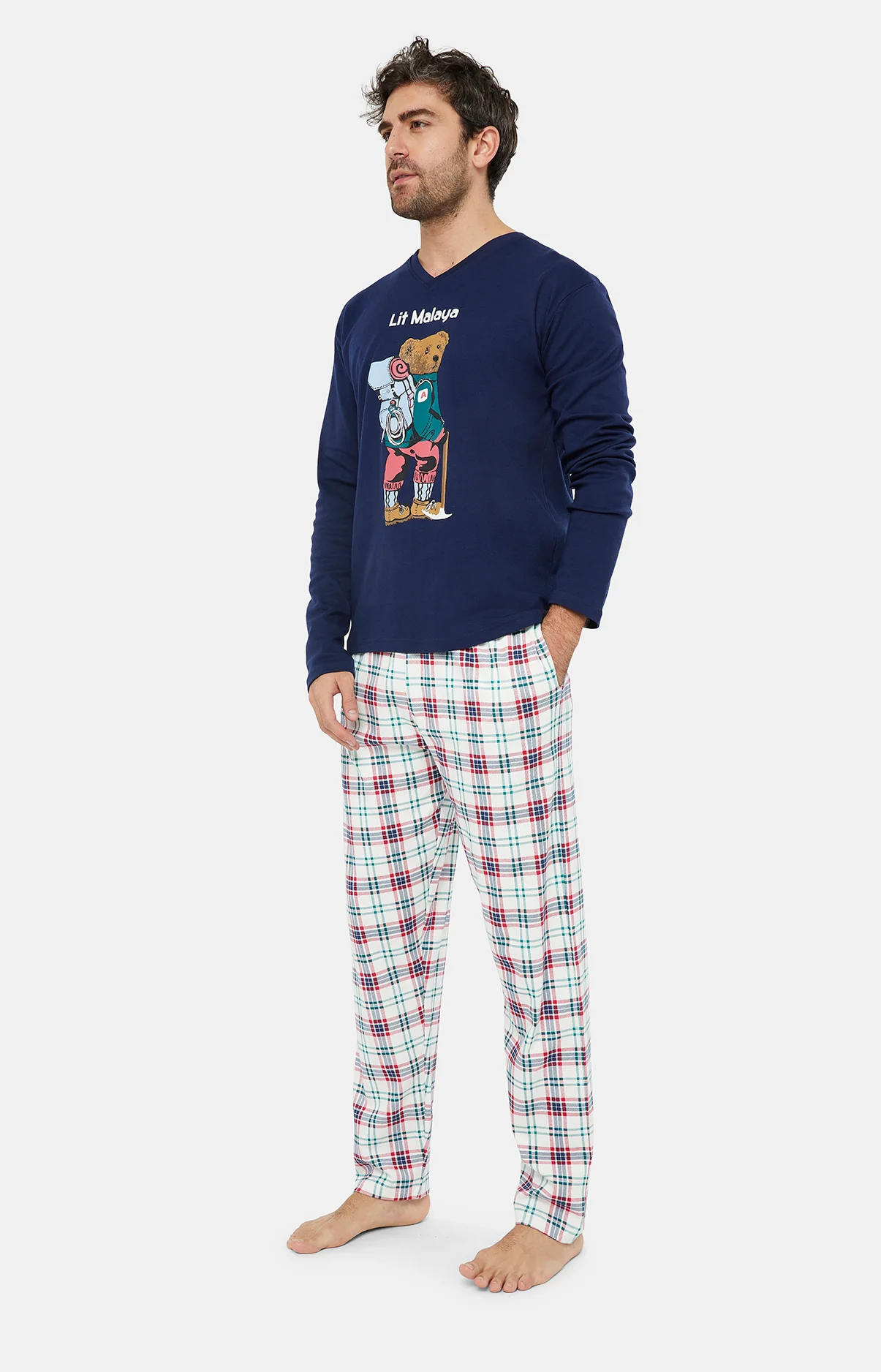 – Pyjama homme long en jersey de coton – Tee-shirt uni col V, manches longues – Pantalon élastiqué avec cordon de serrage – Motif exclusif créé à Paris – Confectionné dans nos ateliers partenaires en Inde