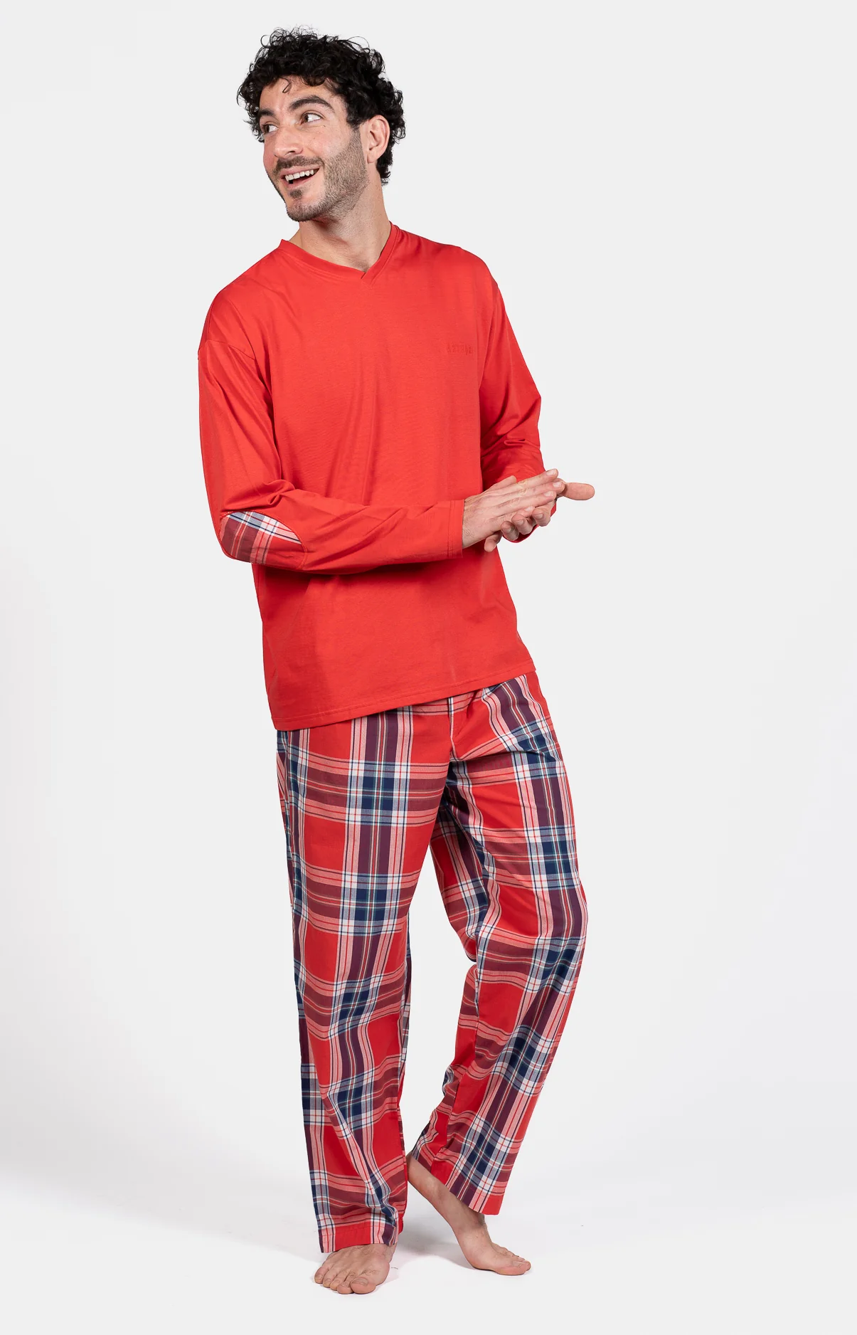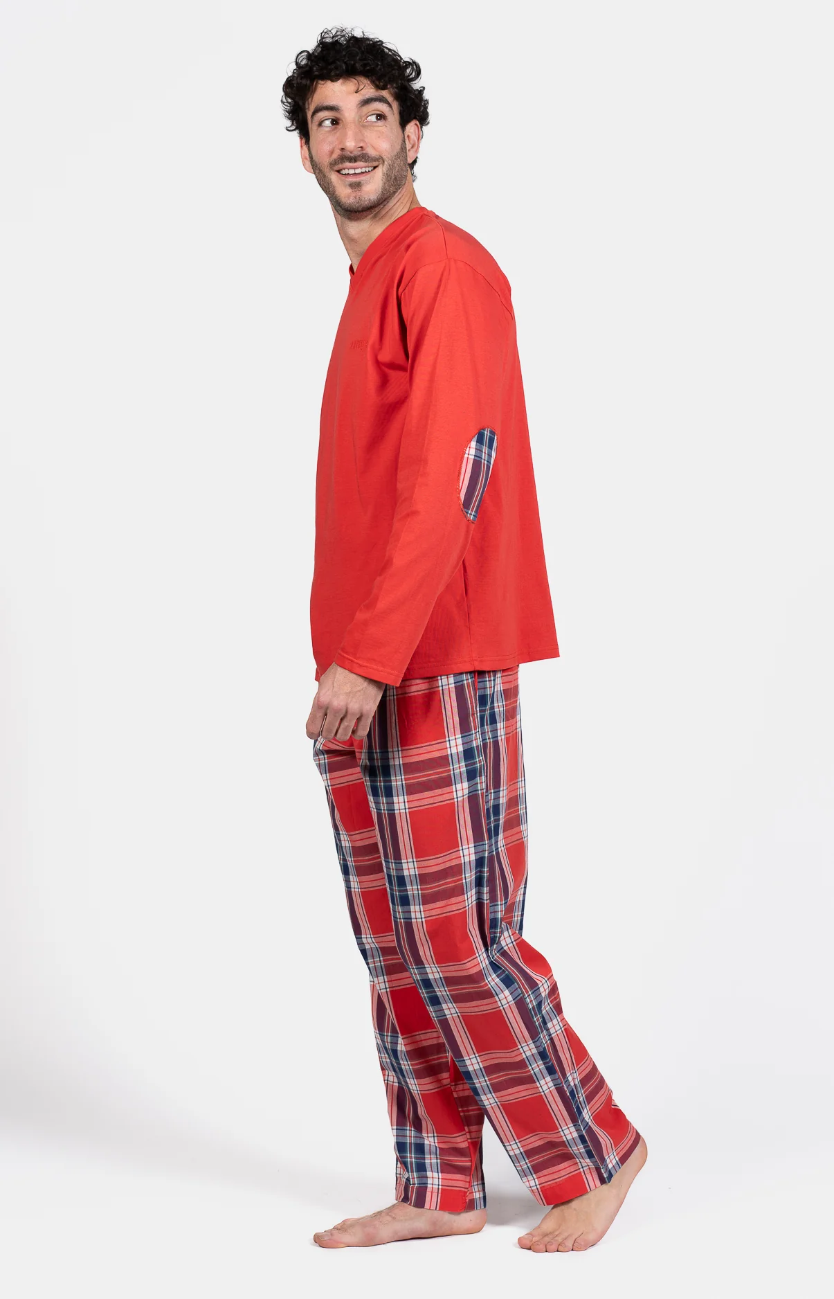 – Ensemble de Pyjama Homme – 100% coton – Tee-shirt uni manches longues, col V – Coudières contrastées – Pantalon de pyjama avec ceinture élastiquée, cordon de serrage et 2 poches côtés – Motif exclusif créé à Paris – Confectionné dans nos ateliers partenaires au Inde