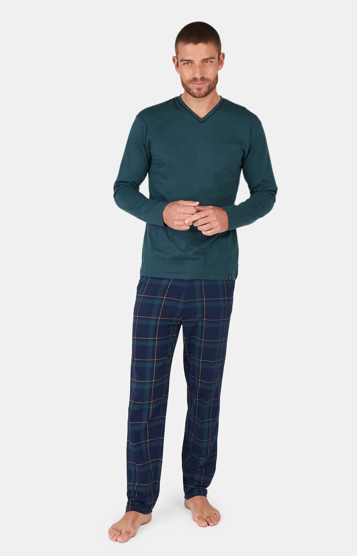 – Ensemble de pyjama Homme – 100% coton issu de l’agriculture biologique – Tee-shirt uni col V, manches longues, vert sapin– Pantalon de pyjama avec ceinture élastiquée, cordon de serrage et 2 poches côtés en bleu marine– Existe en pyjashort– Motif exclusif créé à Paris – Confectionné dans nos ateliers partenaires en Inde