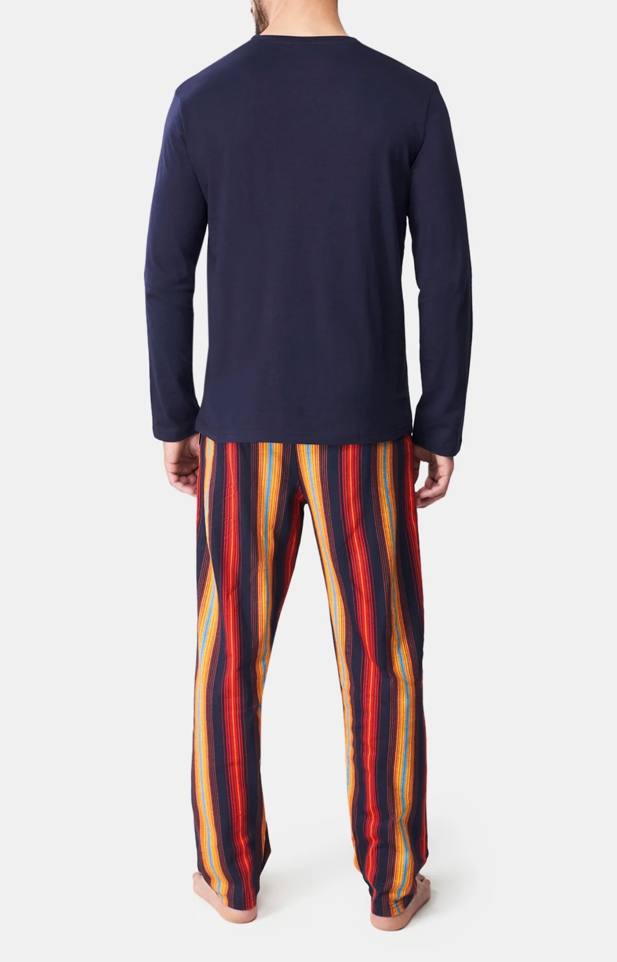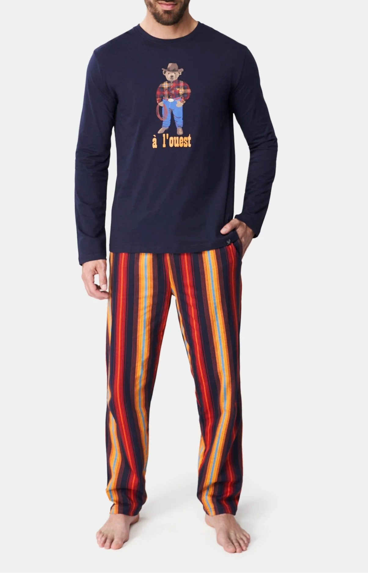 – Ensemble de pyjama Homme – 100% coton issu de l’agriculture biologique – Tee-shirt uni manches longues, col rond – Sérigraphie poitrine – Pantalon de pyjama avec ceinture élastiquée, cordon de serrage et 2 poches côtés – Motif exclusif créé à Paris – Confectionné dans nos ateliers partenaires en Inde