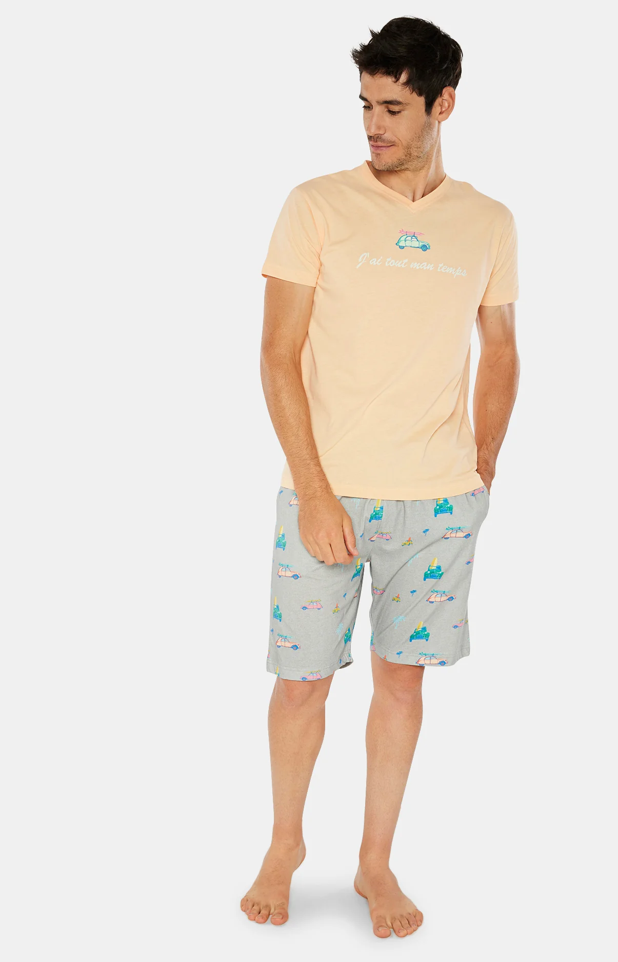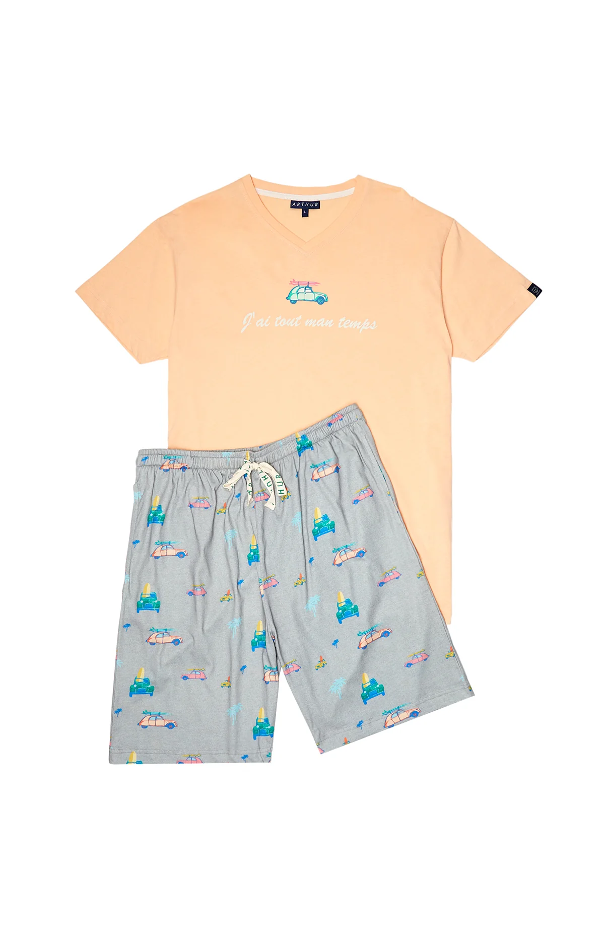 Arthur s’est de nouveau associé à Citroën afin de dessiner ce pyjama court CV, icône de la voiture française, mignonne et sympathique. Notre chère 2CV nationale revêt un petit air de Californie pour rivaliser avec les vans de surfers ! Ce pyjama homme aux couleurs acidulés et aux motifs décalés conviendra parfaitement aux plus audacieux qui savent lever le pied au bon moment. Son confort et ses finitions de premier choix feront passer des nuits parfaites pour tous les fans du charme intemporel de la 2CV et d’un rythme de vie au ralenti.
