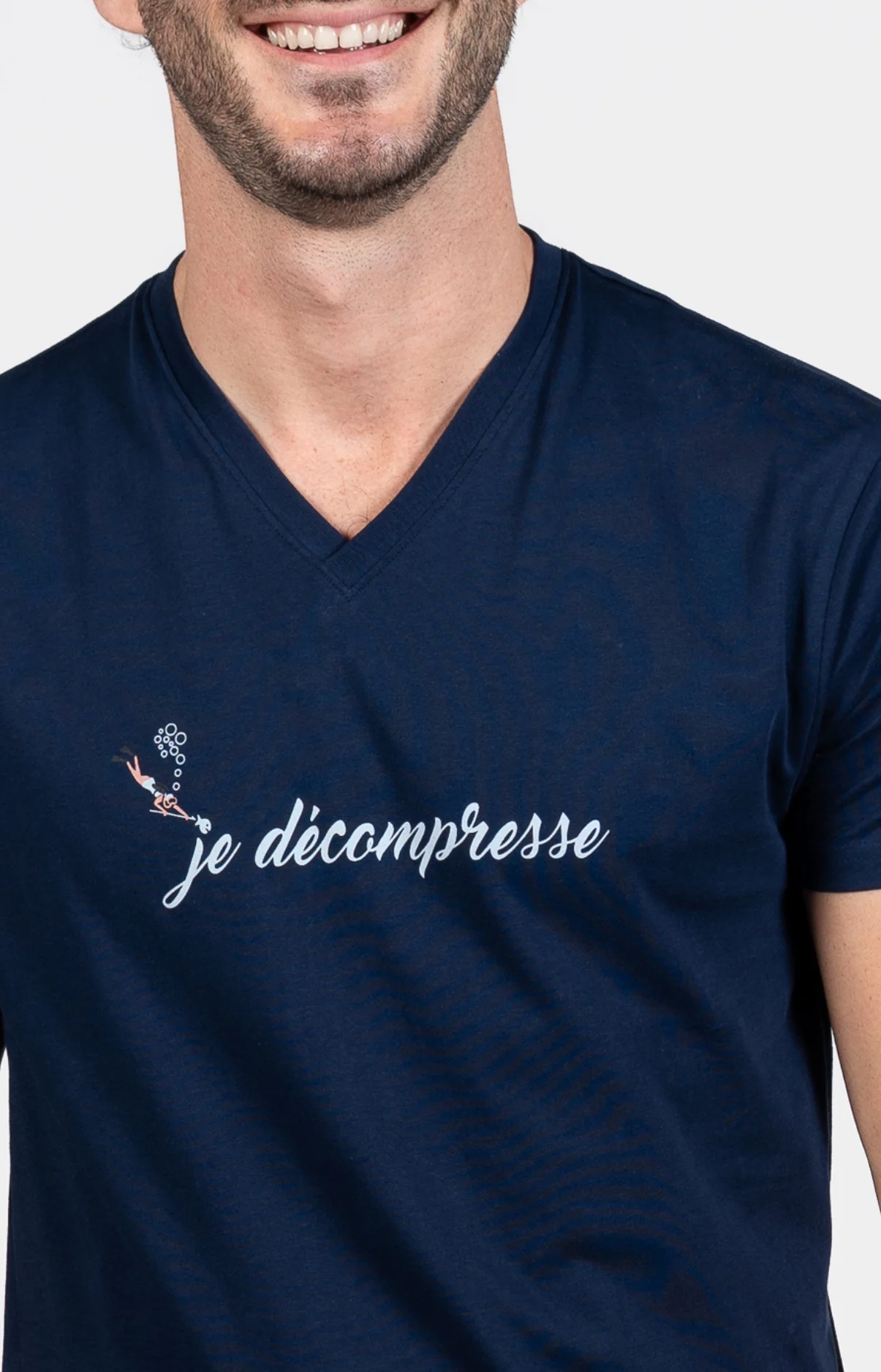 – Ensemble de Pyjama Homme – 100% coton – Tee-shirt uni, manches courtes et col V – Sérigraphie poitrine – Bas de pyjama avec ceinture élastiquée et cordon de serrage – 2 poches côtés – Motif exclusif créé à Paris – Confectionné dans nos ateliers partenaires en Inde