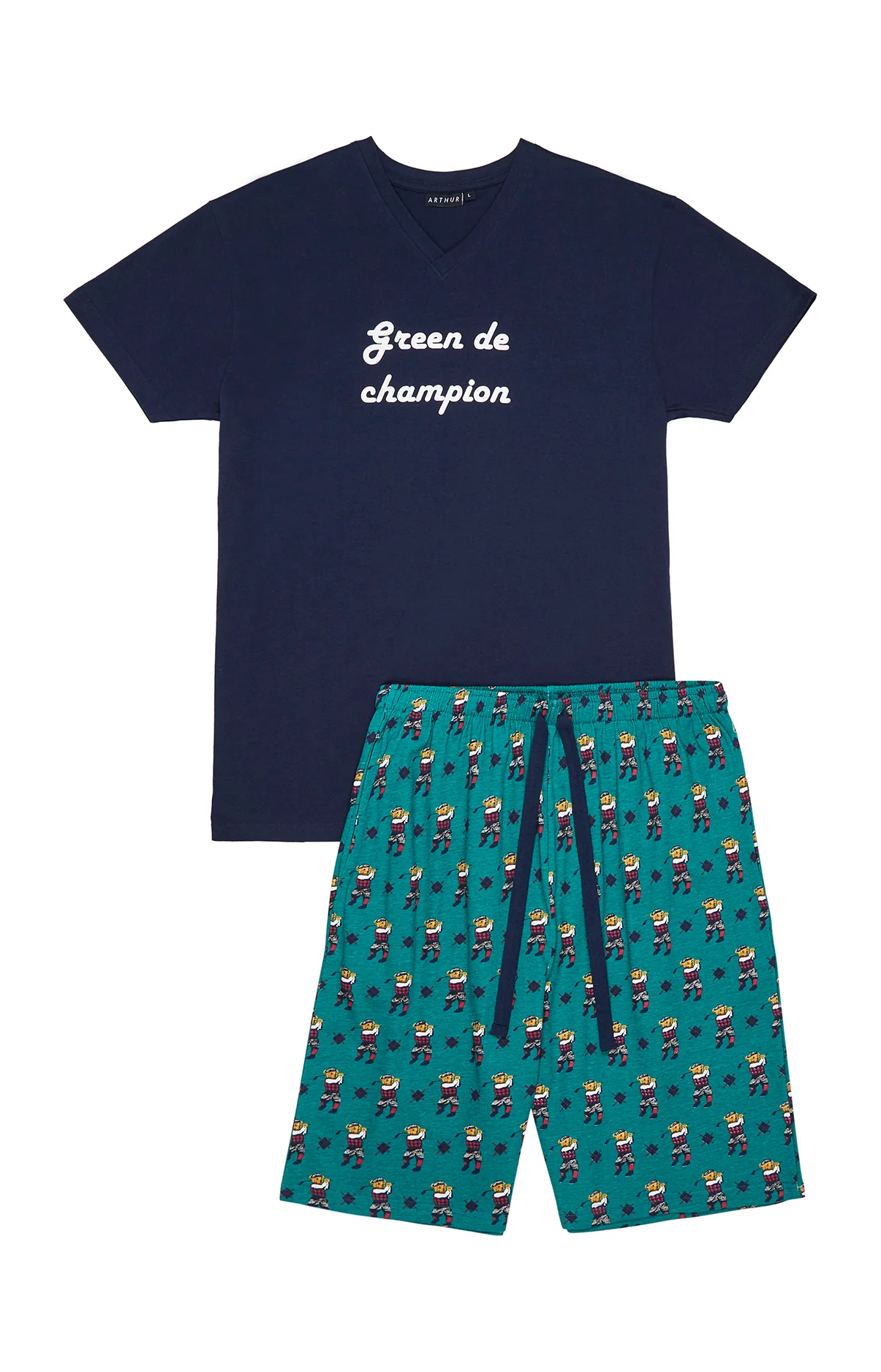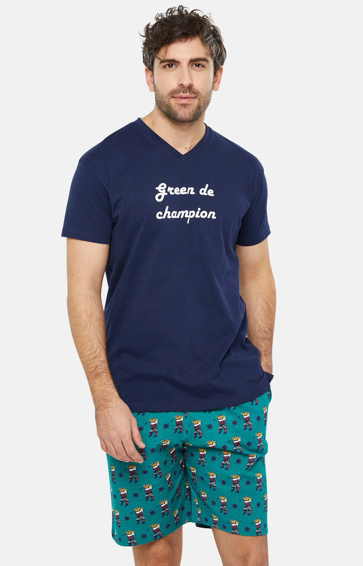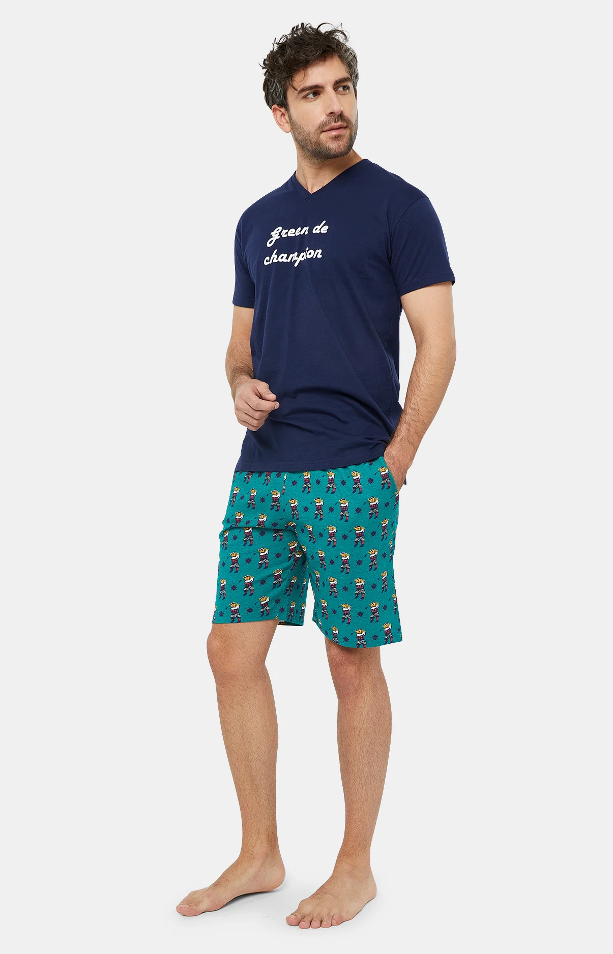 – Pyjama homme court en jersey de coton – Tee-shirt uni col V, manches courtes, sérigraphie poitrine – Pantalon élastiqué, 2 poches côtés et cordon de serrage – Motif exclusif créé à Paris – Confectionné dans nos ateliers partenaires en Inde
