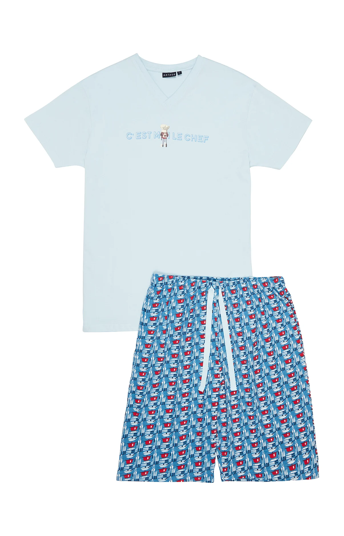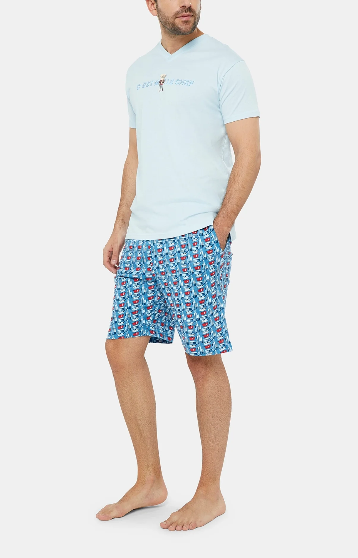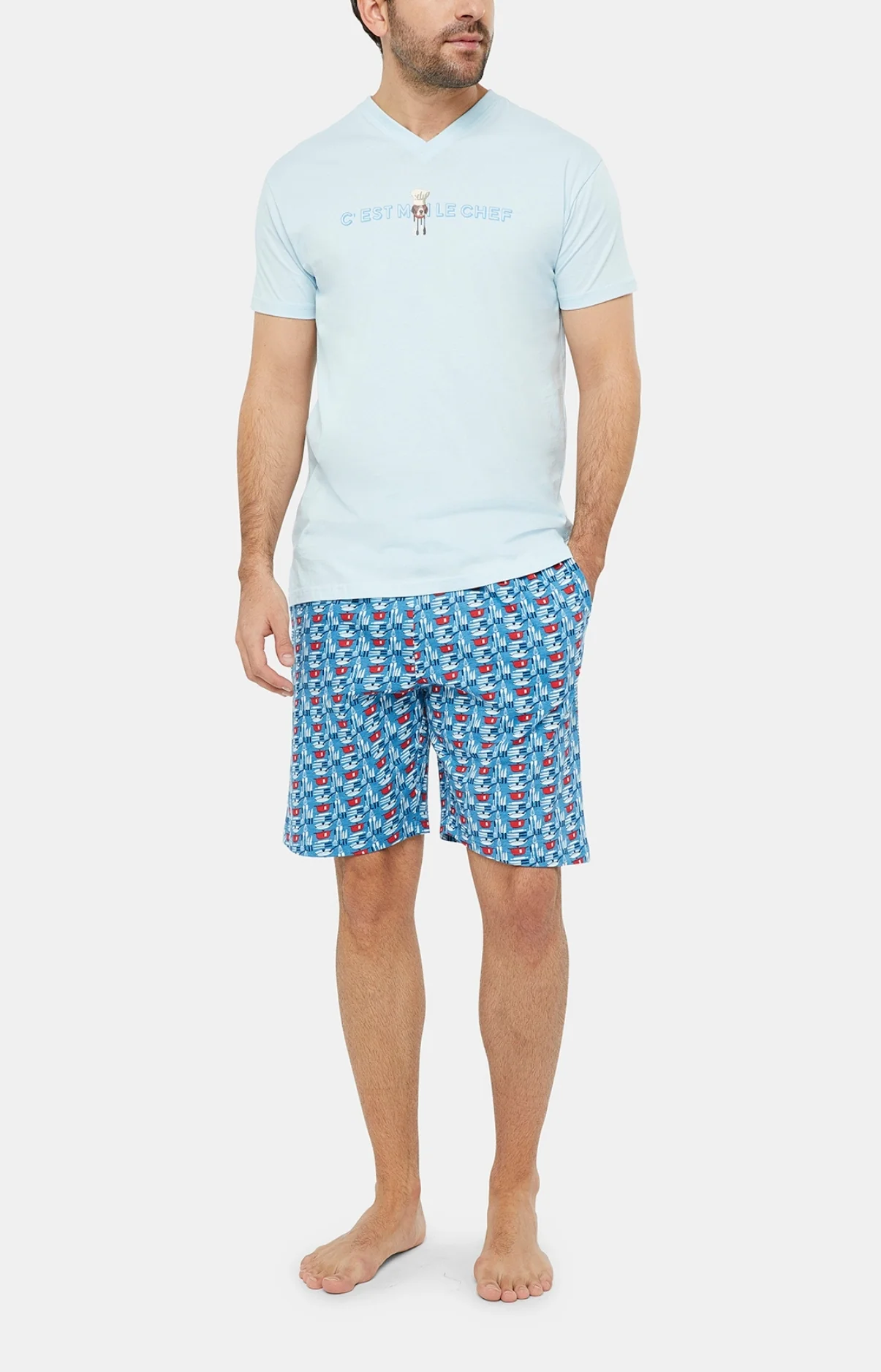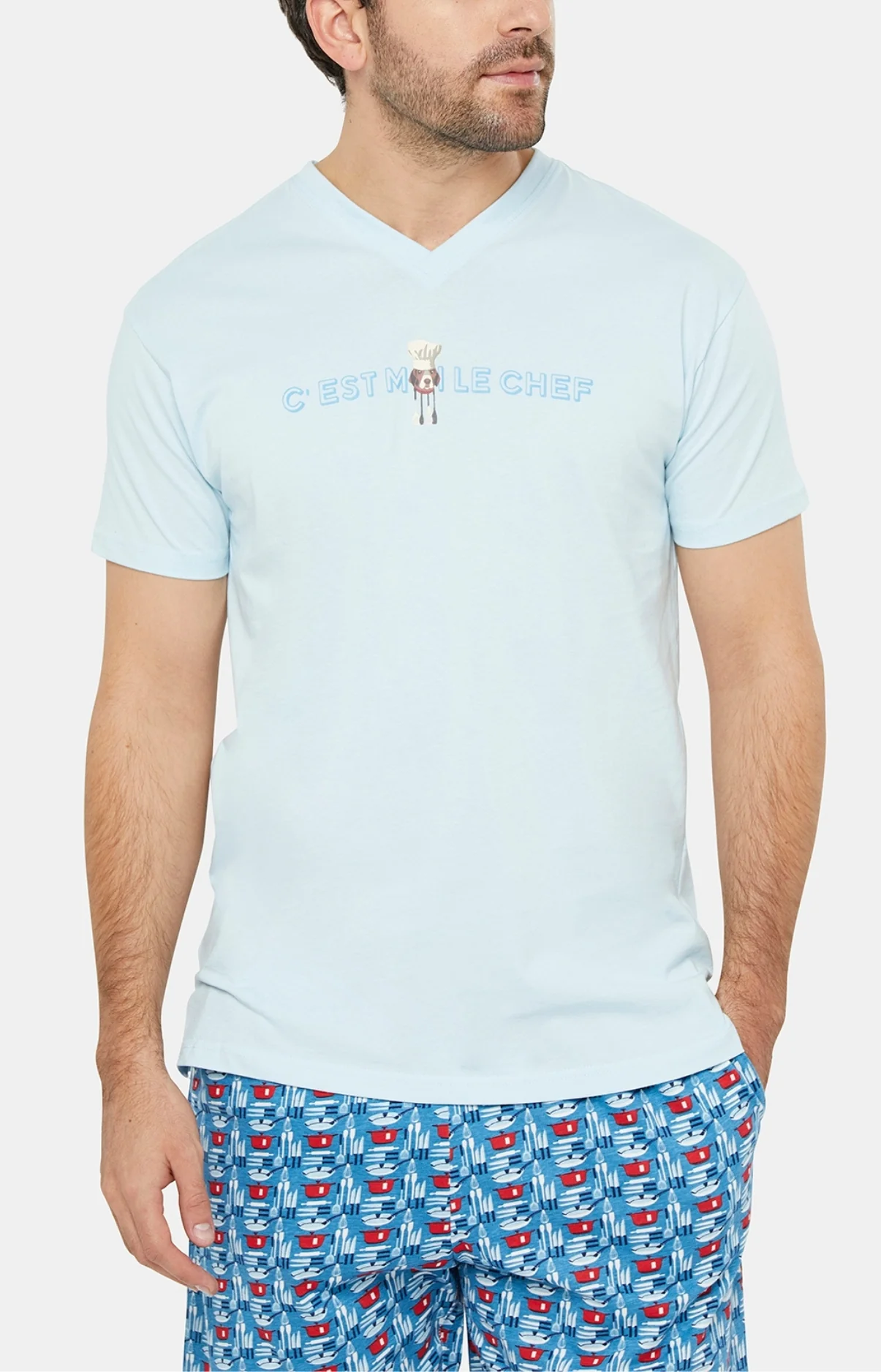 – Pyjama homme court en jersey de coton – Tee-shirt uni col V, manches courtes, sérigraphie poitrine – Pantalon élastiqué, 2 poches côtés et cordon de serrage – Motif exclusif créé à Paris – Confectionné dans nos ateliers partenaires en Inde