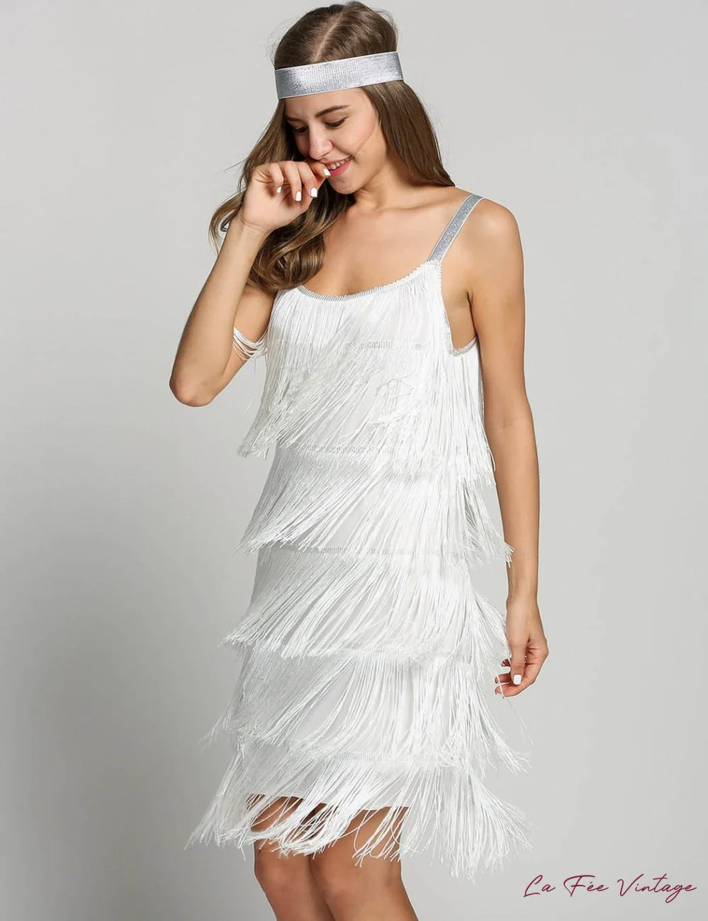 Que ce soit pour une soirée Gatsby, un cocktail ou un bal chic, cette robe blanche à franges pailletées vous assure un effet waouh dès votre entrée. Sa coupe fluide et ses franges dansantes captent la lumière à chaque mouvement, sublimant votre allure sans effort. Elle se décline en blanc, argenté ou noir pour s’adapter à votre style et à l’occasion.