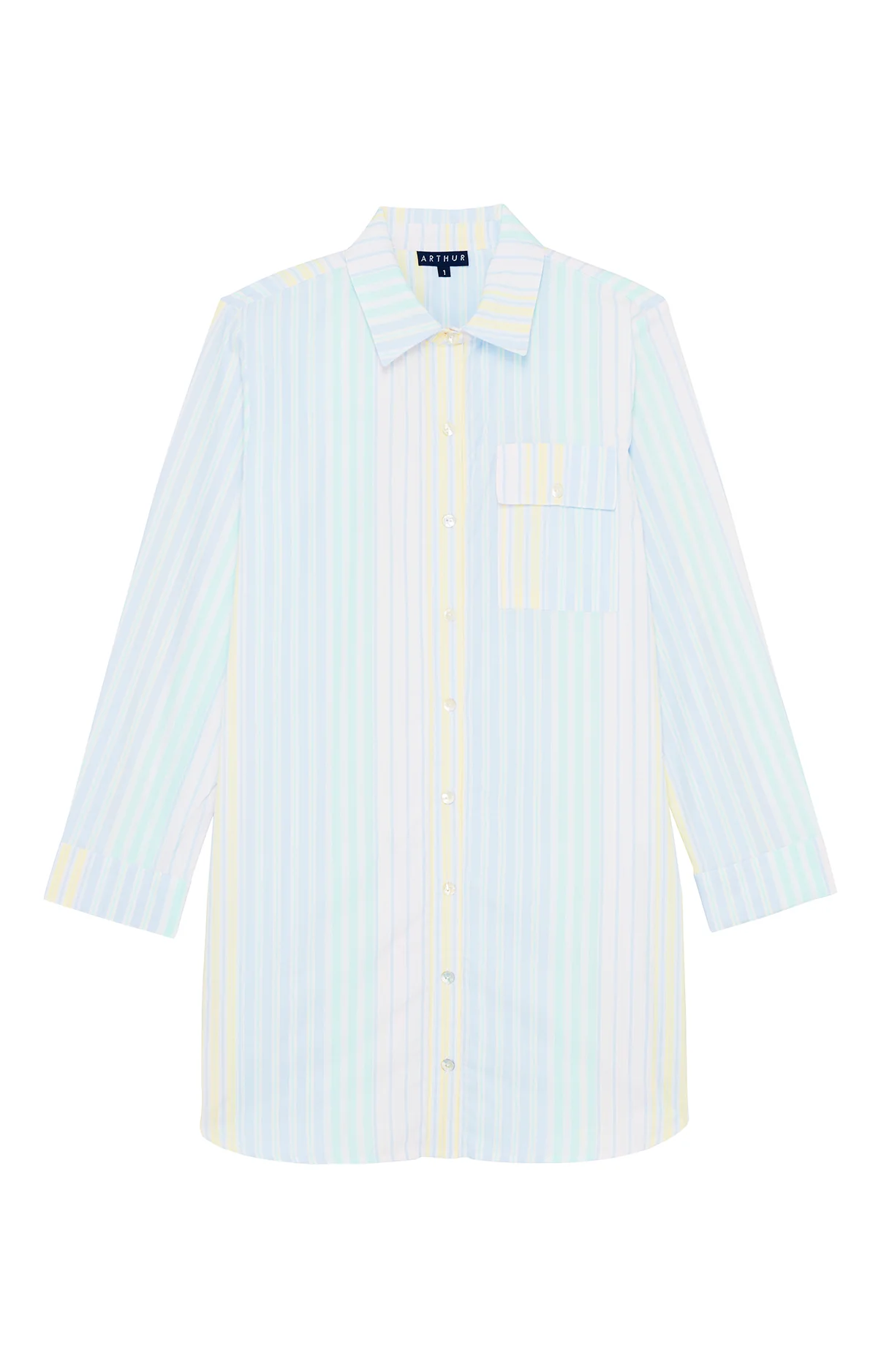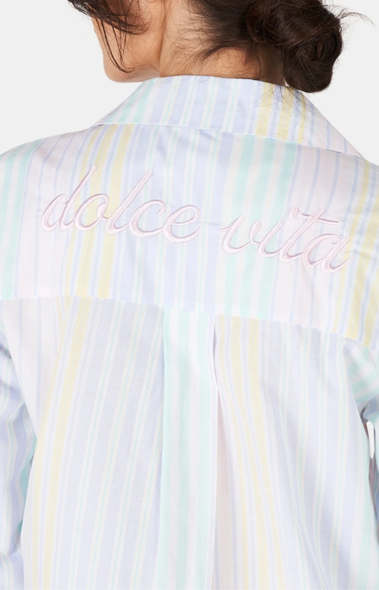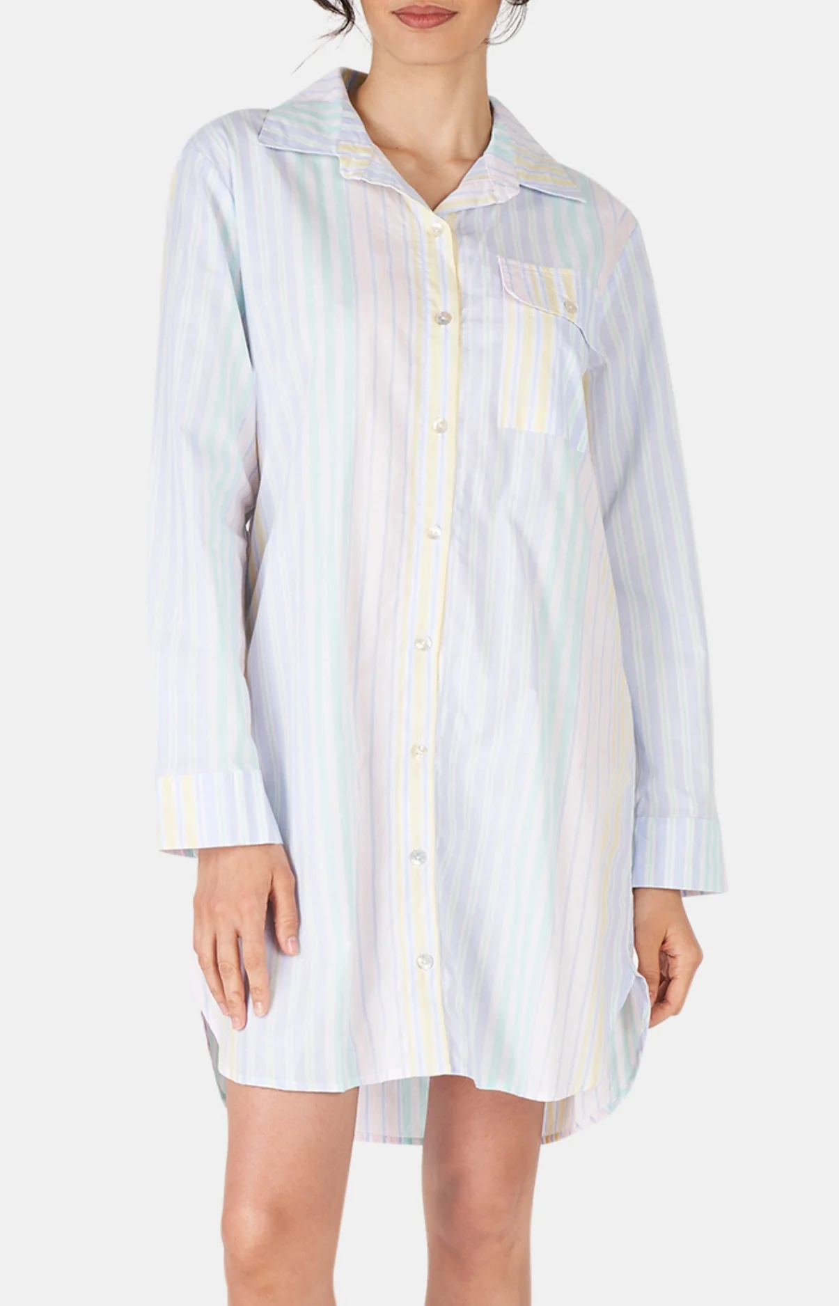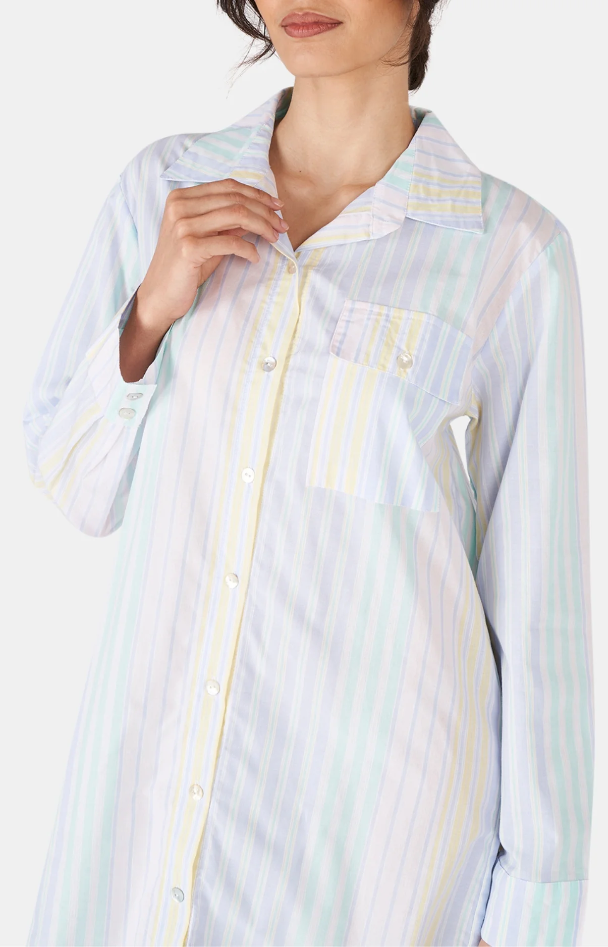 – Chemise de nuit femme ou robe chemise de plage – 100 % coton – Rayure fils teints en dégradé de pastels – Col chemise, manches longues, poche poitrine – Entièrement boutonnée avec boutons en nacre véritable – Finitions poignets chemise 2 boutons – Broderie au dos – Longueur environ 91 cm – Motif exclusif […]