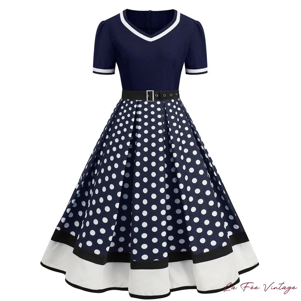 Vous voulez vous sentir aussi belle et élégante que le ciel ? La robe pin up blanche et bleue est faite pour vous ! Avec son col rabattu, elle sublimera vos formes et vous rendra féminine. Elle est ornée de petits pois et sa taille est serrée à la taille et part en évasée.
