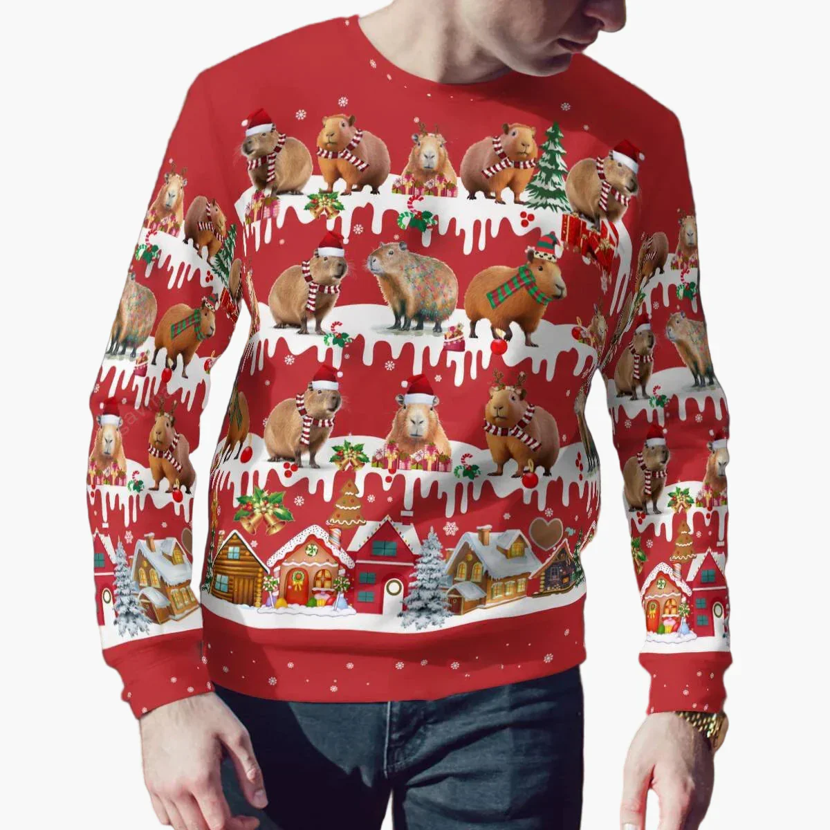 Optez pour l’originalité cet hiver avec ce sweat de Noël pour homme, orné d’adorables capybaras habillés pour les fêtes ! Parfait pour ajouter une touche d’humour et de chaleur à vos réunions familiales, soirées entre amis ou au bureau. Les motifs colorés de capybaras portant des bonnets de Noël, des écharpes et entourés de maisons de pain d’épices créent une ambiance festive et joyeuse. Ce pull allie confort et style décalé, idéal pour tous ceux qui souhaitent se démarquer lors des festivités de fin d’année. Ajoutez une dose de bonne humeur à votre garde-robe ou offrez-le en cadeau à un amateur d’animaux ou de pulls de Noël originaux.