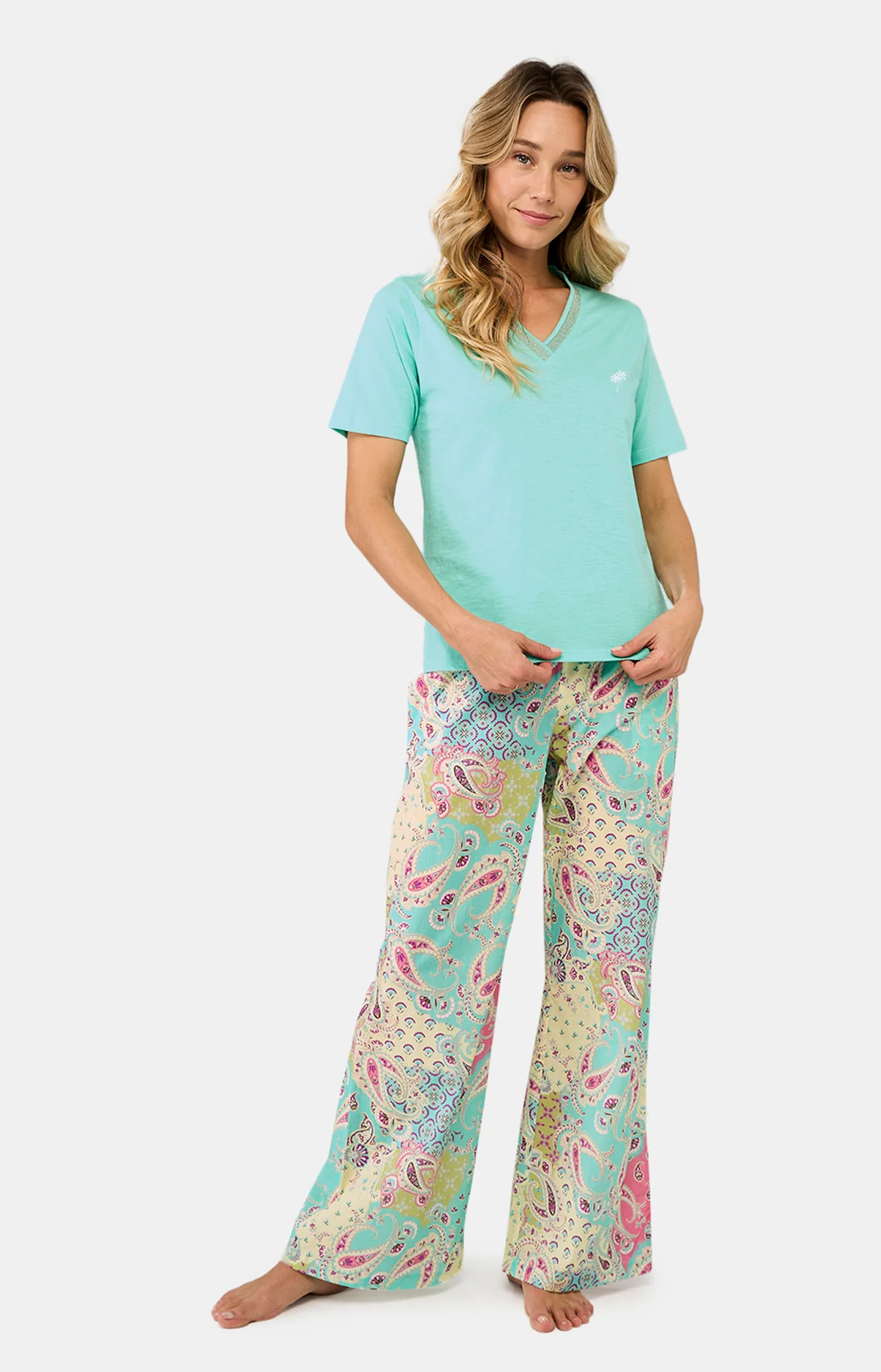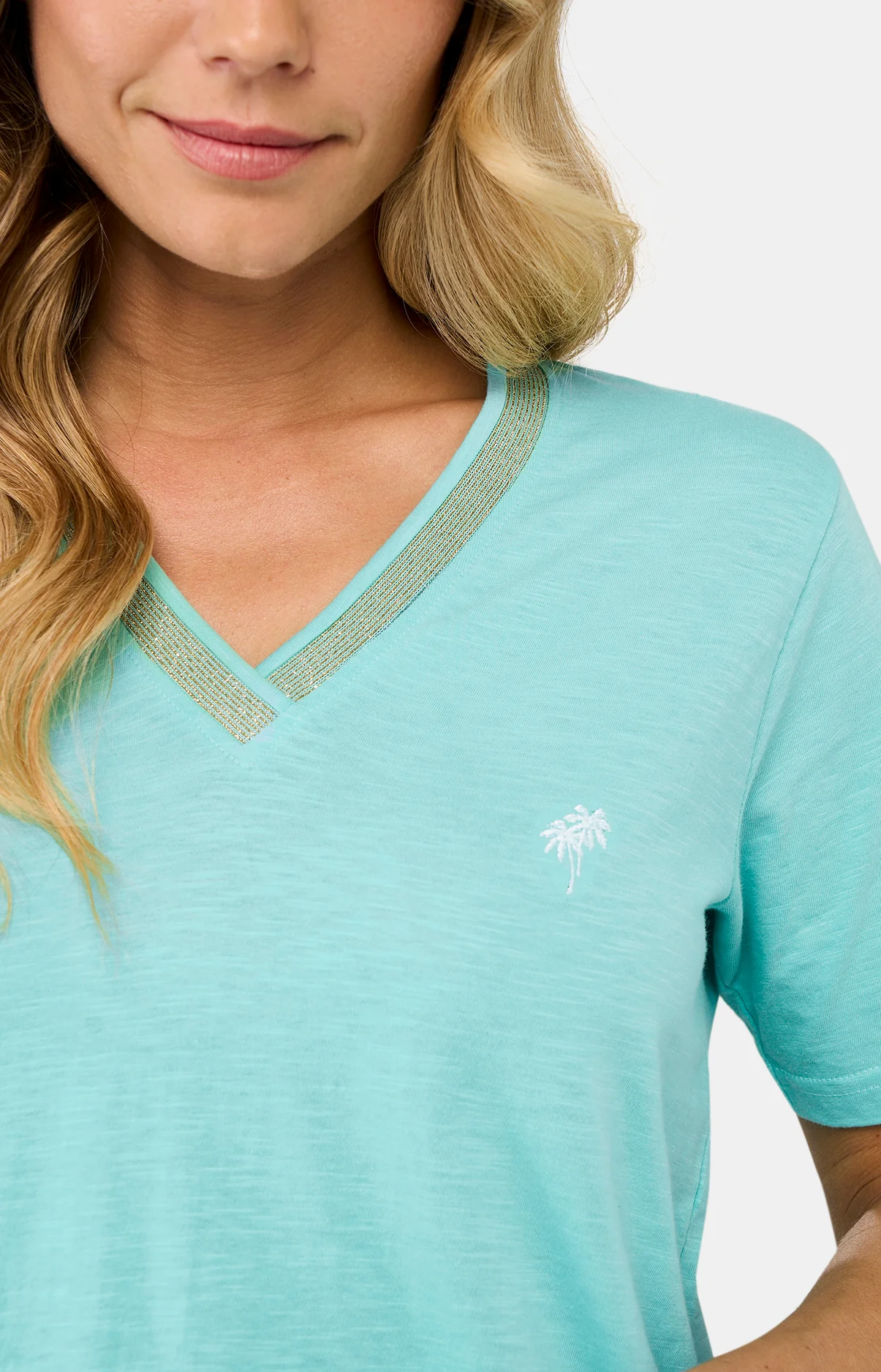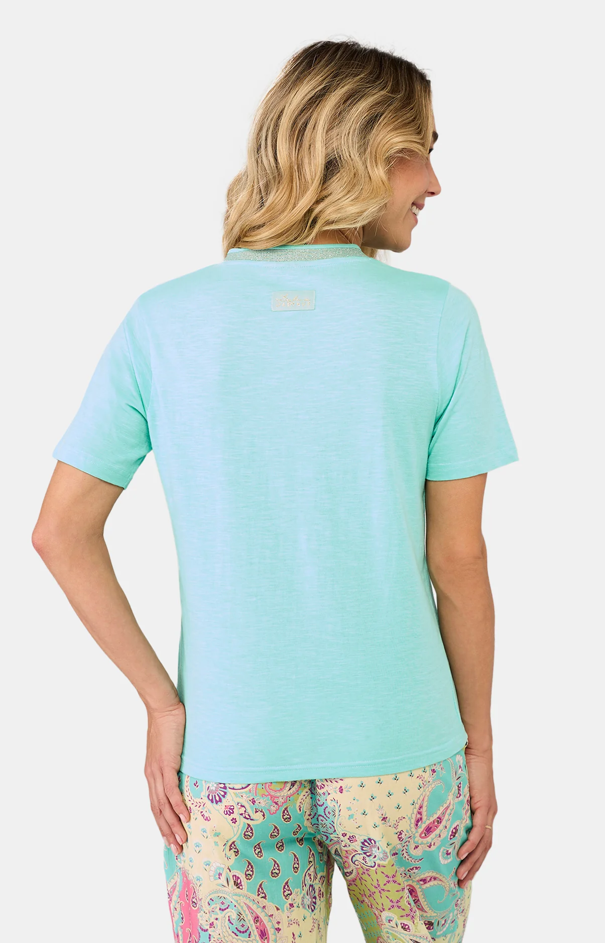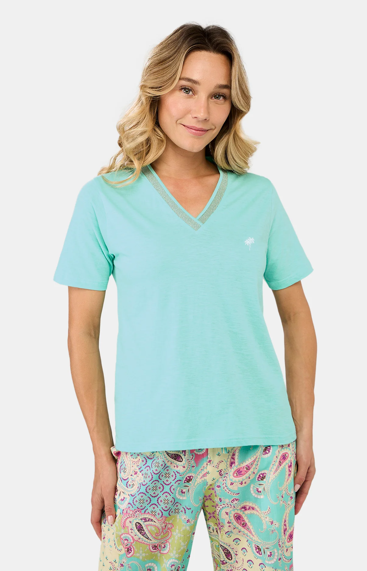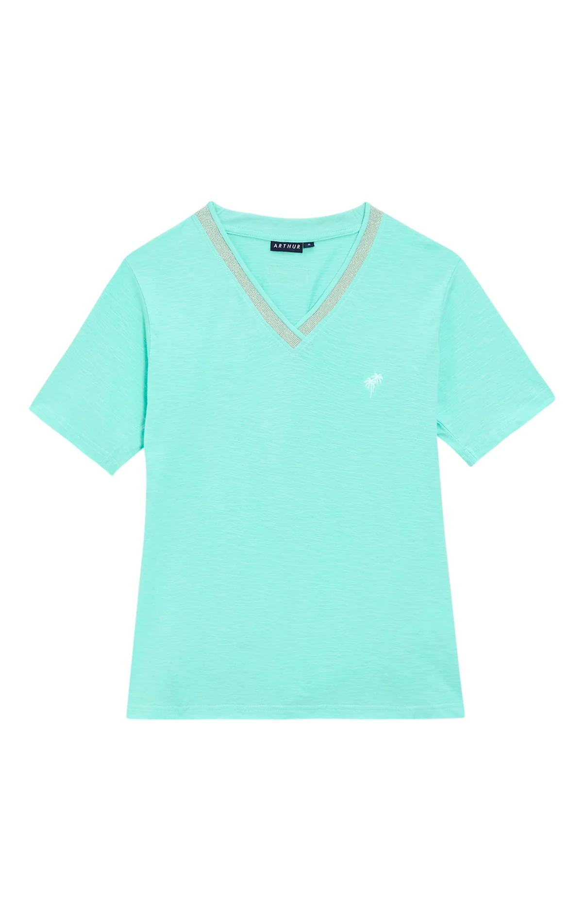 – Tee-shirt femme ou Haut de pyjama Femme – 100% coton flammé issu de l’agriculture biologique – Tee-shirt uni, manches courtes – Col V réhaussé d’une bande de fils pailletés – Petite broderie poitrine – Modèle exclusif créé à Paris – Confectionné dans nos ateliers partenaires en Inde