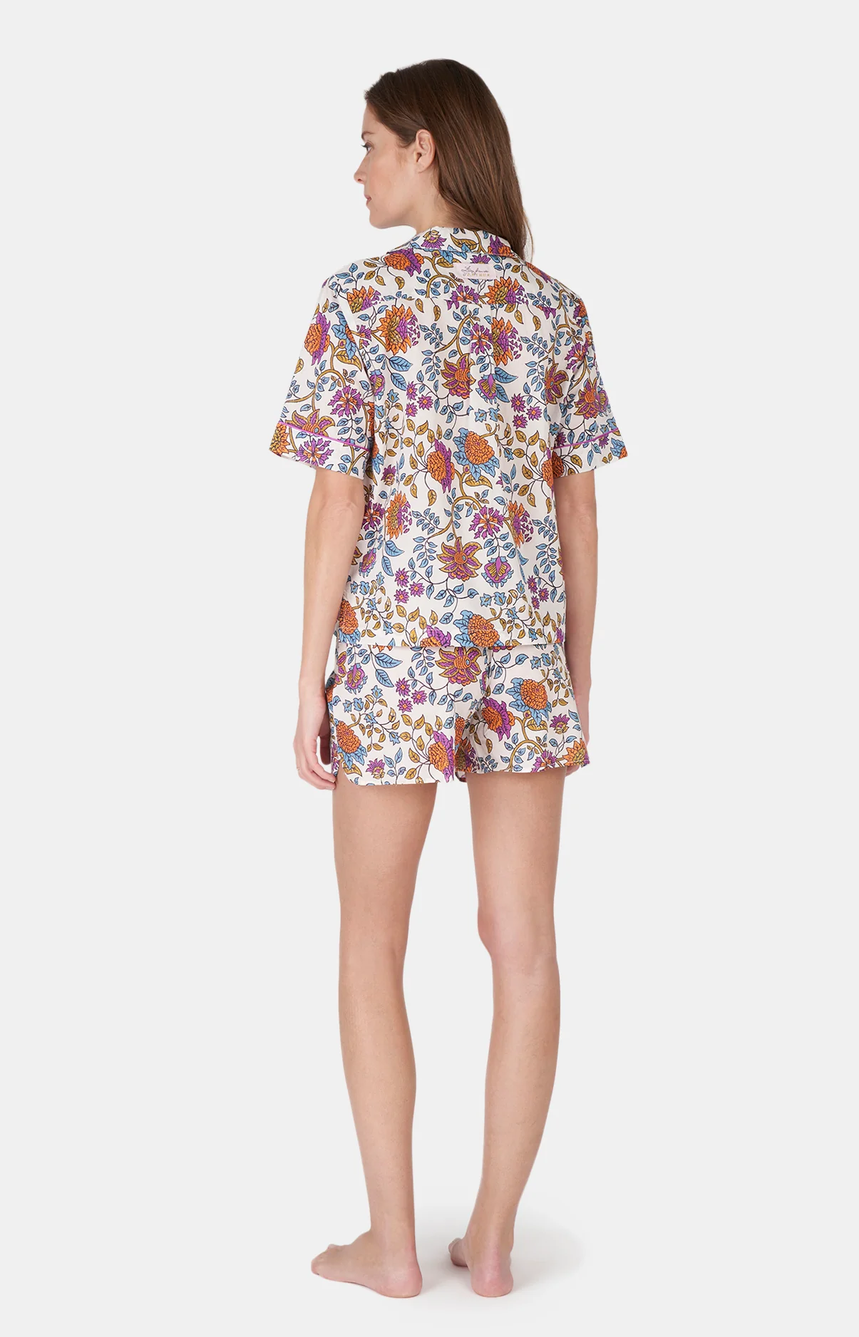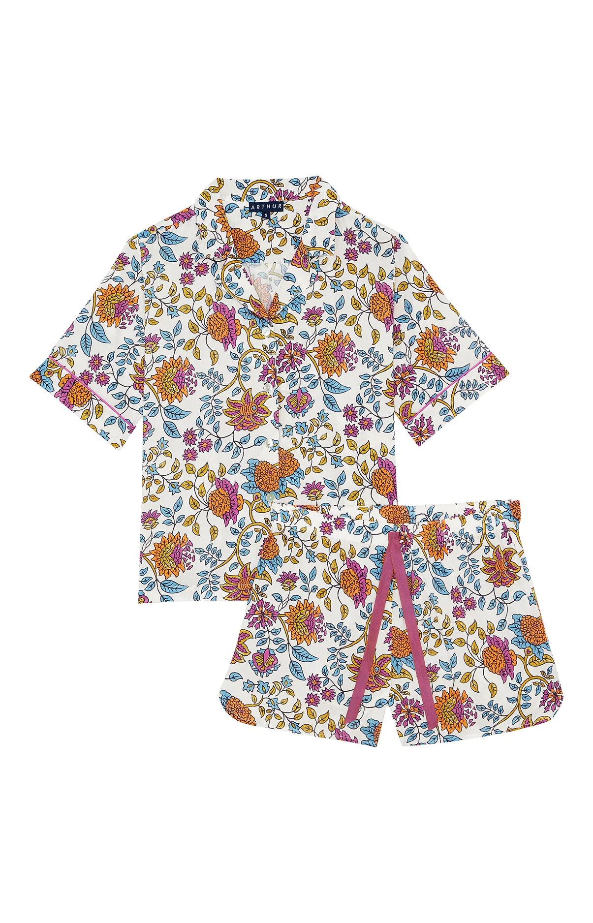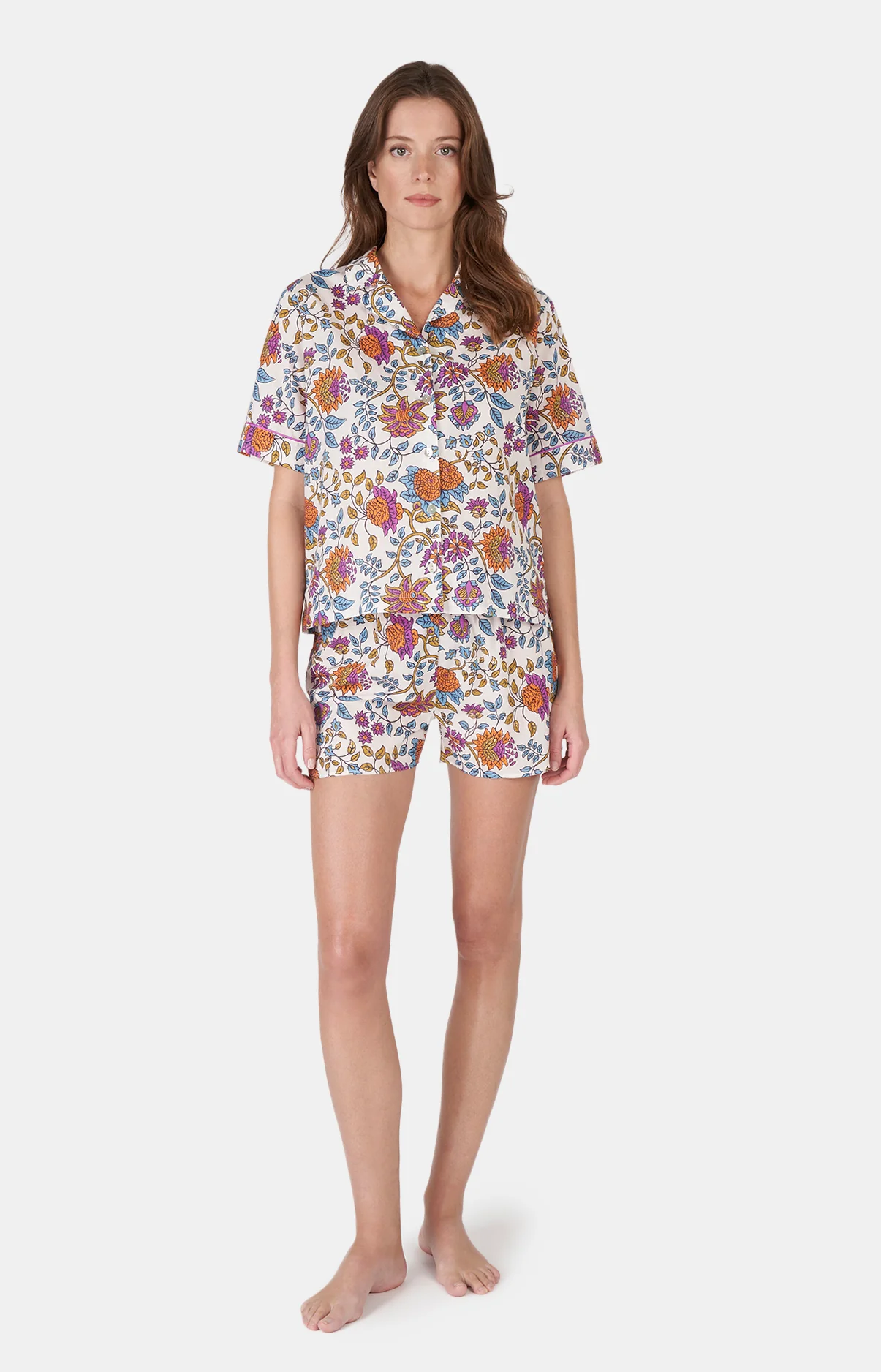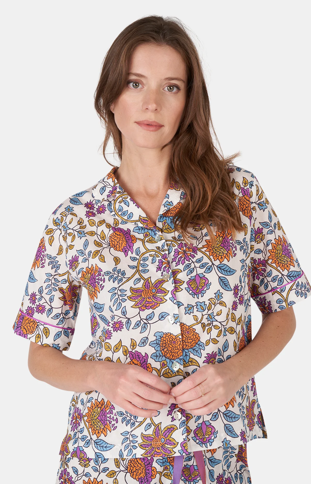 – Tenue d’été ou ensemble de pyjama femme – 100% voile de coton – Chemise boutonnée, col tailleur – Manches courtes, finitions passepoilés – Short élastiqué avec cordon de serrage – Motif exclusif créé à Paris – Confectionné dans nos ateliers partenaires au Maroc