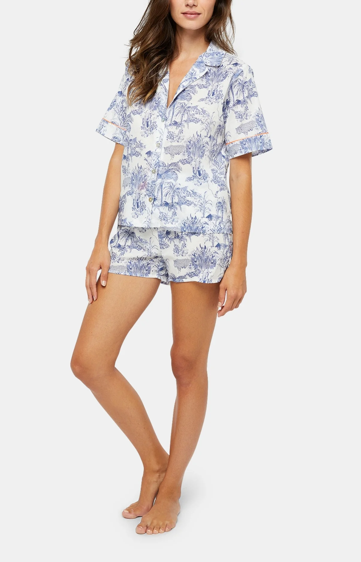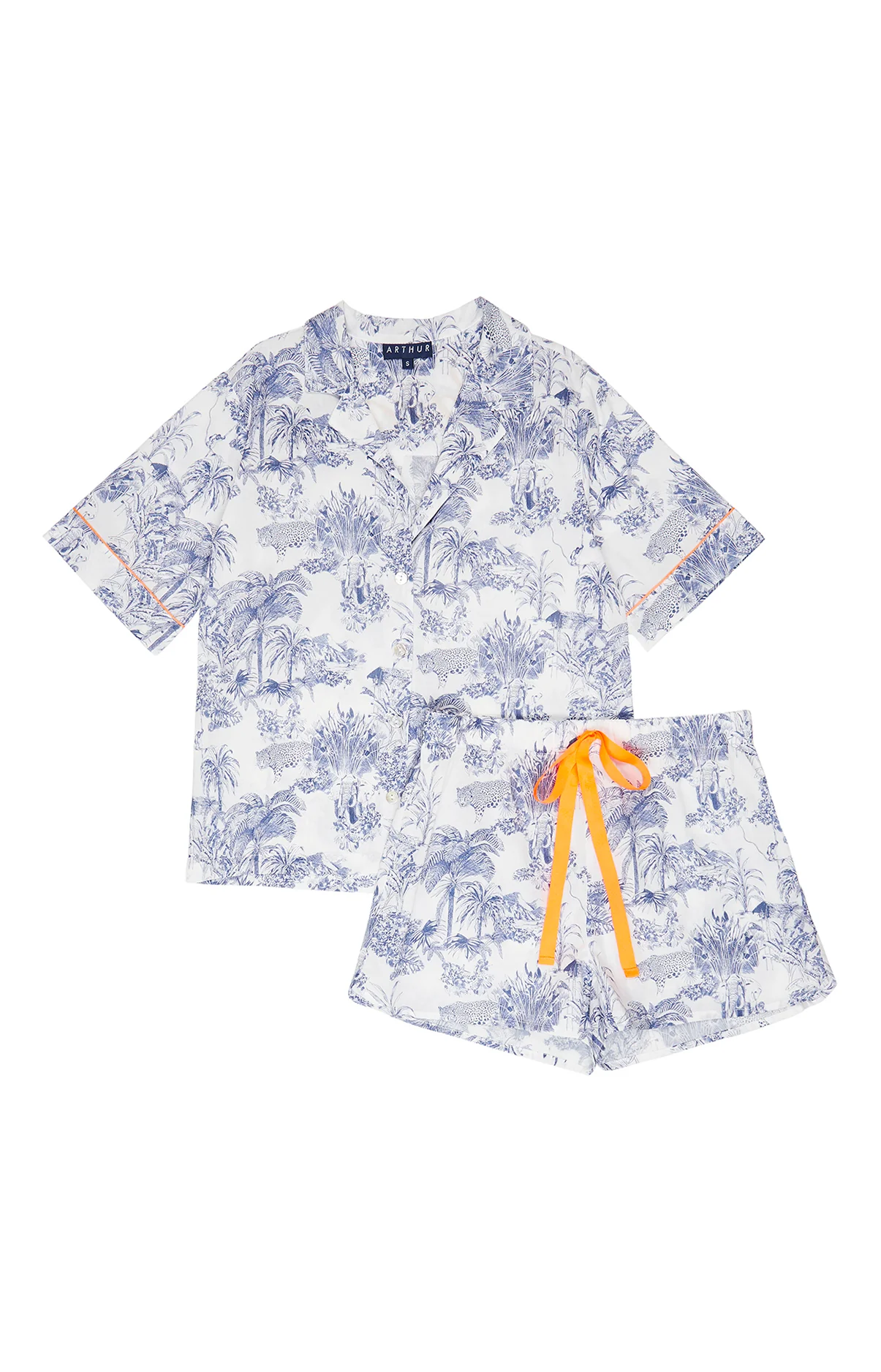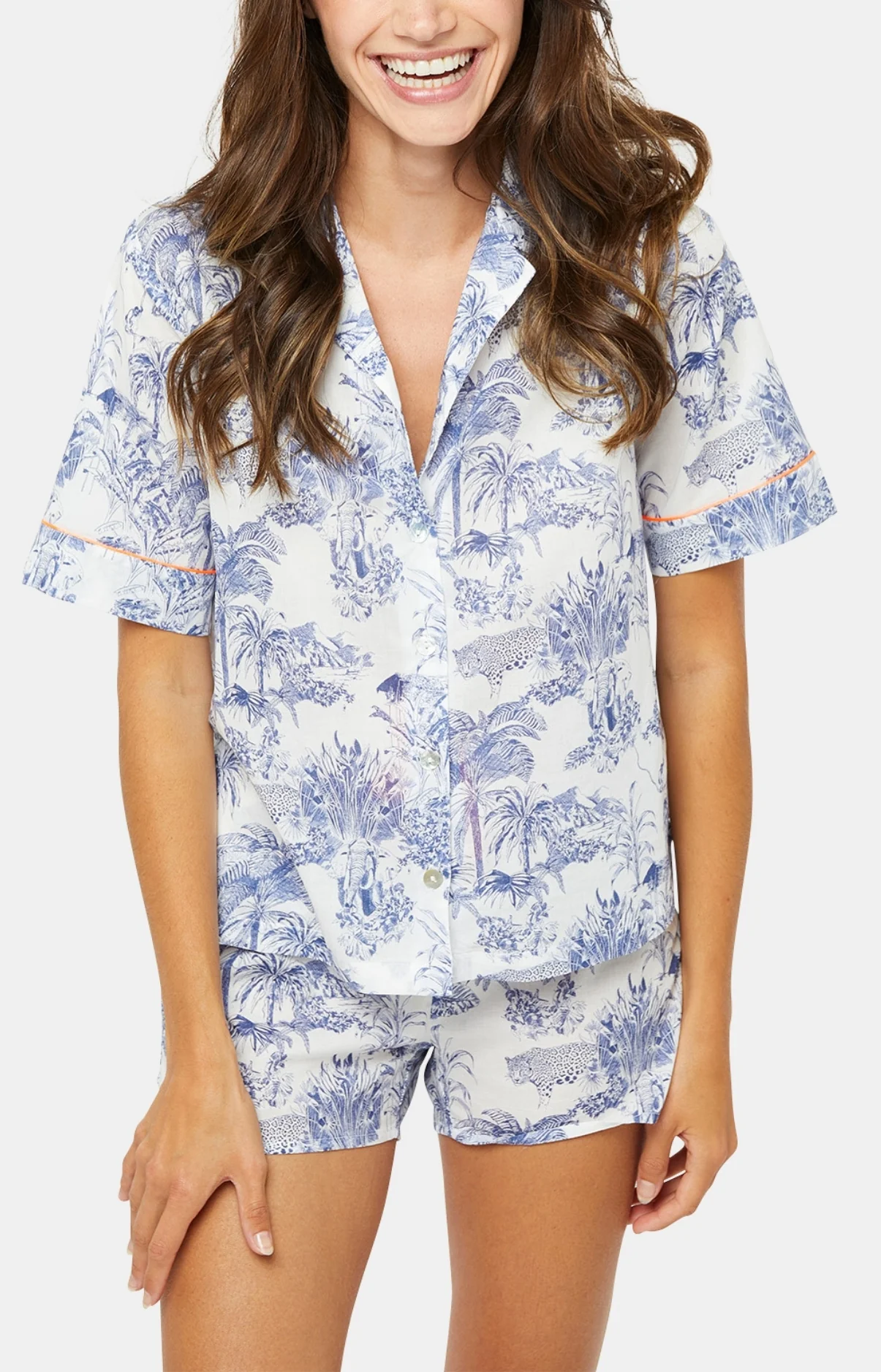 – Tenue d’été ou ensemble de pyjama femme – Esprit Toile de Jouy – 100 % satin de coton issu de l’agriculture biologique – Chemise boutonnée, col tailleur – Manches courtes, finitions passepoilés orange fluo – Short élastiqué avec cordon de serrage – Confectionné dans nos ateliers partenaires au Maroc